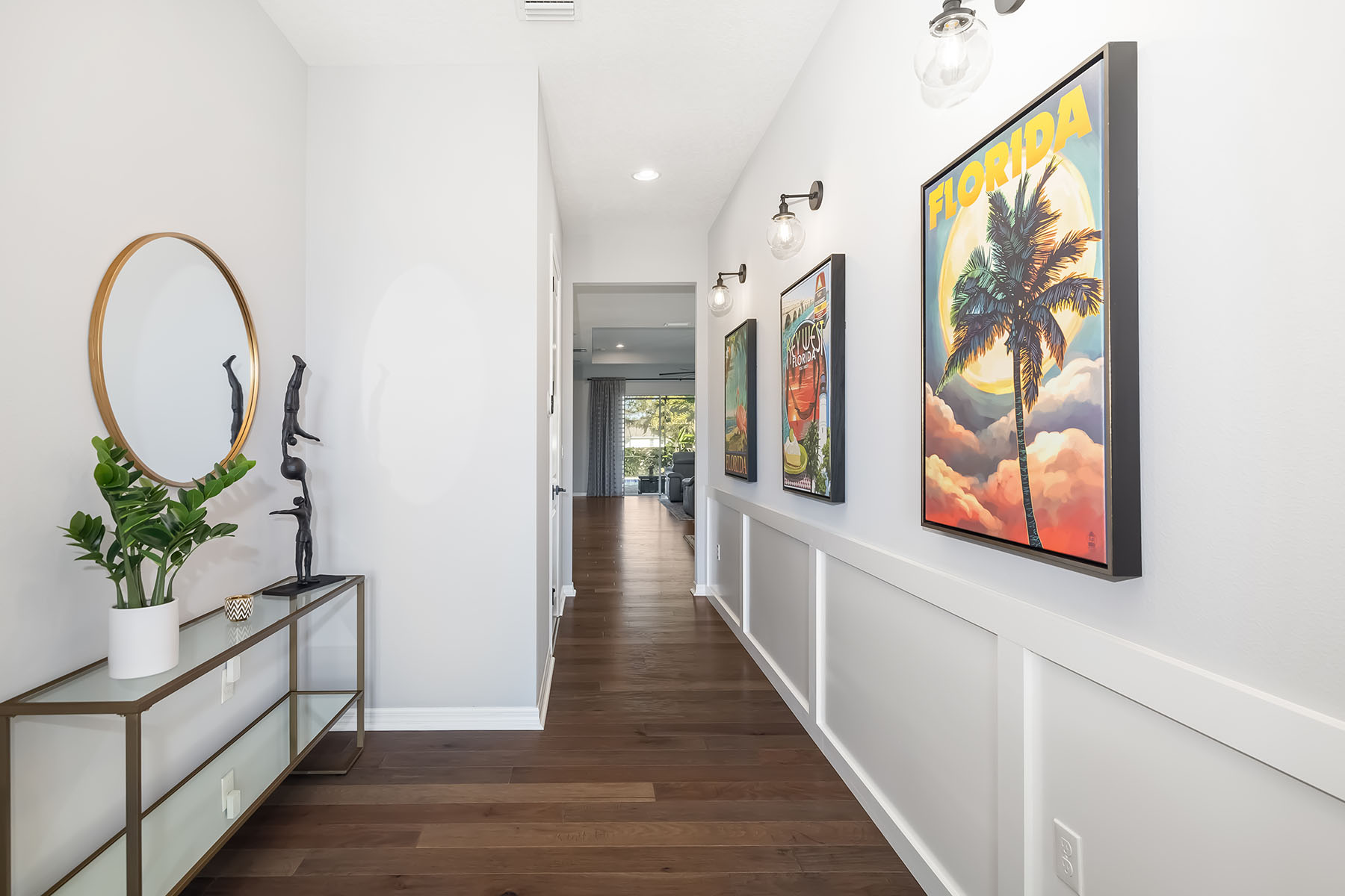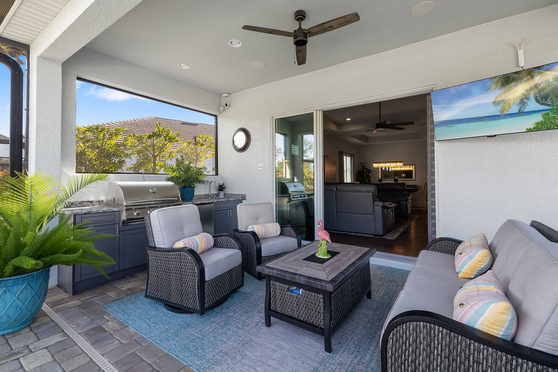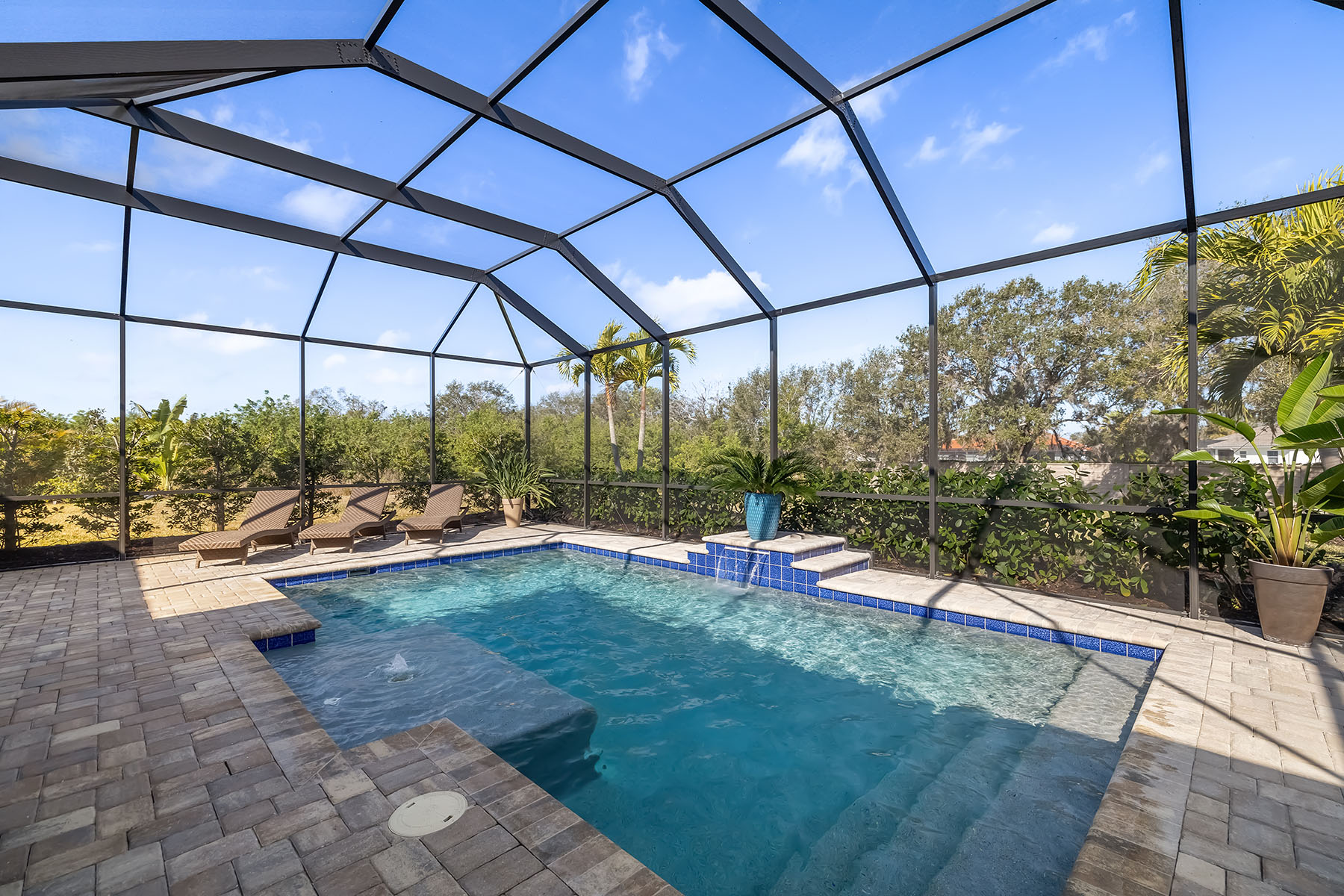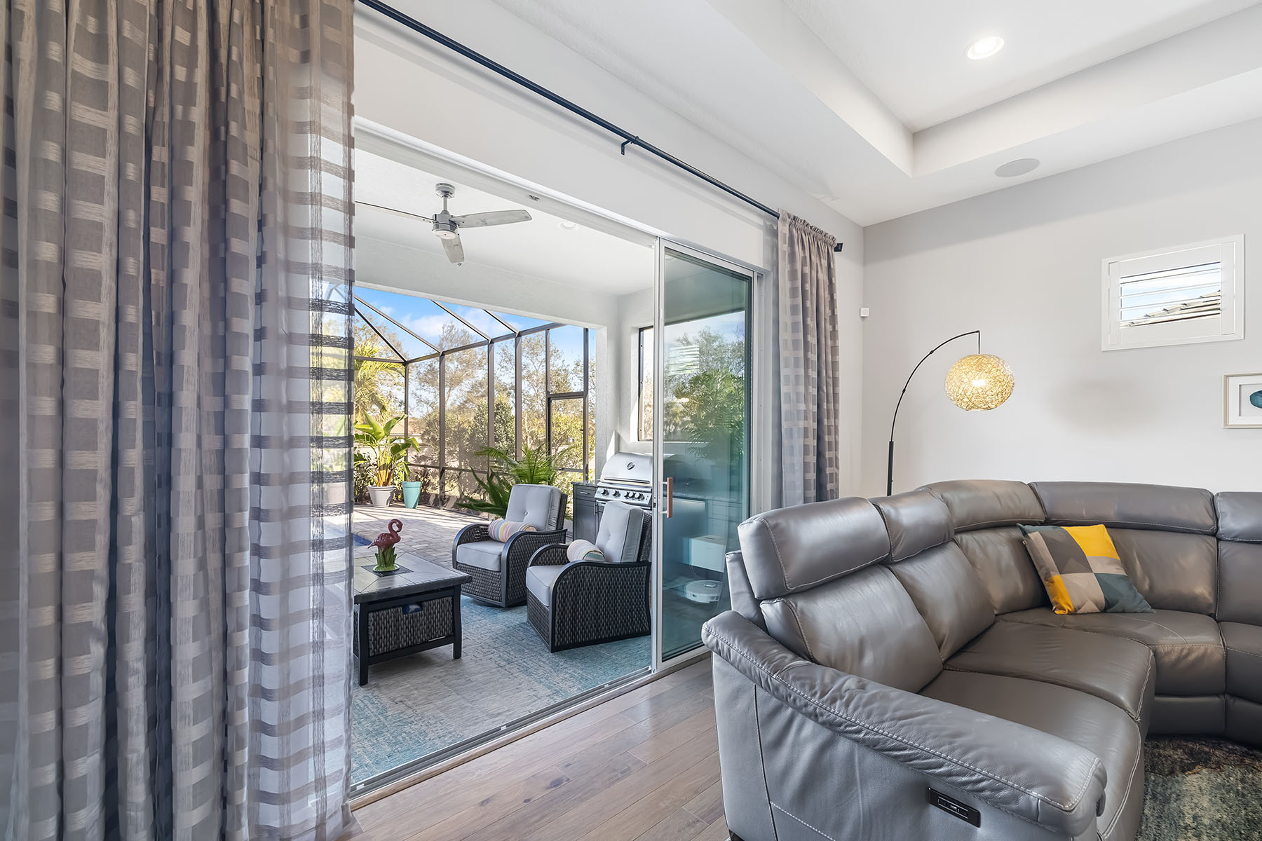This stunning 2021-built single-story pool home is in an exclusive gated enclave of 30 residences, offering maintenance-free lawn care with low HOA fees and no CDD. Perfectly positioned on a private 0.36-acre cul-de-sac lot with no rear neighbors, this meticulously maintained four-bedroom, 2.5-bath home delivers the ideal blend of luxury, comfort and modern convenience. Inside, an open-concept design showcases soaring tray ceilings, recessed LED lighting and rich hardwood flooring throughout. The great room serves as a striking focal point, featuring a sleek electric fireplace with customizable lighting and a built-in surround sound system, with integrated speakers extending throughout the home and lanai for seamless indoor-outdoor living. Expansive triple sliding glass doors open to the screened lanai, creating an effortless connection to the outdoor space. The gourmet kitchen is both elegant and functional, featuring upgraded soft-close cabinetry, quartz countertops, a designer tile backsplash, and a spacious center island with counter-height seating and custom pendant lighting. A stylish dry bar with a beverage refrigerator enhances the space, while premium Samsung smart black stainless-steel appliances, including a gas cooktop with a vented hood, a built-in convection wall oven with a Flex Duo divider and a steam cooking and convection microwave, complete this chef-inspired kitchen. The private primary suite offers a peaceful retreat with an 11-foot tray ceiling, plantation shutters and two custom walk-in closets. The spa-like en-suite bath features a dual quartz vanity, an expansive double walk-in shower with frameless glass, and modern matte black fixtures. Secondary bedrooms are generously sized, each with 10-foot ceilings, plantation shutters, ceiling fans and in-ceiling speakers with individual controls. A well-appointed laundry room includes custom cabinetry, quartz countertops, a deep utility sink and a subway tile backsplash. Outdoor living is exceptional, featuring a covered and screened lanai with paver decking that opens to a heated saltwater pool, complete with a sun shelf, color-changing LED lighting, a waterfall and a bubbling fountain, all conveniently controlled from your smartphone. The custom summer kitchen is ideal for entertaining, offering marine-grade cabinetry, granite countertops, a gas grill, sink and a beverage refrigerator. Additional upgrades include smart home technology with a Ring doorbell and security, keyless entry, and Z-wave lighting; a two-car garage with epoxy flooring, built-in storage and an EV charging outlet; a whole-house water softener; and a tankless gas water heater. With HOA services covering lawn care, irrigation, cable, and high-speed internet, this home offers an effortless, luxury lifestyle. Don't miss the opportunity to own this exceptional, like-new residence.