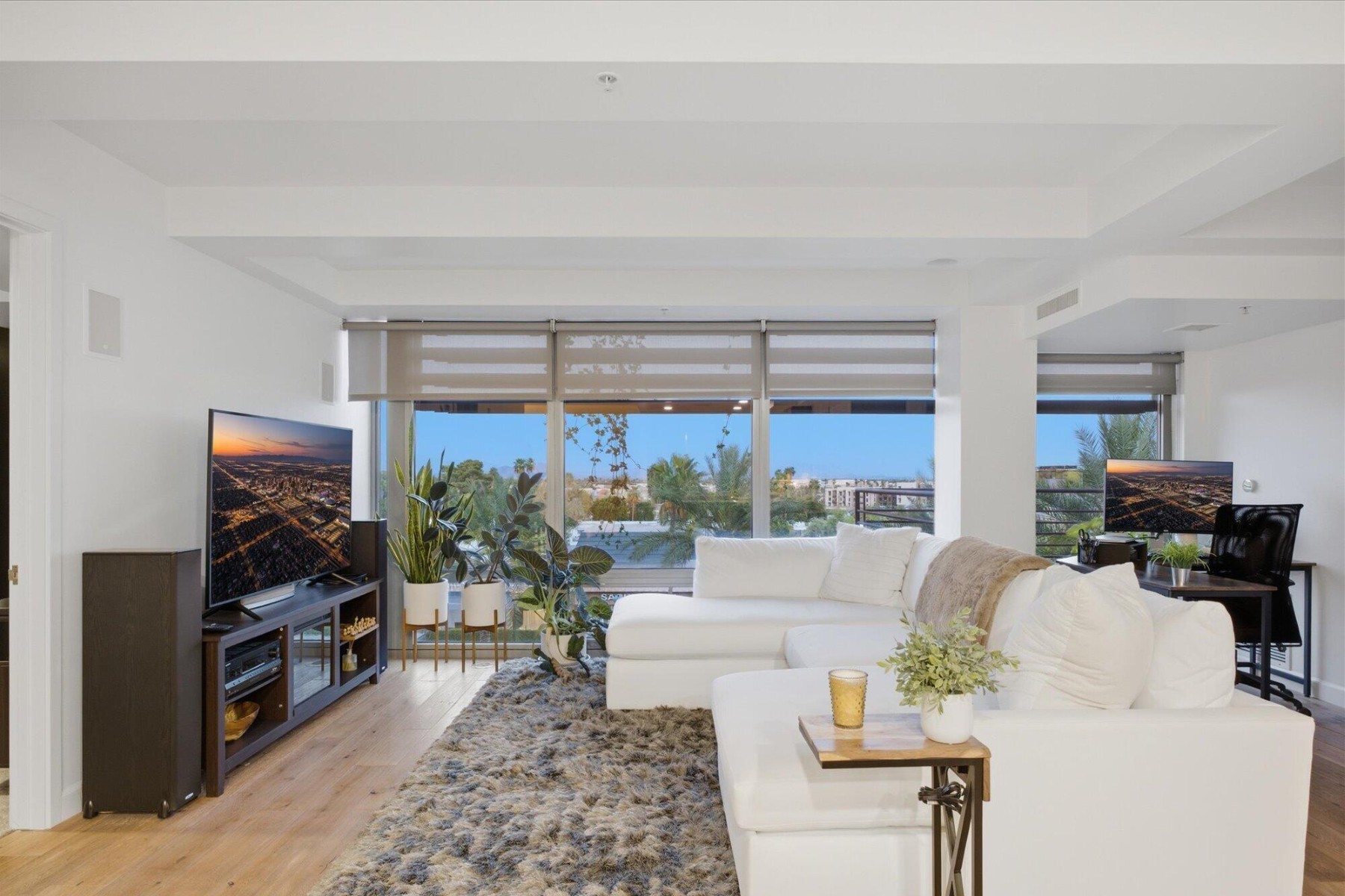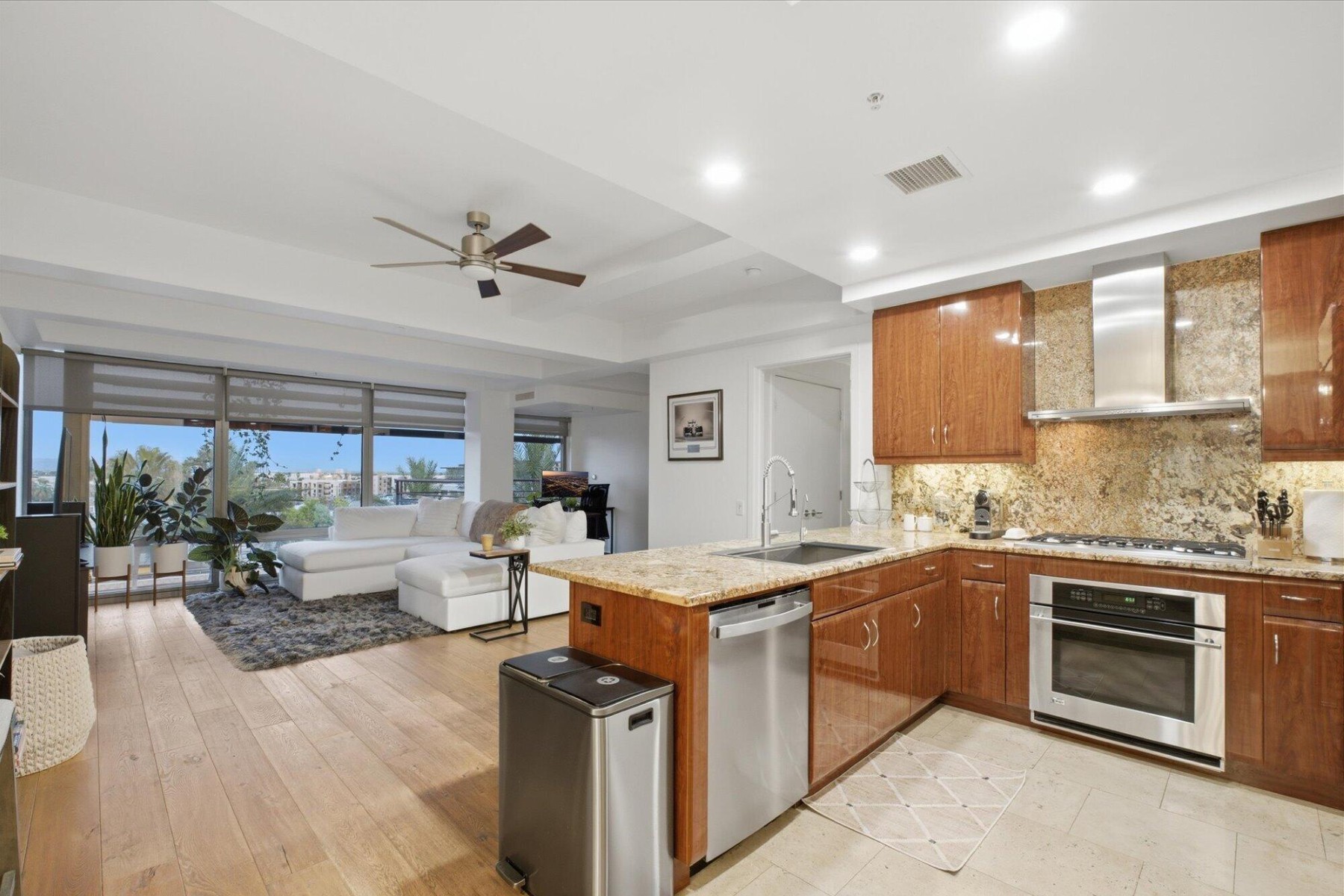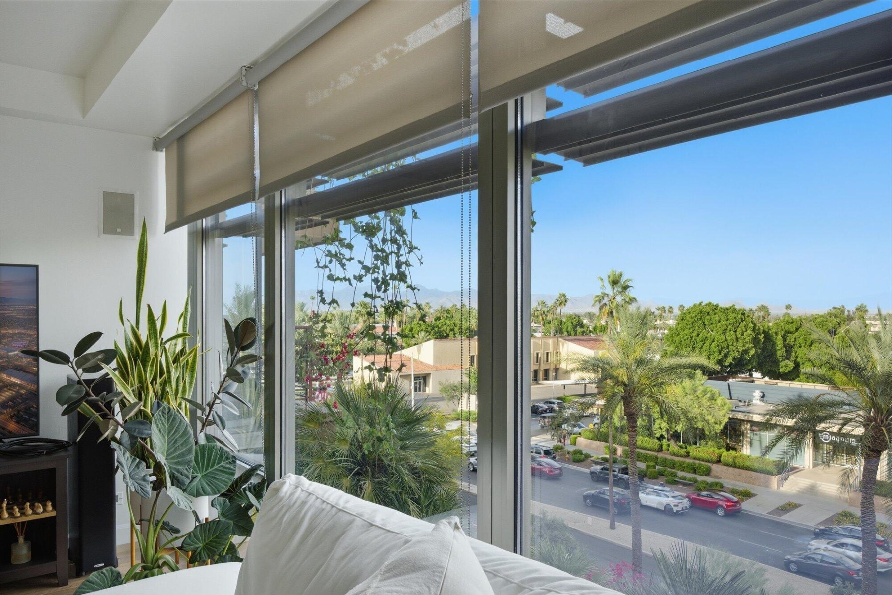 Enjoy the Scottsdale lifestyle at the Optima Camelview. This 5th floor unit was thoughtfully updated and features a highly desirable split floor plan with open-concept living. Luxury finishes & fixtures throughout complement oak hardwood floors, under-cabinet lighting, and smart home features including Nest thermostats and smart kitchen bulbs. The kitchen includes a GE Profile dishwasher (2023), updated sink with reverse osmosis system (2023), and opens seamlessly to the main living area. A flexible dining space can serve as a second office or potential third bedroom, with an additional office off the family room. Built-in speakers enhance the family room and primary suite.Enjoy mountain views of the McDowells, Four Peaks, Superstition, and Red Mountain from both bedrooms and the family room. The primary suite offers an oversized balcony, dual custom closets, and updated bathroom finishes. Additional highlights include a new AC (2025, $15K), in-unit laundry with built-in shelving, and Whirlpool washer and dryer.