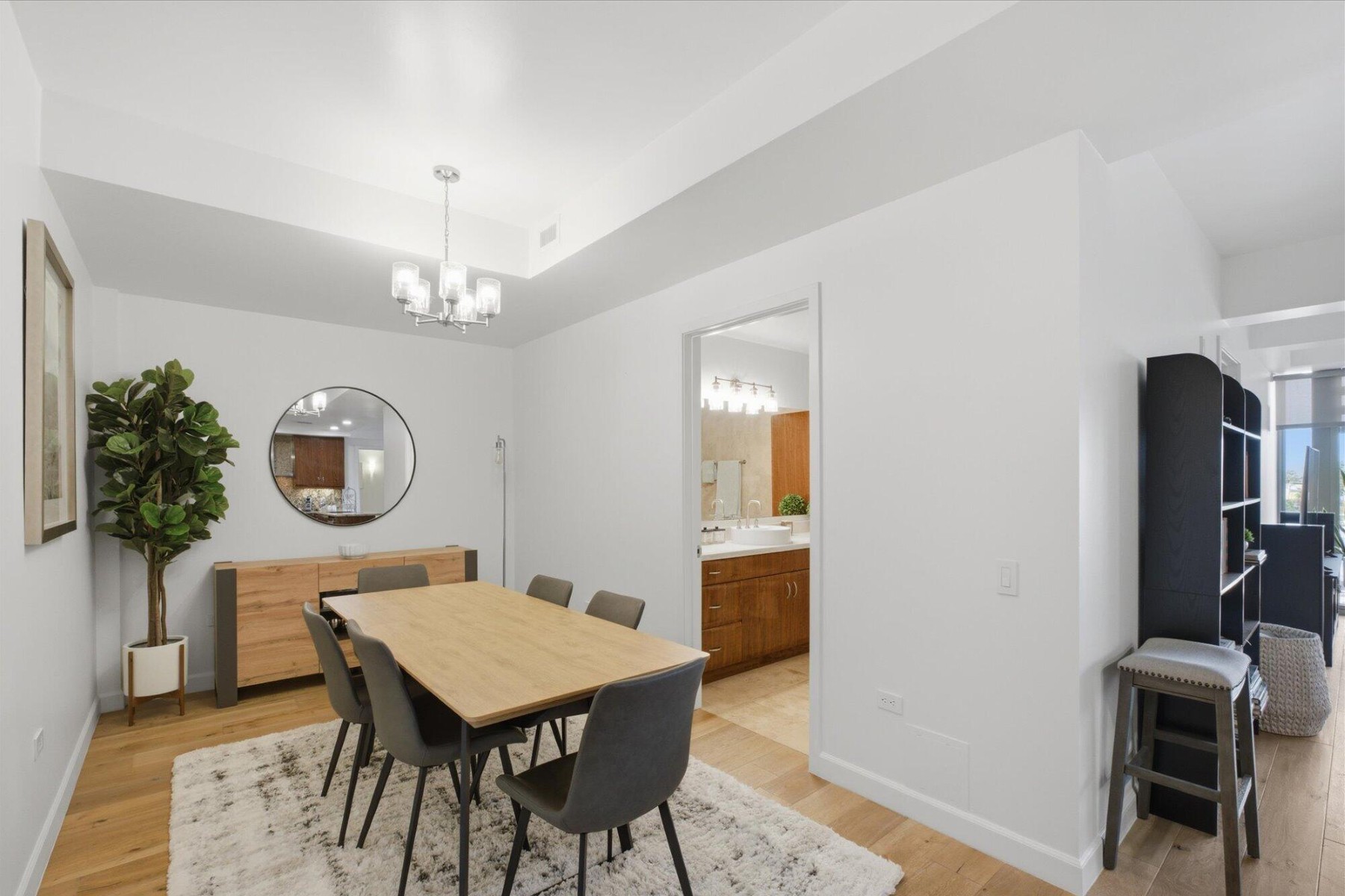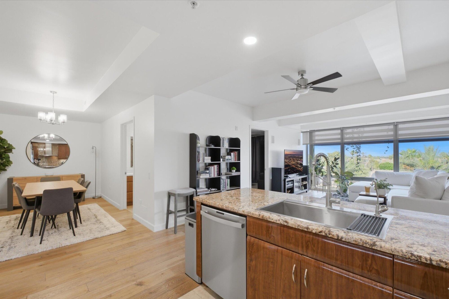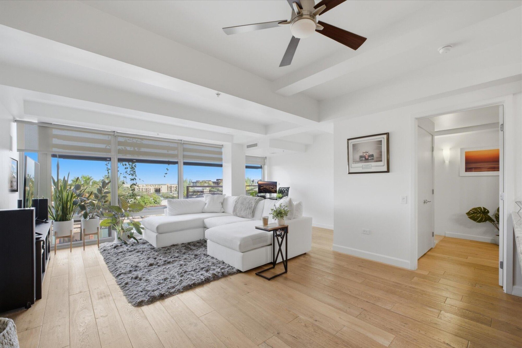 Enjoy the Scottsdale lifestyle at the Optima Camelview. This 5th floor unit was thoughtfully updated and features a highly desirable split floor plan with open-concept living. Luxury finishes & fixtures throughout complement oak hardwood floors, under-cabinet lighting, and smart home features including Nest thermostats and smart kitchen bulbs. The kitchen includes a GE Profile dishwasher (2023), updated sink with reverse osmosis system (2023), and opens seamlessly to the main living area. A flexible dining space can serve as a second office or potential third bedroom, with an additional office off the family room. Built-in speakers enhance the family room and primary suite.Enjoy mountain views of the McDowells, Four Peaks, Superstition, and Red Mountain from both bedrooms and the family room. The primary suite offers an oversized balcony, dual custom closets, and updated bathroom finishes. Additional highlights include a new AC (2025, $15K), in-unit laundry with built-in shelving, and Whirlpool washer and dryer.