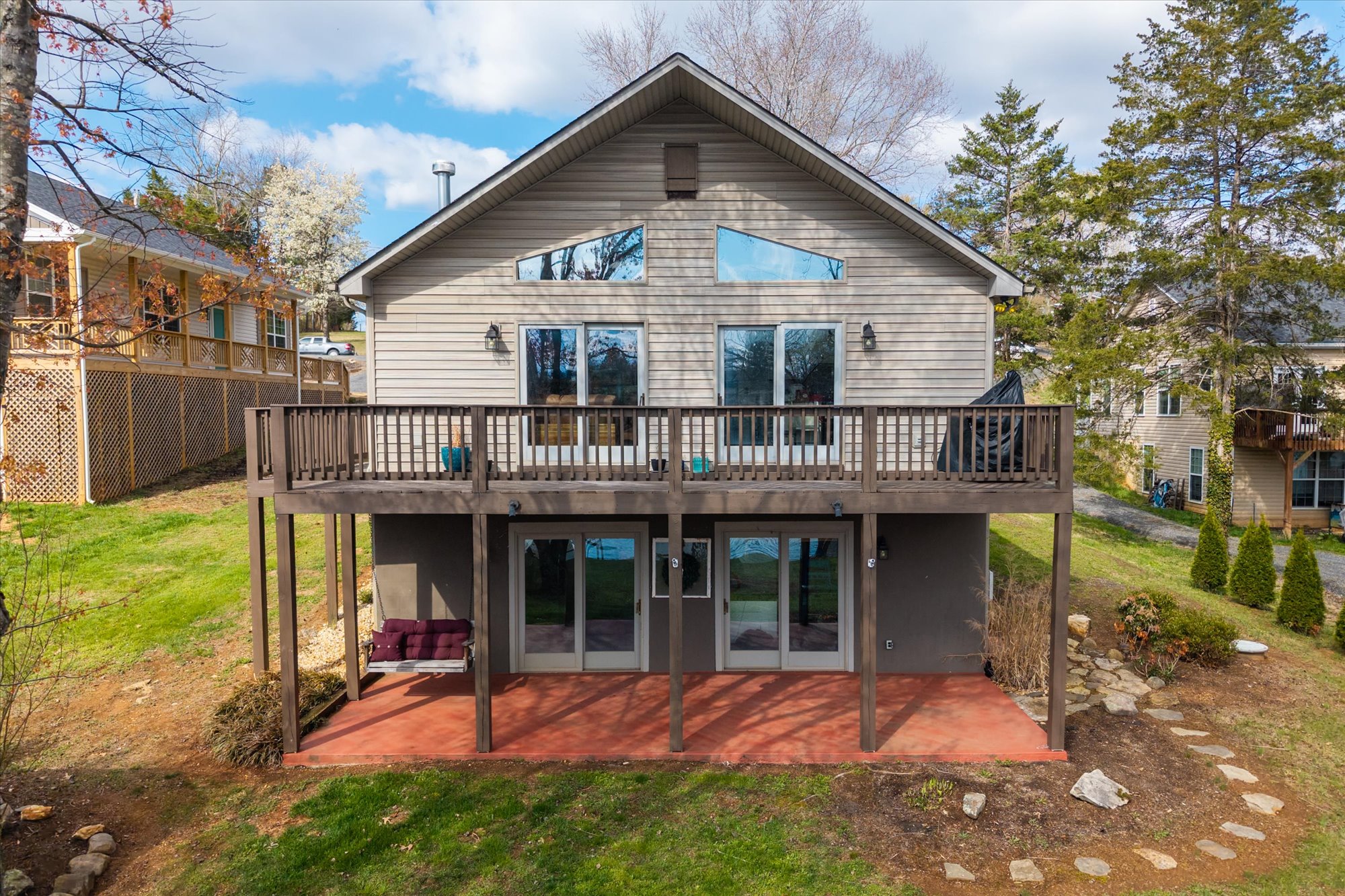 striking stone fireplace anchors the living space, creating a warm and inviting setting for everyday living or entertaining. The lower level offers a partially