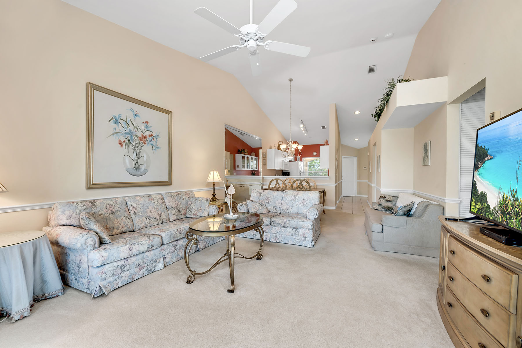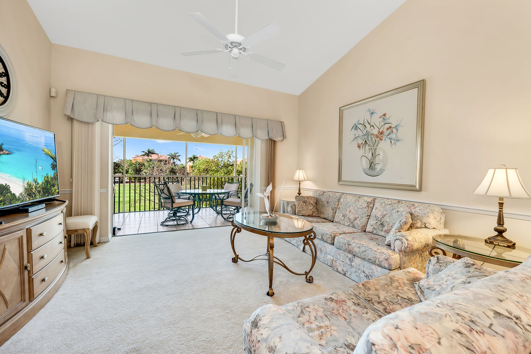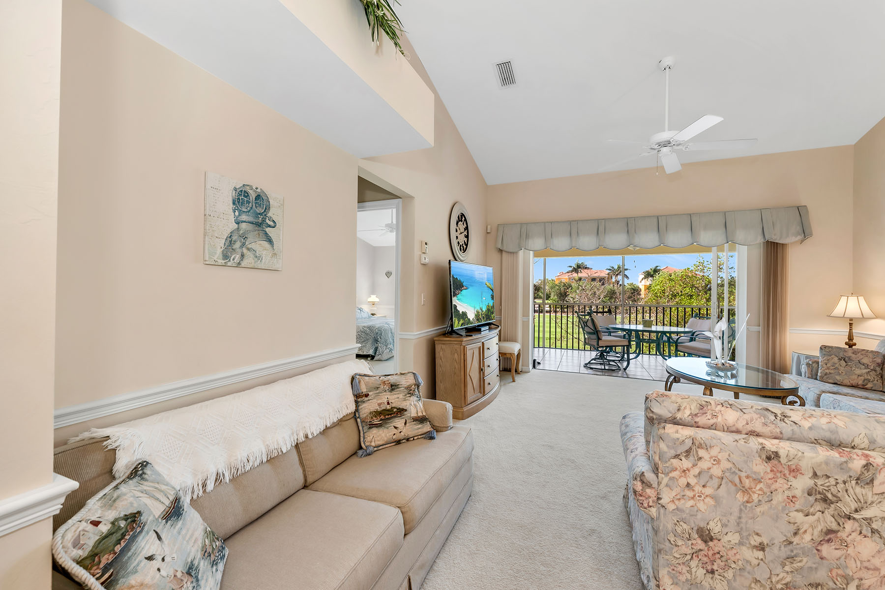In the sought-after Fairways II at Marco Shores community in Naples, this impeccably maintained three-bedroom, two-bath condominium presents an exceptional opportunity to enjoy the best of Southwest Florida living. From the moment you go inside, you're welcomed by soaring volume ceilings and an abundance of natural light, creating a bright and inviting atmosphere throughout. The spacious open-concept living and dining areas flow effortlessly to a screened lanai, where tranquil golf course views provide the backdrop for relaxing or entertaining. Front and rear lanais have been upgraded with no-see-um screens, allowing you to fully enjoy the outdoor spaces in comfort year-round. The well-appointed kitchen offers functionality and style, seamlessly connecting to the main living areas. The primary suite serves as a private retreat, while two additional bedrooms provide flexibility for guests or a home office. Additional features include an in-residence laundry area and an assigned covered parking space for added convenience. Residents of Fairways II enjoy access to a resort-style community pool, ideal for soaking up the Florida sunshine. Ideally just minutes from renowned beaches of Marco Island and the vibrant downtown district of Naples, you'll have easy access to fine dining, shopping and world-class golf. Whether you're seeking a full-time place or a seasonal getaway, this residence offers an outstanding combination of comfort, location and lifestyle.