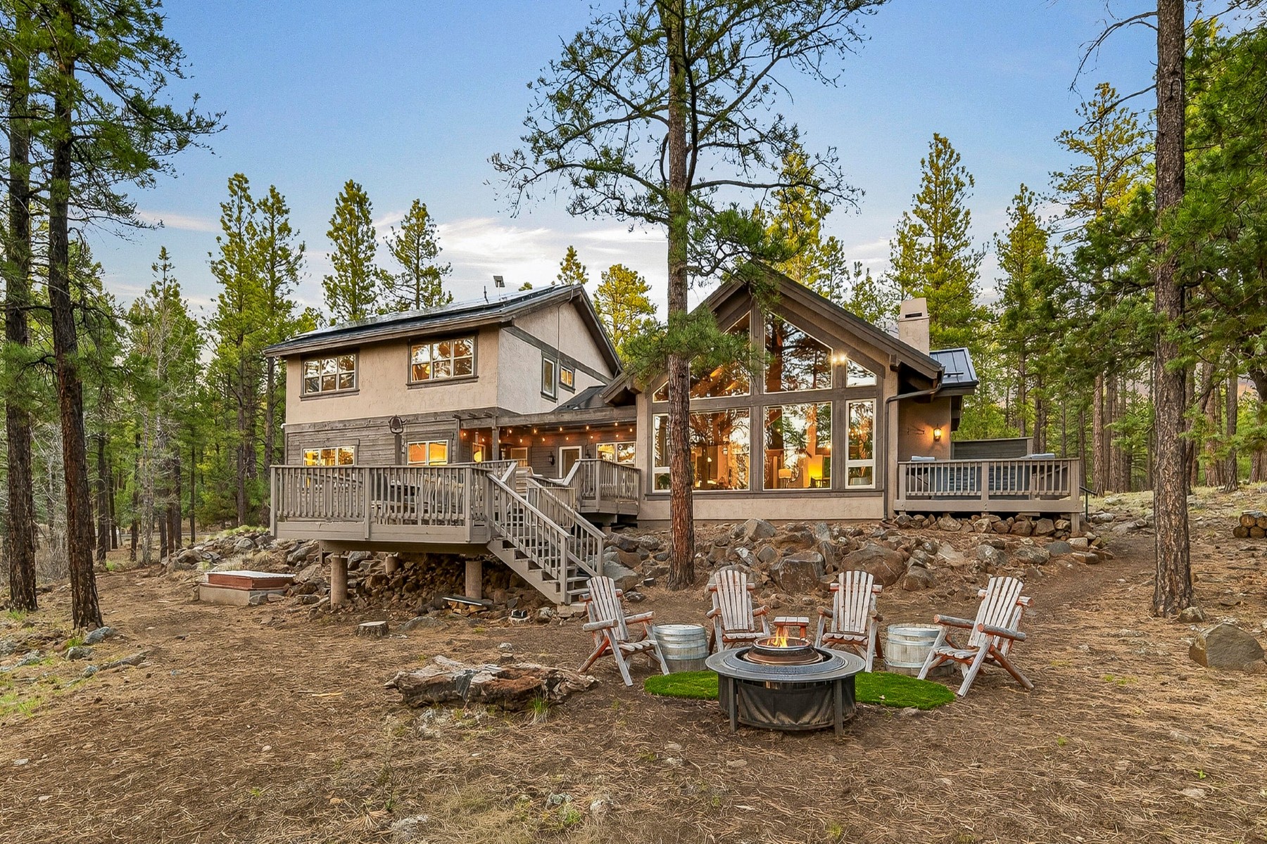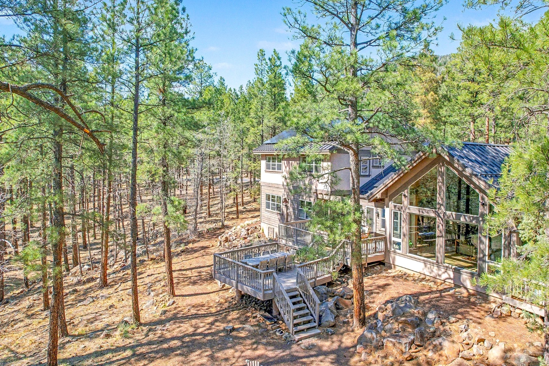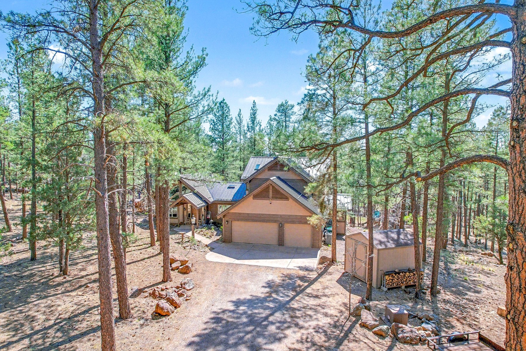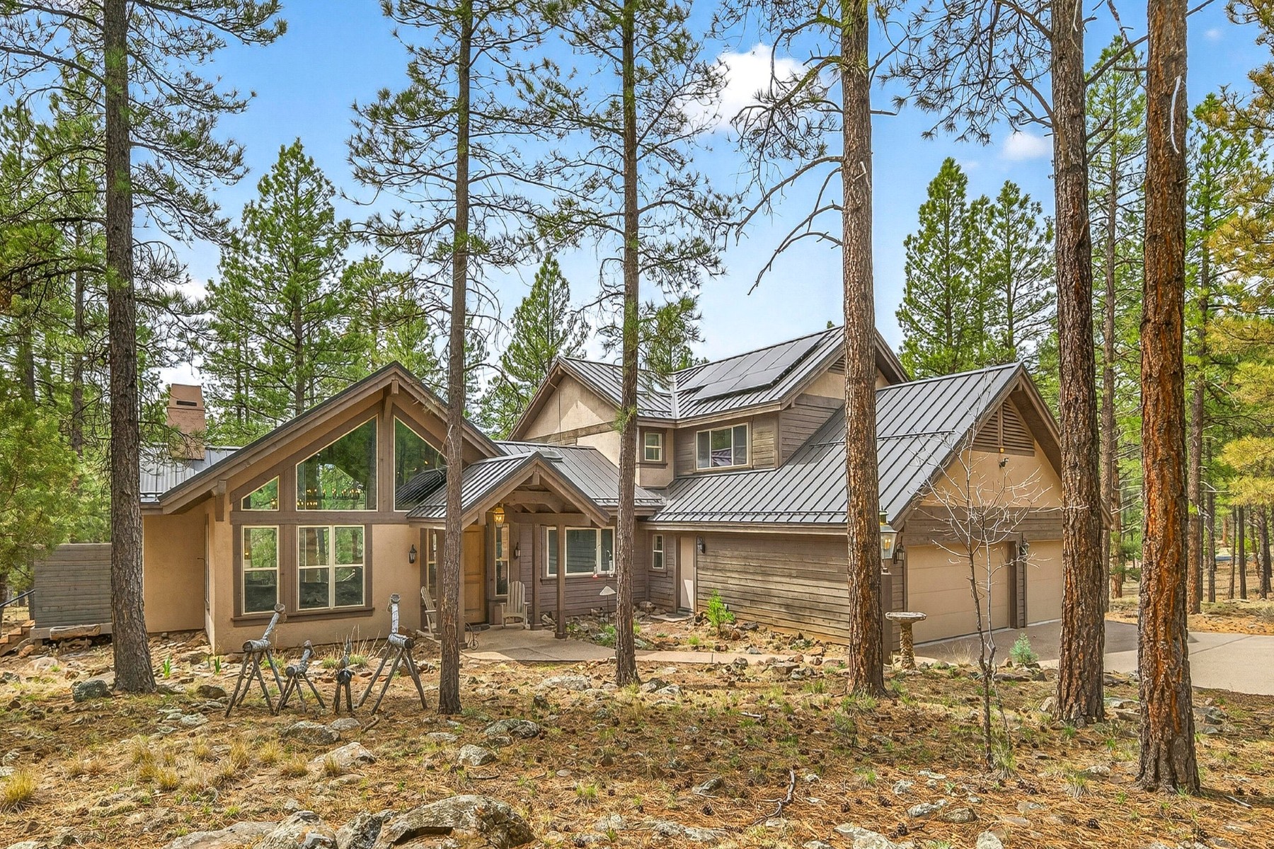 Set on 6.84 Ponderosa pine‑covered acres at the base of Mt. Elden, this Legacy property captures the very best of Flagstaff’s outdoor lifestyle: privacy, wildlife, and miles of premier mountain biking and hiking right outside your door. A custom home crafted with care and layered improvements welcomes you into a setting that feels both elevated and deeply peaceful. Inside, a grand living room showcases a custom Malapai rock fireplace and expansive view windows framing daily wildlife sightings, offering quiet moments among the pines. The entertainer’s kitchen features stain‑washed oak cabinetry, a walnut butcher‑block workstation, double ovens, and a dual‑fuel cooktop. The main‑level primary suite sits near an office or 5th bedroom, with three oversized ensuite bedrooms upstairs, including one with custom triple bunk beds. This home has undergone extensive high‑end interior renovations, including Knotty Alder doors and trim, designer lighting, premium wool Berber carpeting, a mix of slate and large wood plank wood floors, Hunter Douglas window coverings, upgraded stone and granite counters, and a spa‑inspired primary bath with a custom slate soaking tub. Recent major investments elevate long‑term reliability: owned solar, a premium metal roof, whole‑home air sealing by Cozy Home, a high‑efficiency heat pump system, and an upgraded 10,000‑gallon galvanized cistern. The property has been professionally fire‑wise treated, with over 150 additional trees and hazardous limbs removed. A mudroom and laundry area connect to the oversized 3‑car garage, and the home includes two heaters, a hot tub, two A/C units, a large shed, a central vacuum, and more. This turnkey mountain retreat blends luxury, durability, privacy, and an unmatched outdoor lifestyle, all on a paved county road in one of Flagstaff’s most coveted settings.