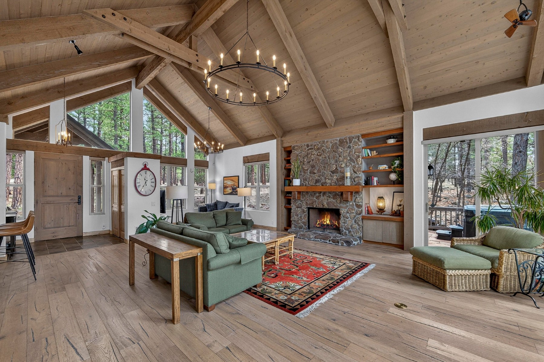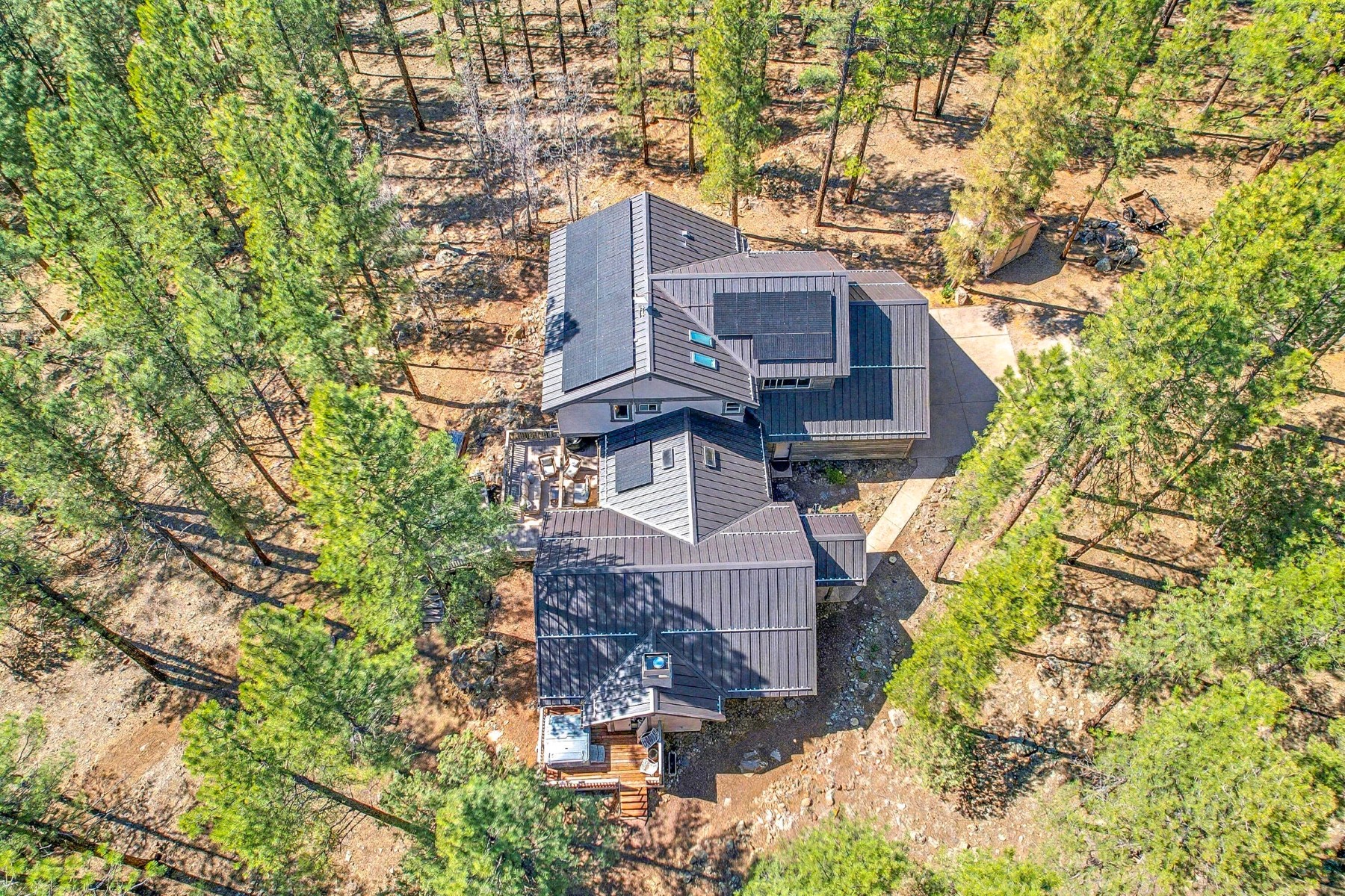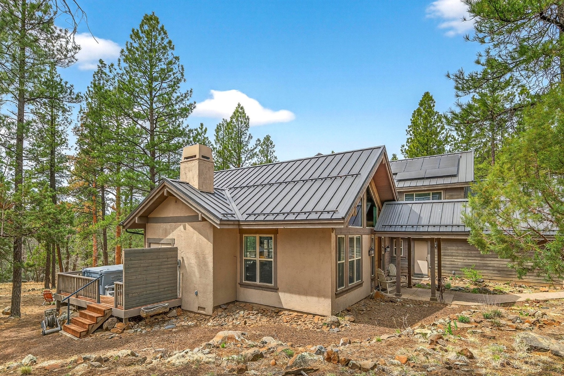 Set on 6.84 Ponderosa pine‑covered acres at the base of Mt. Elden, this Legacy property captures the very best of Flagstaff’s outdoor lifestyle: privacy, wildlife, and miles of premier mountain biking and hiking right outside your door. A custom home crafted with care and layered improvements welcomes you into a setting that feels both elevated and deeply peaceful. Inside, a grand living room showcases a custom Malapai rock fireplace and expansive view windows framing daily wildlife sightings, offering quiet moments among the pines. The entertainer’s kitchen features stain‑washed oak cabinetry, a walnut butcher‑block workstation, double ovens, and a dual‑fuel cooktop. The main‑level primary suite sits near an office or 5th bedroom, with three oversized ensuite bedrooms upstairs, including one with custom triple bunk beds. This home has undergone extensive high‑end interior renovations, including Knotty Alder doors and trim, designer lighting, premium wool Berber carpeting, a mix of slate and large wood plank wood floors, Hunter Douglas window coverings, upgraded stone and granite counters, and a spa‑inspired primary bath with a custom slate soaking tub. Recent major investments elevate long‑term reliability: owned solar, a premium metal roof, whole‑home air sealing by Cozy Home, a high‑efficiency heat pump system, and an upgraded 10,000‑gallon galvanized cistern. The property has been professionally fire‑wise treated, with over 150 additional trees and hazardous limbs removed. A mudroom and laundry area connect to the oversized 3‑car garage, and the home includes two heaters, a hot tub, two A/C units, a large shed, a central vacuum, and more. This turnkey mountain retreat blends luxury, durability, privacy, and an unmatched outdoor lifestyle, all on a paved county road in one of Flagstaff’s most coveted settings.