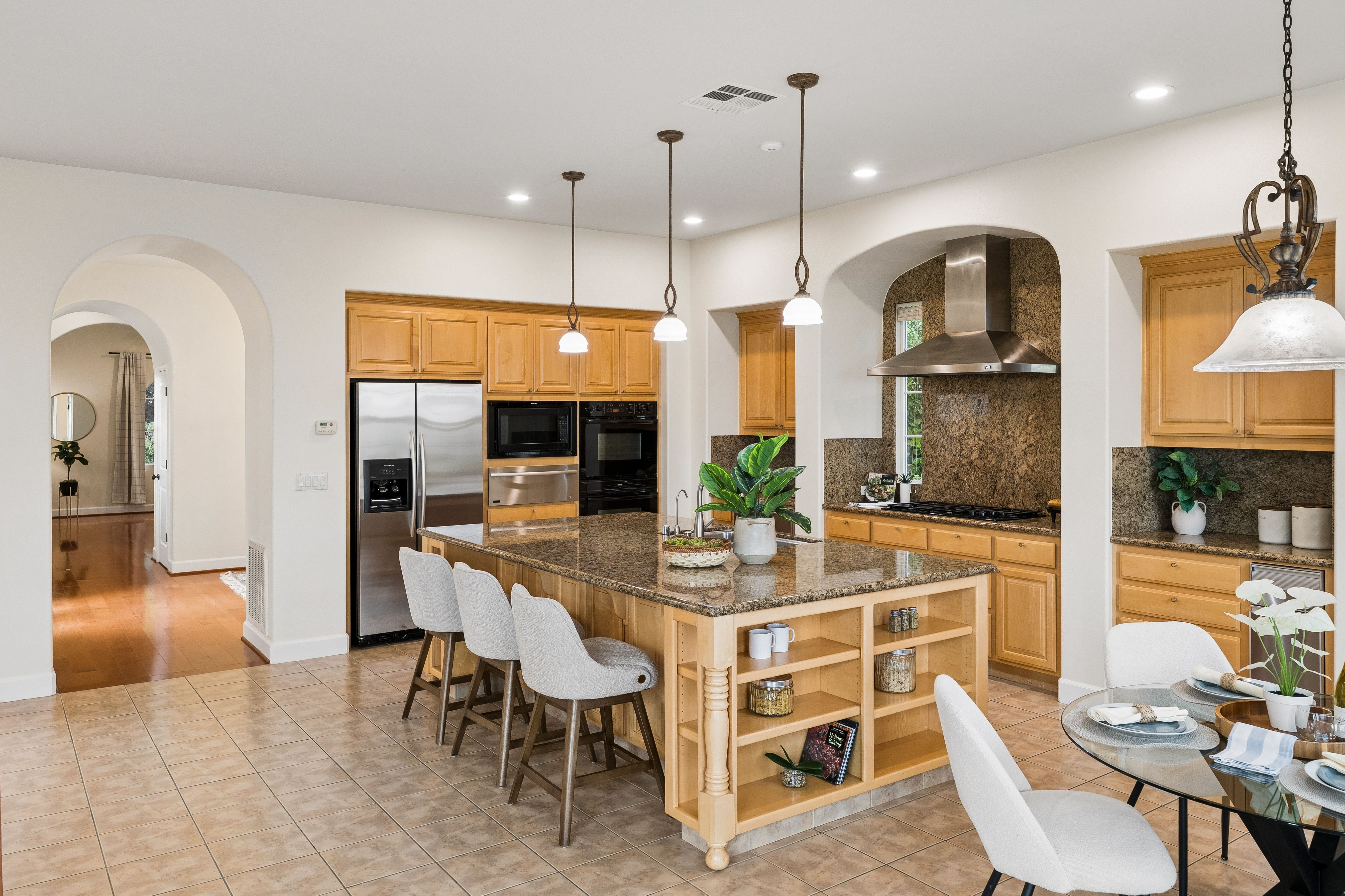 Discover Shapell’s signature craftsmanship in this exceptional “Gallery” residence, ideally located in the prestigious Gale Ranch community. Built in 2004, this stunning Craftsman-style home offers approximately 4,673 square feet of expansive living space with an open floor plan that blends timeless elegance with panoramic San Ramon views. Featuring six bedrooms and three-and-a-half bathrooms, the home includes formal living and dining rooms, along with an expansive gourmet kitchen, family room, and sunlit breakfast nook, designed for both everyday living and entertaining. The main level offers two bedrooms and one-and-a-half bathrooms, ideal for multigenerational living or a private guest retreat. Situated on a premium 8,949 square foot lot with no rear neighbors, the property offers panoramic sunset views and a tranquil waterfall feature. The professionally landscaped grounds include a tiered stone entry, an inviting courtyard, and lush gardens with fruit trees. Additional highlights include a three-car tandem garage, owned solar system, central vacuum, premium appliances, and top-rated San Ramon Valley Unified schools. This home defines luxury California living!