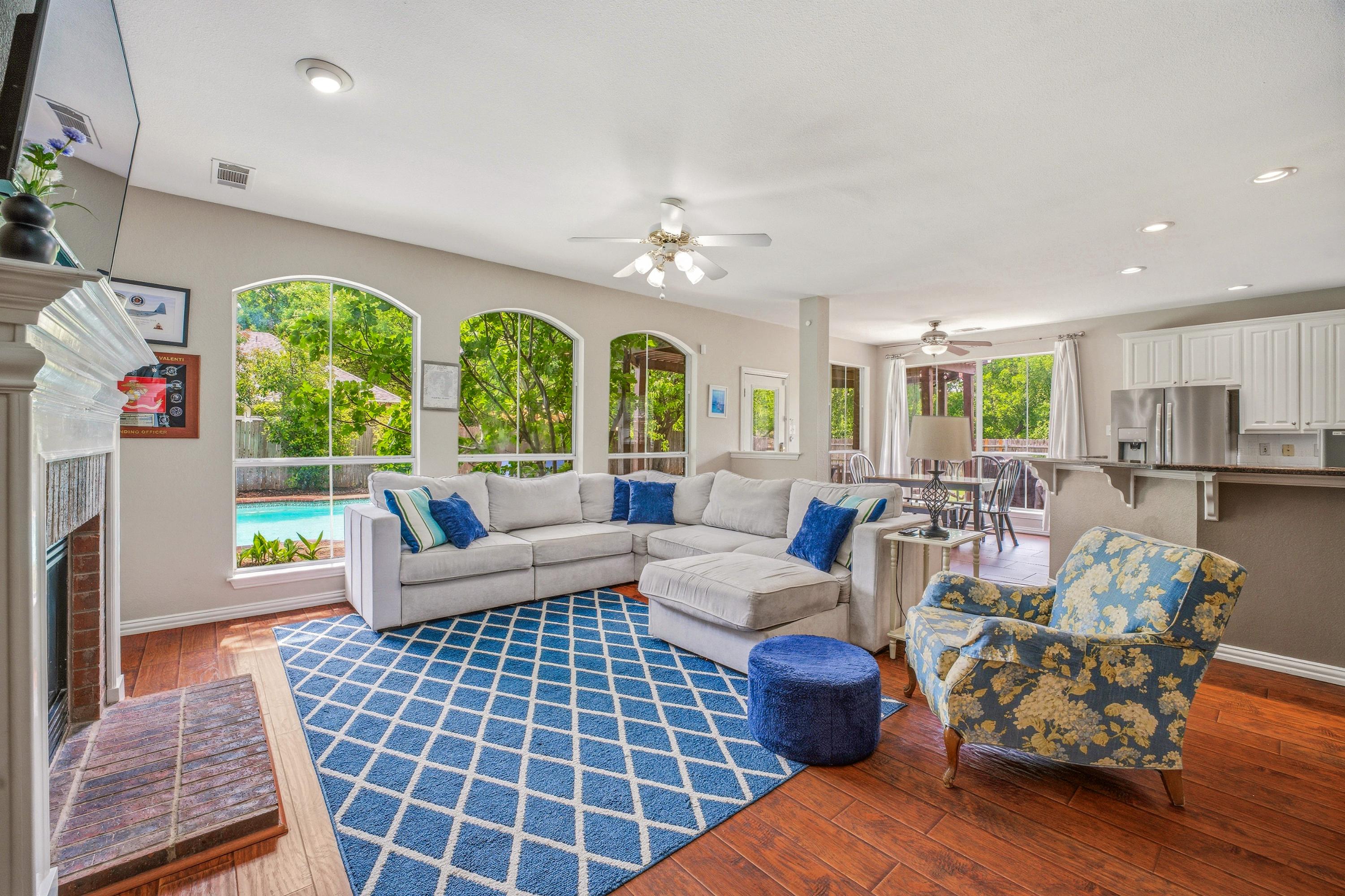 Get summer-ready in Stoneglen at Fossil Creek, where refined comfort meets everyday ease. Set on an expansive corner lot, this beautifully appointed home offers a seamless blend of style, space, and lifestyle. Ideally located near The Golf Club at Fossil Creek and surrounded by walking trails, a park, and a neighboring greenbelt, the setting is as peaceful as it is convenient. Inside, natural light pours through expansive windows, highlighting engineered hardwood floors and thoughtfully curated living spaces. The kitchen is both functional and inviting, featuring stainless steel appliances, a center island with gas cooktop, and a sink perfectly positioned beneath a window overlooking the lush backyard. Anchored by a gas fireplace, this space is designed for both intimate evenings and effortless entertaining, all overlooking your backyard retreat. Outdoors, a private oasis awaits with a sparkling pool and spa, covered patio, pergola, and a generous side yard, creating a perfect backdrop for relaxing or hosting under the Texas sky. The versatile floorplan offers exceptional flexibility, with multiple living areas including two downstairs, an additional living or flex space upstairs, and a dedicated office that easily adapts to your needs. The primary suite serves as a true retreat, complete with space for a sitting area and a beautifully updated bath featuring an oversized walk-in shower. Located in Keller ISD and just minutes from shopping, dining, and the Alliance Corridor, this home offers a rare opportunity to enjoy elevated living in a desirable community.