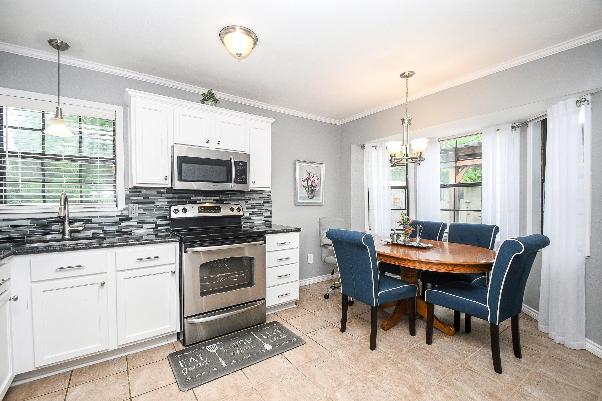 Exceptionally clean and well maintained home! Sensible two story home effectively has two primary bedrooms - one upstairs and one down. The two story den & dining room lend a voluminous feel to the home. The kitchen has been updated with cabinets, granite counter-tops, glass backsplash, and stainless steel appliances. The kitchen opens to a breakfast room with bay window overlooking the glorious backyard. The numerous upgrades, updates, and special features include: 2025 roof shingles (35 year!), interior doors, interior paint, water heater, backyard pergola, electric breaker box & main power wire, wood on the stairs, and two sides of the fence. The upstairs bathroom tub enclosure, sinks, and flooring are also superbly done. Also: Two backyard benches & firepit in a very large yard, epoxy on garage floors, upstairs landing with wrought iron rail, front & back gutters, rose bushes, and storm doors. Part of the garage has been converted to a utility room. The second pantry will stay.
