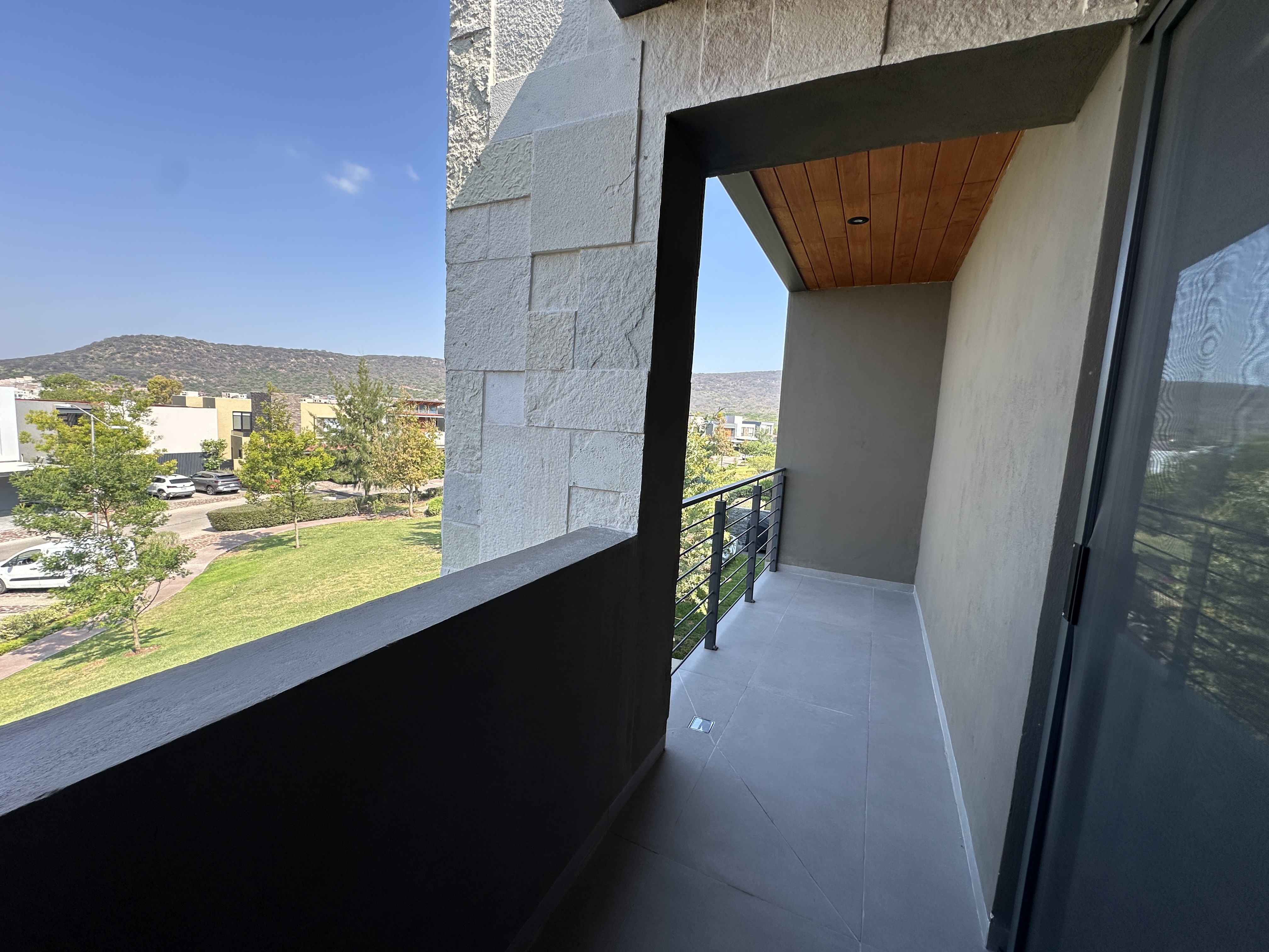 Upstairs, a TV lounge with natural light connects the private areas. The primary bedroom stands out with its wood-accented ceiling, a spacious bathroom with double vanity, a walk-in closet, and access to a balcony-style terrace that extends along the façade—ideal for enjoying open views.
