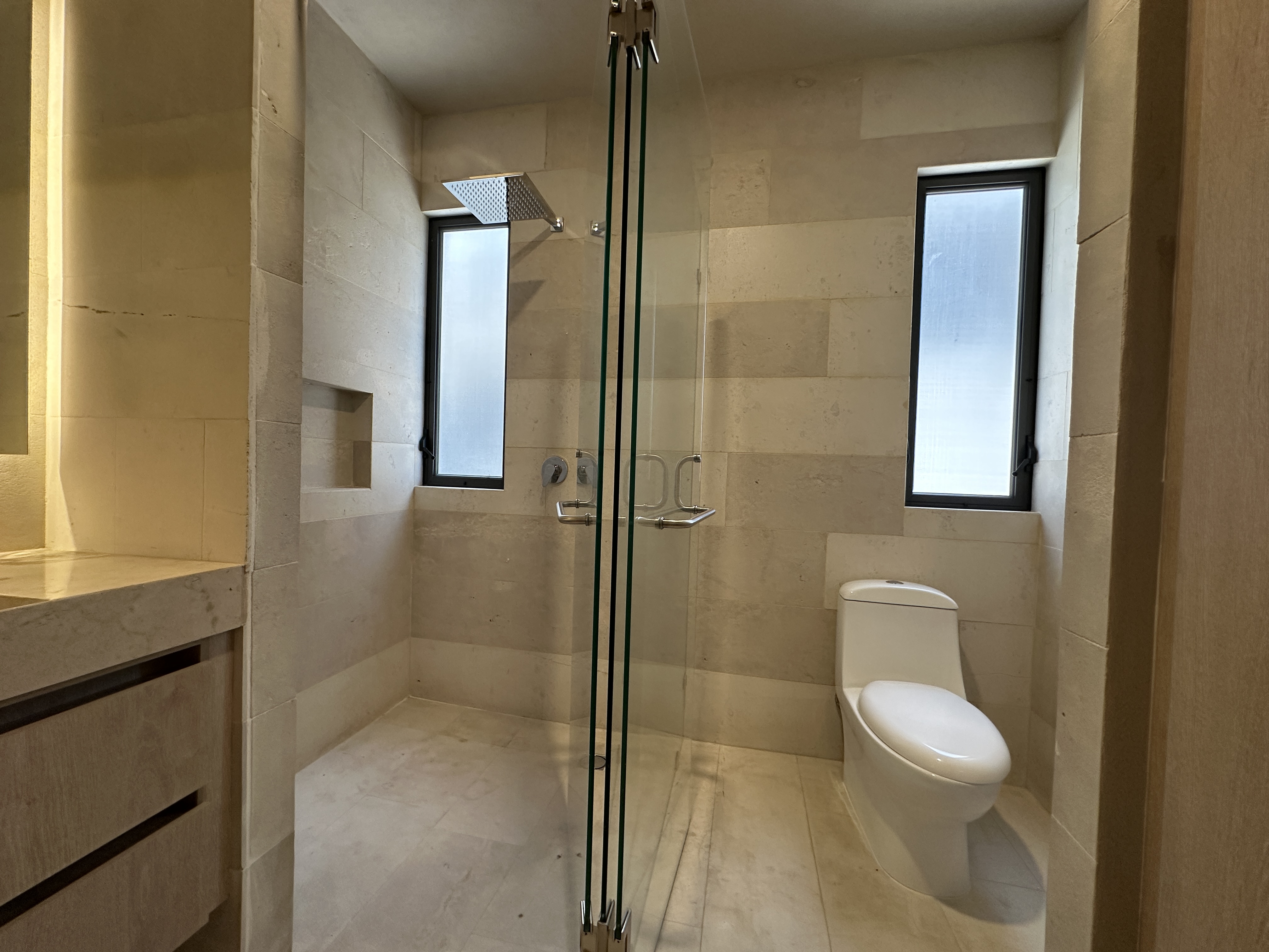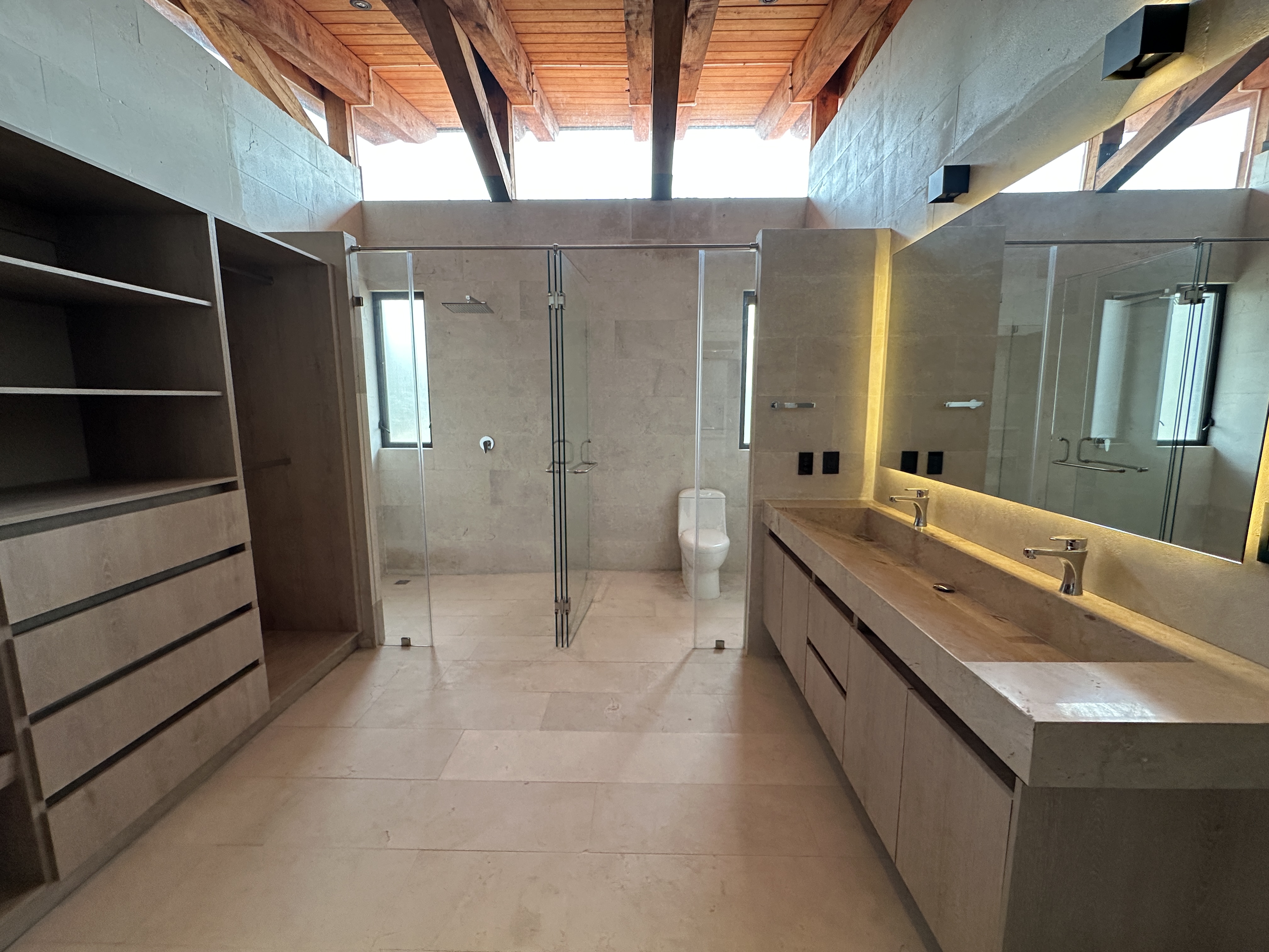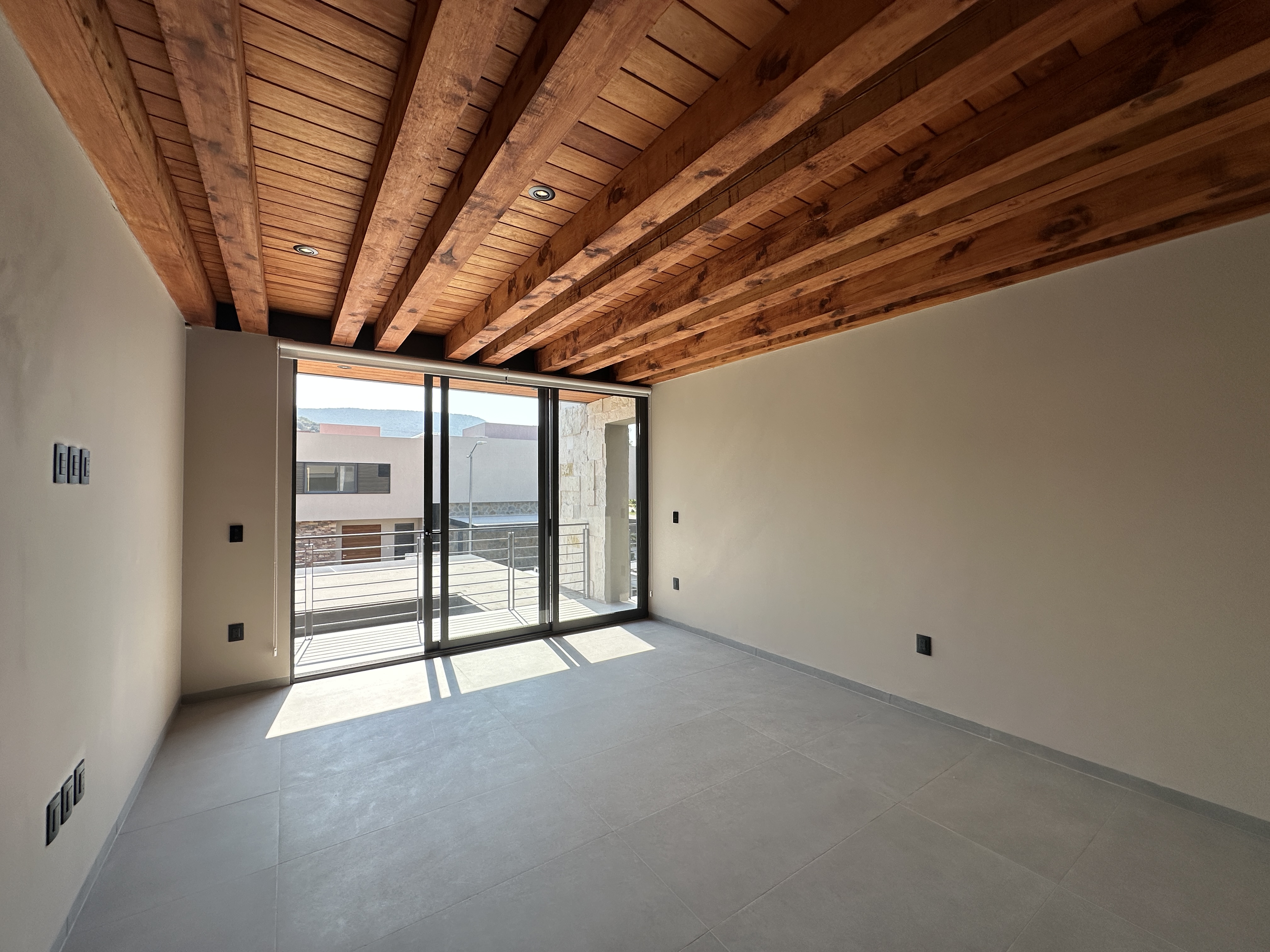 En la planta alta, una sala de TV con luz natural articula las áreas privadas. La recámara principal destaca por su techo con detalles en madera, amplio baño con doble lavabo, walk-in closet y acceso a una terraza tipo balcón que se extiende a lo largo de la fachada, ideal para disfrutar de vistas abiertas.