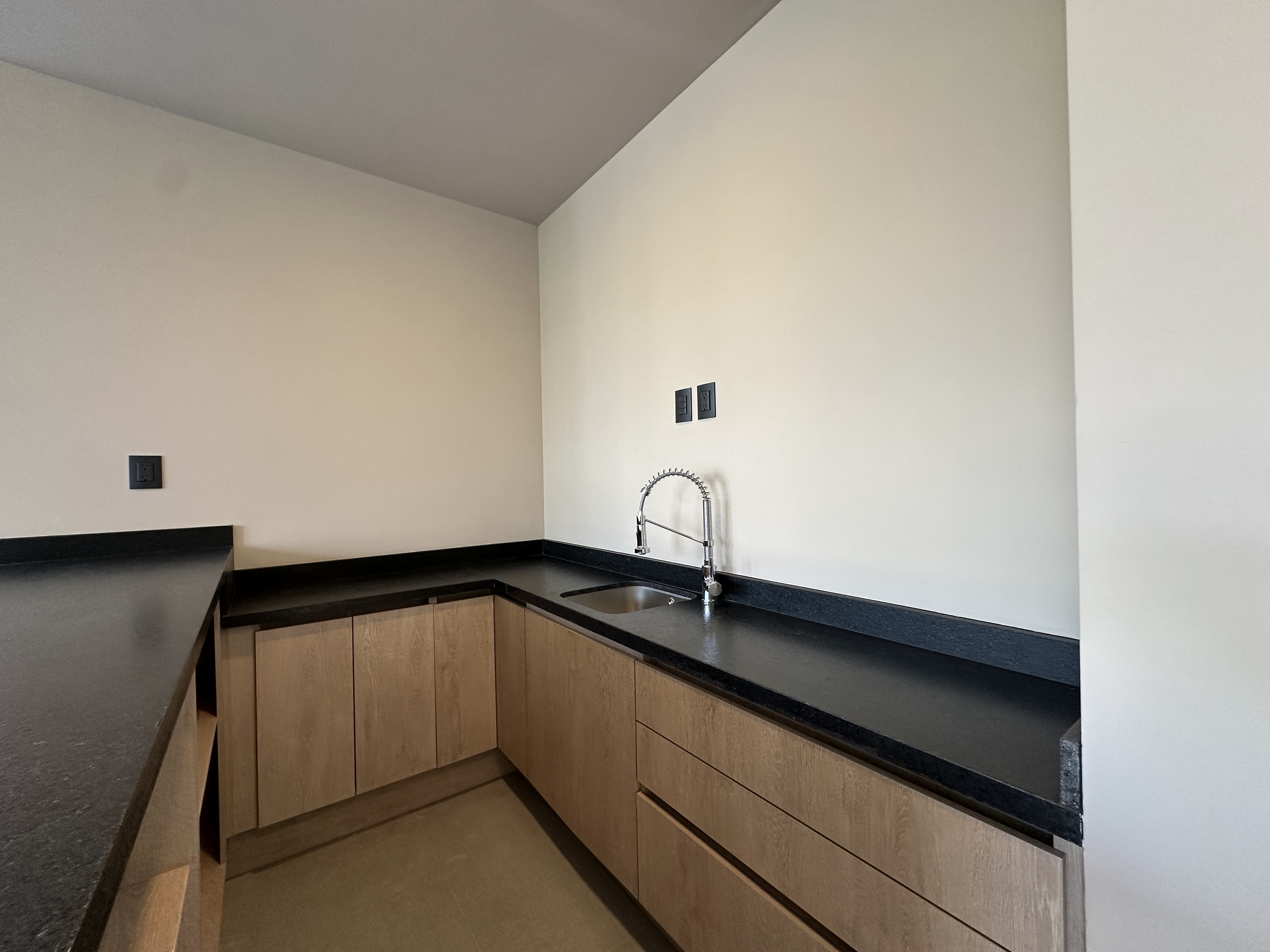 La cocina principal, con cubiertas de granito, se complementa con una segunda área tipo isla o barra independiente, perfecta como bar, cava o punto de reunión. Un pasillo lateral brinda acceso directo al exterior. La planta baja se completa con cuarto de servicio con baño completo, sumando funcionalidad al conjunto.