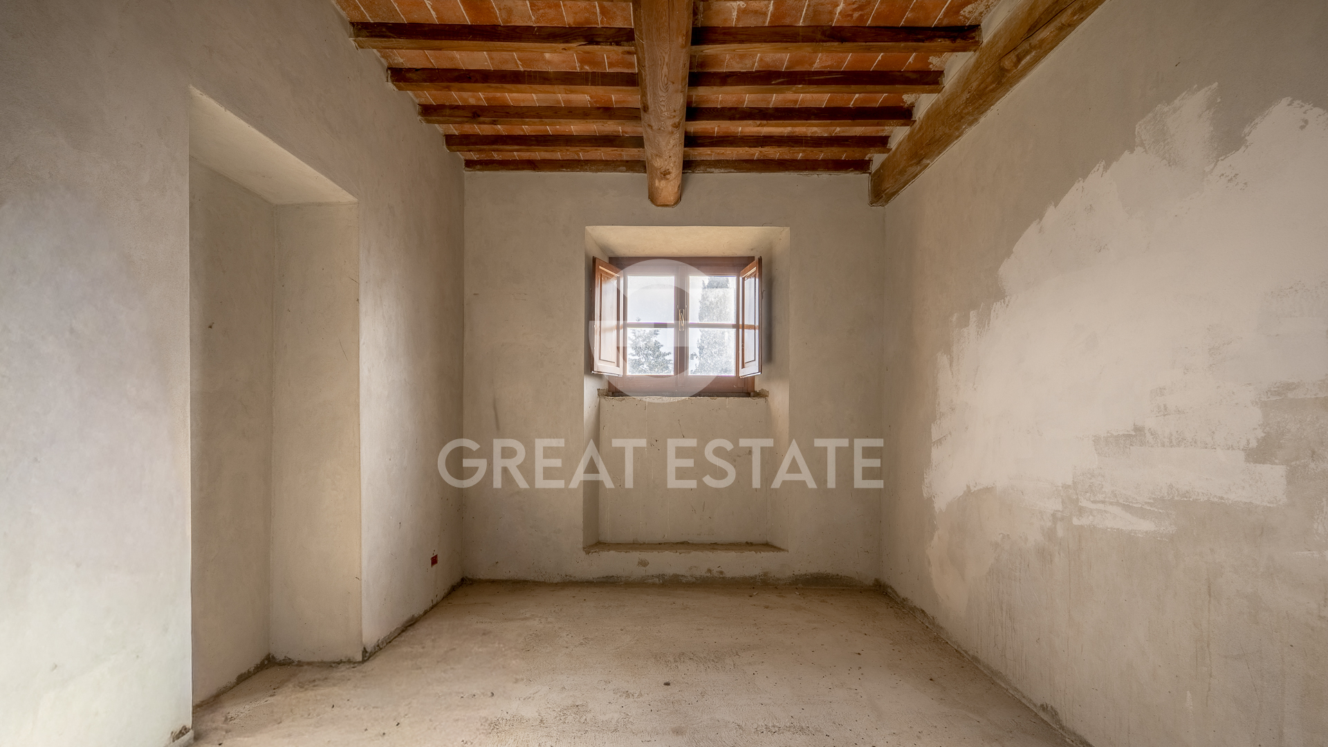 In a commanding position on the hills of Cortona, this impressive villa is arranged over three levels, complemented by an additional section distributed over two floors, offering generous volumes and architectural charm for a total of approximately 500 sqm. The rooms on the ground floor, spacious and filled with natural light, lend themselves to the creation of elegant living areas, formal reception lounges, or contemporary convivial spaces, while maintaining a dialogue with the historic character of the building. The upper levels, dedicated to the sleeping quarters and private studies, enjoy enchanting views over the rolling Tuscan hills, offering vistas of rare beauty. The rear portion allows for the creation of additional bedrooms, an independent guest or staff annex, or a private area devoted to wellness and relaxation. The farmhouse is surrounded by an expansive garden of approximately 5400 sqm, enhanced by 36 olive trees arranged on charming terraced levels. Plans have already been approved for the construction of a 72 sqm in-ground swimming pool, a 25 sqm gazebo with a lightweight structure and retractable cover, and a 16 sqm pergola to fully enjoy the outdoor spaces. There is also the possibility to build an underground garage, taking advantage of the natural slope of the land to ensure convenient and discreet access.