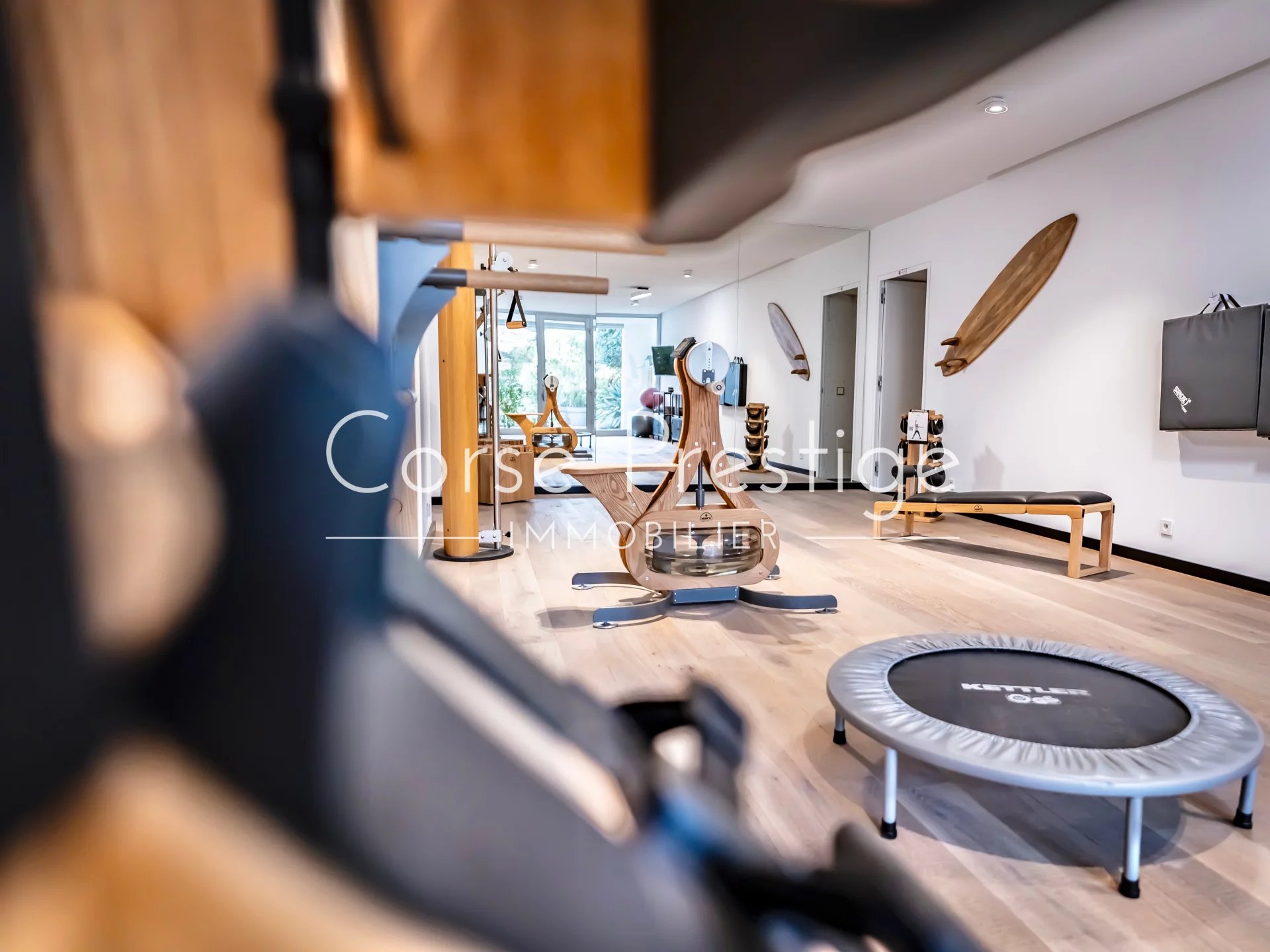 This 650 m² villa, with its authentic and refined luxury, offers a wide range of amenities and can accommodate up to ten guests in absolute comfort. The tone is set from the moment you arrive. A majestic front door opens onto a spacious hall offering breathtaking views of the sea. The living area is bathed in exceptional natural light thanks to its huge bay windows, which open generously onto the terrace and swimming pool, creating a seamless flow between indoors and outdoors. The dining room can seat up to ten guests. The main Boffi kitchen, fitted with Gaggenau appliances, is complemented by a separate semi-professional kitchen, a wine cellar and a utility room. The sleeping area comprises five bedrooms with high-end amenities; a 90 m² Master Suite offering panoramic sea views, which features a 20 m² adjoining bedroom, creating a true master suite with a private lounge, a dressing room and a bathroom boasting a sea-facing bathtub as well as a double walk-in shower. Two further 30 m² sea-view suites have direct access to the pool terraces, whilst a third 56 m² suite opens onto a Mediterranean garden. Each suite has its own en-suite bathroom with luxurious finishes: handcrafted polished concrete and fine Corsican woods. Your comfort is guaranteed in each of these superb havens of tranquillity, thanks to the linen provided (bed linen, bath towels and pool towels) and the complimentary toiletries made available to you. A 25 m² home cinema with a 4K screen and surround sound system, a 60 m² gym equipped with Technogym and Nordh equipment, and a massage room complete the package, ensuring you can recharge your batteries and relax.