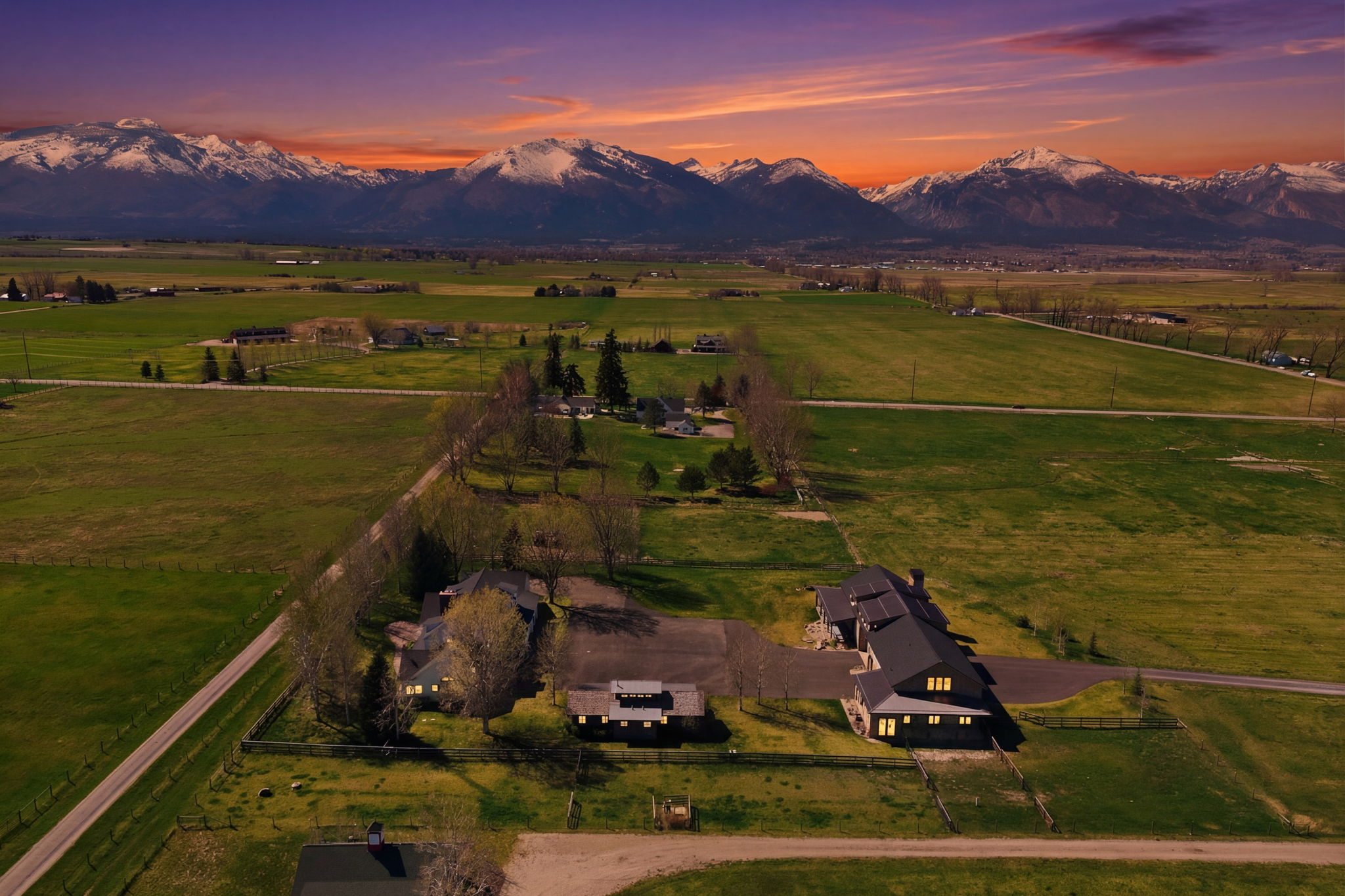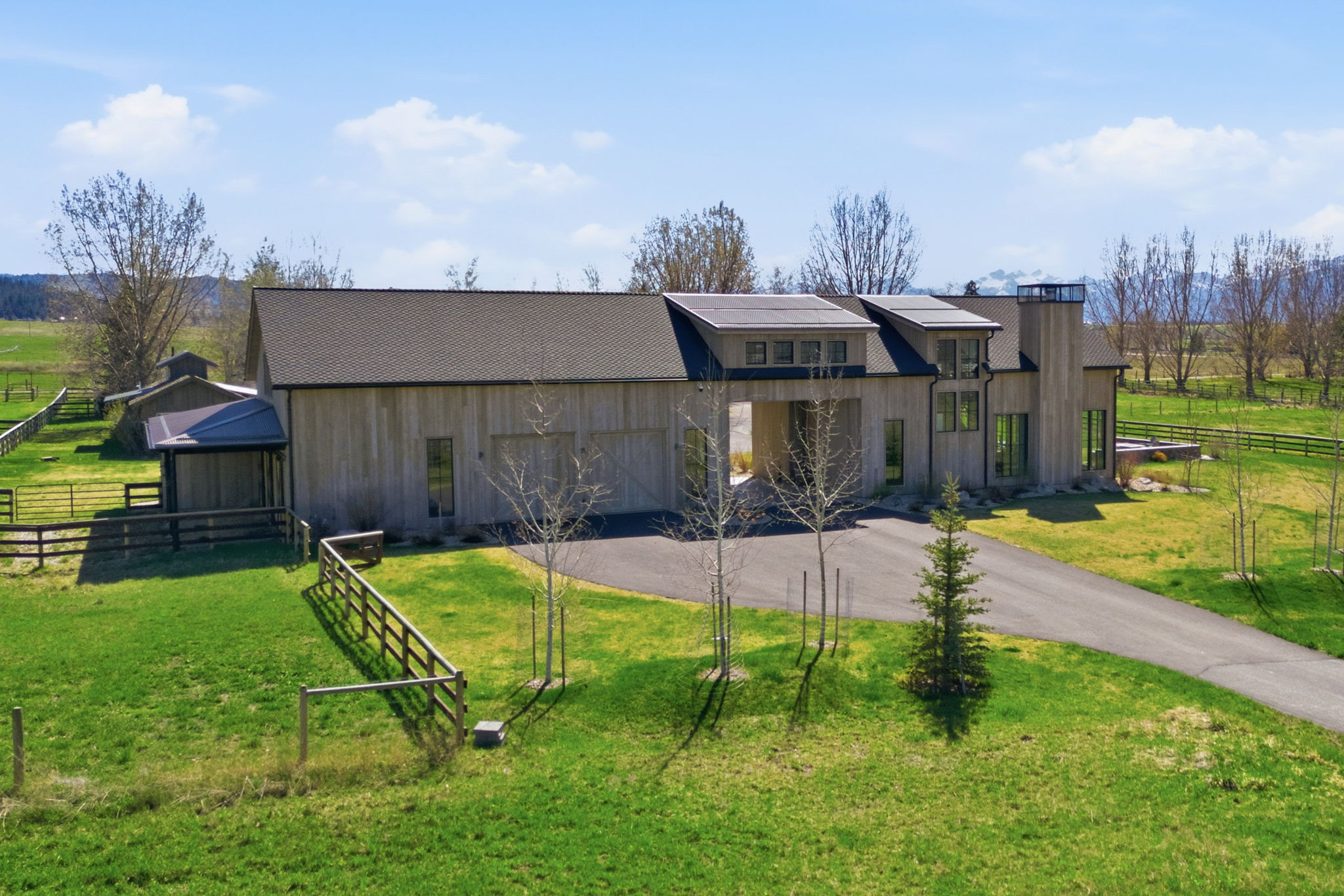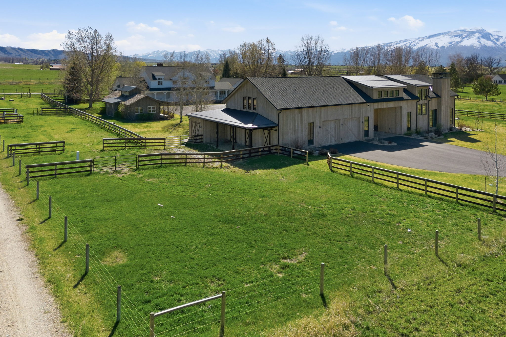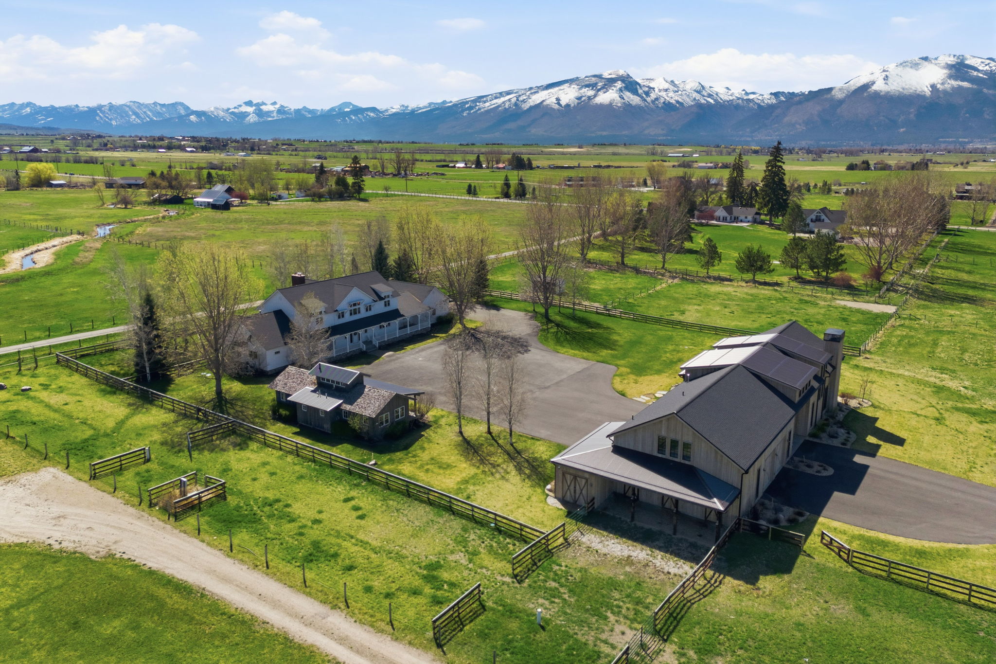 Positioned at the end of a quiet cul-de-sac within the coveted farmhouse enclave of Stock Farm Club, 351 Ogden Lane offers a rare combination of privacy, scale, and refined Montana living across 6.91 acres with sweeping views of the Bitterroot Mountains and valley. Thoughtfully designed as a multi-structure compound, the property creates a seamless balance between everyday comfort, guest accommodations, and exceptional entertaining. The 4,367 sq ft main residence features a well-appointed floor plan with a main-level primary suite, two additional bedrooms upstairs, and multiple living spaces designed for both connection and retreat. A private office with fireplace anchors the main level, while a second office and upper gathering room provide additional flexibility and elevated living. Expansive windows frame the surrounding landscape, bringing natural light and Montana's beauty into every space. A fully furnished 2-bedroom ensuite bunkhouse offers a private and turnkey guest experience, complete with a dining area and continental service space—ideal for hosting with ease. The newly constructed 3,650 sq ft barn is a standout feature, thoughtfully designed to combine equestrian functionality with an extraordinary entertainment environment. One side offers a two-stall barn with attached runs, tack room, and wash rack, while the opposite side showcases a dramatic gathering space with floor-to-ceiling windows, full service kitchen, wood-burning fireplace, cigar room, media room, game loft with full bar, hobby room, and full bath. Outdoor living is equally compelling, with covered dining areas, built-in BBQ, fire pit, fenced yard for dogs, and level acreage suitable for horses, all with direct access to the Stock Farm riding trail system. Additional features include air conditioning, natural gas, and high-speed fiber optic connectivity. This is a rare opportunity to own a private, amenity-rich compound within one of Montana's most sought-after communities.