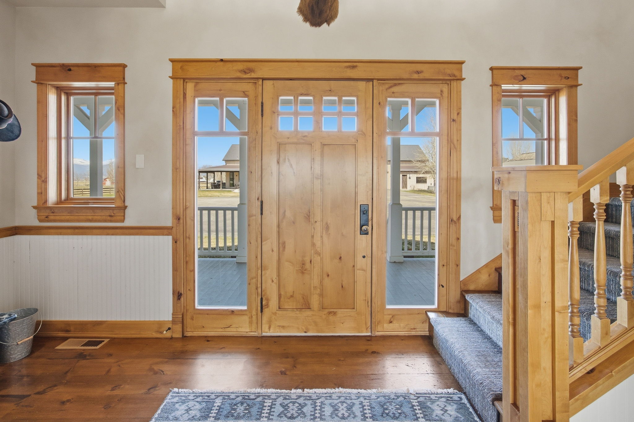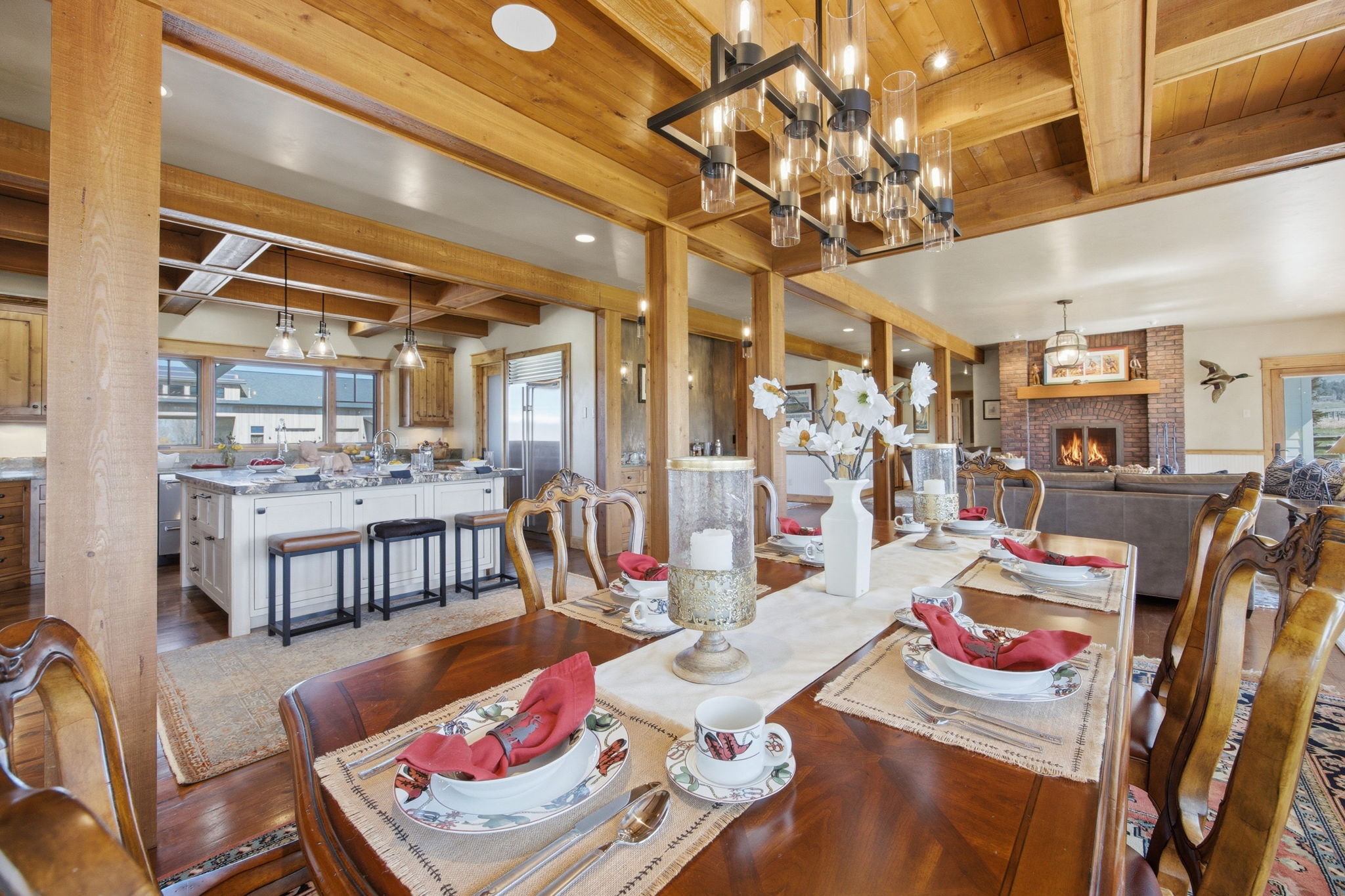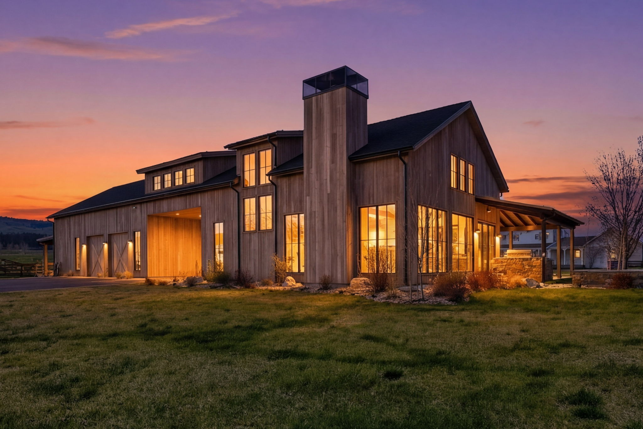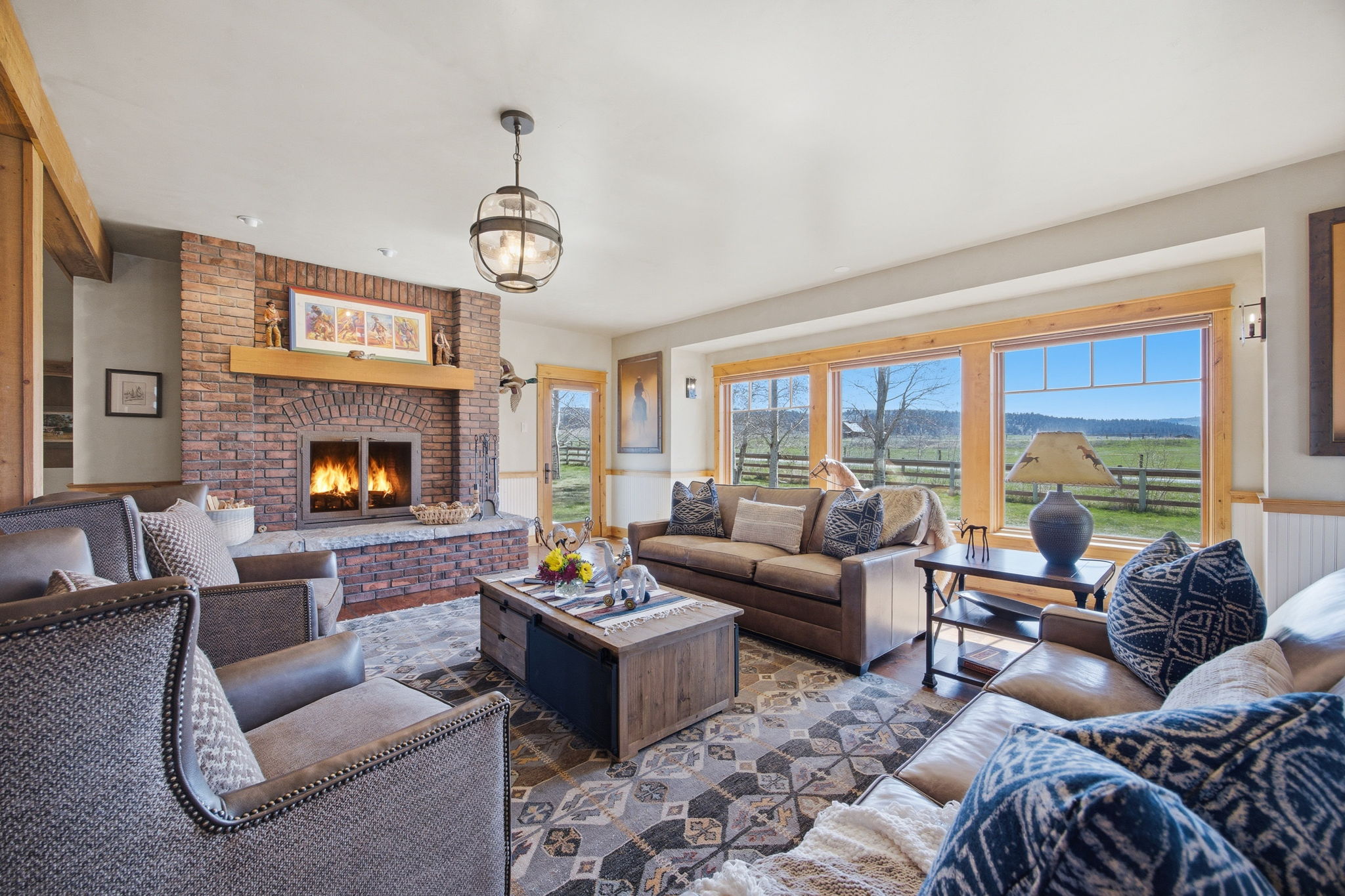 Positioned at the end of a quiet cul-de-sac within the coveted farmhouse enclave of Stock Farm Club, 351 Ogden Lane offers a rare combination of privacy, scale, and refined Montana living across 6.91 acres with sweeping views of the Bitterroot Mountains and valley. Thoughtfully designed as a multi-structure compound, the property creates a seamless balance between everyday comfort, guest accommodations, and exceptional entertaining. The 4,367 sq ft main residence features a well-appointed floor plan with a main-level primary suite, two additional bedrooms upstairs, and multiple living spaces designed for both connection and retreat. A private office with fireplace anchors the main level, while a second office and upper gathering room provide additional flexibility and elevated living. Expansive windows frame the surrounding landscape, bringing natural light and Montana's beauty into every space. A fully furnished 2-bedroom ensuite bunkhouse offers a private and turnkey guest experience, complete with a dining area and continental service space—ideal for hosting with ease. The newly constructed 3,650 sq ft barn is a standout feature, thoughtfully designed to combine equestrian functionality with an extraordinary entertainment environment. One side offers a two-stall barn with attached runs, tack room, and wash rack, while the opposite side showcases a dramatic gathering space with floor-to-ceiling windows, full service kitchen, wood-burning fireplace, cigar room, media room, game loft with full bar, hobby room, and full bath. Outdoor living is equally compelling, with covered dining areas, built-in BBQ, fire pit, fenced yard for dogs, and level acreage suitable for horses, all with direct access to the Stock Farm riding trail system. Additional features include air conditioning, natural gas, and high-speed fiber optic connectivity. This is a rare opportunity to own a private, amenity-rich compound within one of Montana's most sought-after communities.