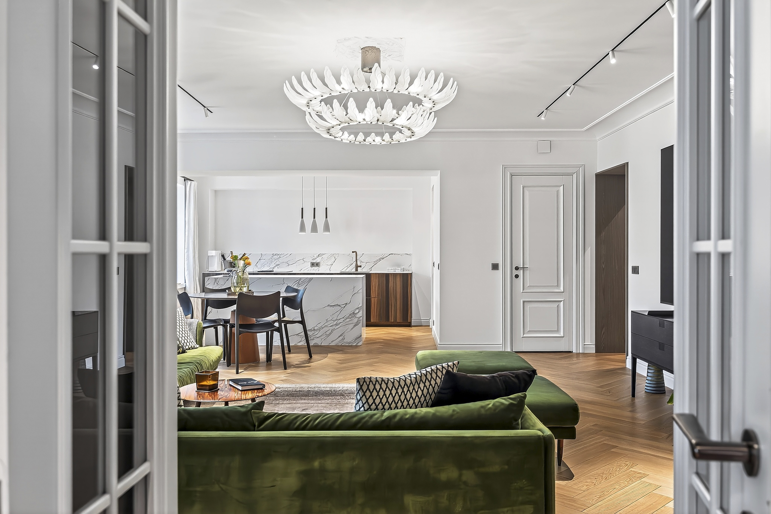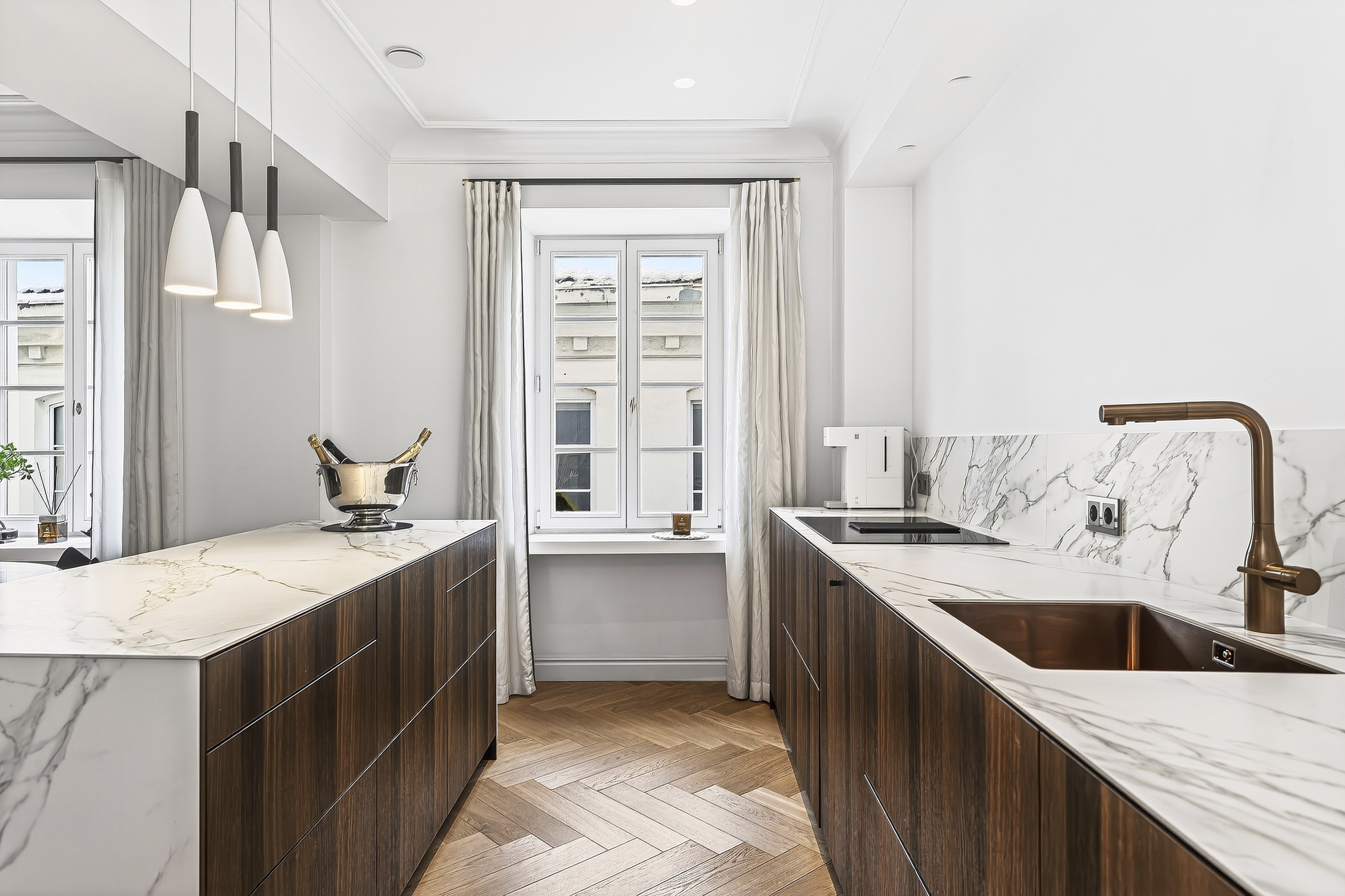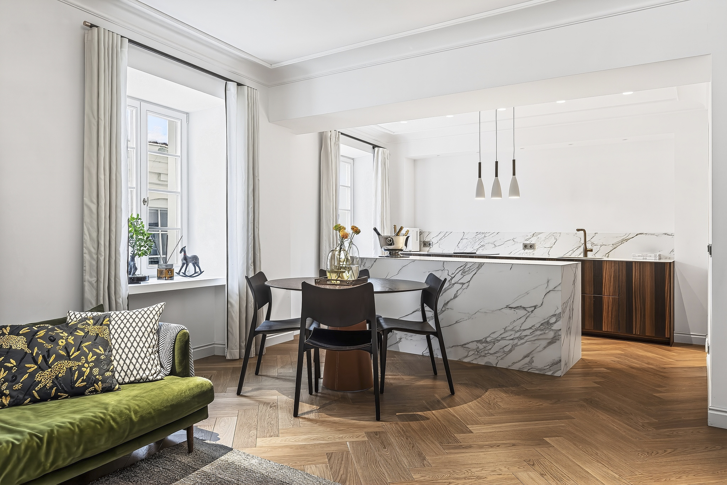 Luxury one-bedroom apartments for sale near Stiklių viešbutis, where space, comfort, and top-quality design come together. Every detail has been carefully crafted to ensure a lifestyle that is convenient, aesthetic, and harmoniously aligned with the rhythm of city living. Reflecting the spirit of the Old Town, the apartments are modernly equipped with underfloor heating, a heat recovery ventilation system, new double-glazed wooden windows, and warm oak floors. The luxurious German SieMatic kitchen comes with built-in appliances, an adjacent storage room, and a wine cooler. Italian furniture and lighting, along with other distinctive interior elements, create an elegant and timeless environment. The spacious bedroom features a private bathroom and a large walk-in closet. These apartments offer not only generous interior space but also an exceptional location: a cozy terrace opens onto an Old Town courtyard, while just steps away you will find prestigious restaurants, Senatorių pasažas, and Stiklių viešbutis. Living here is a unique opportunity to enjoy the charm and character of the Old Town.
