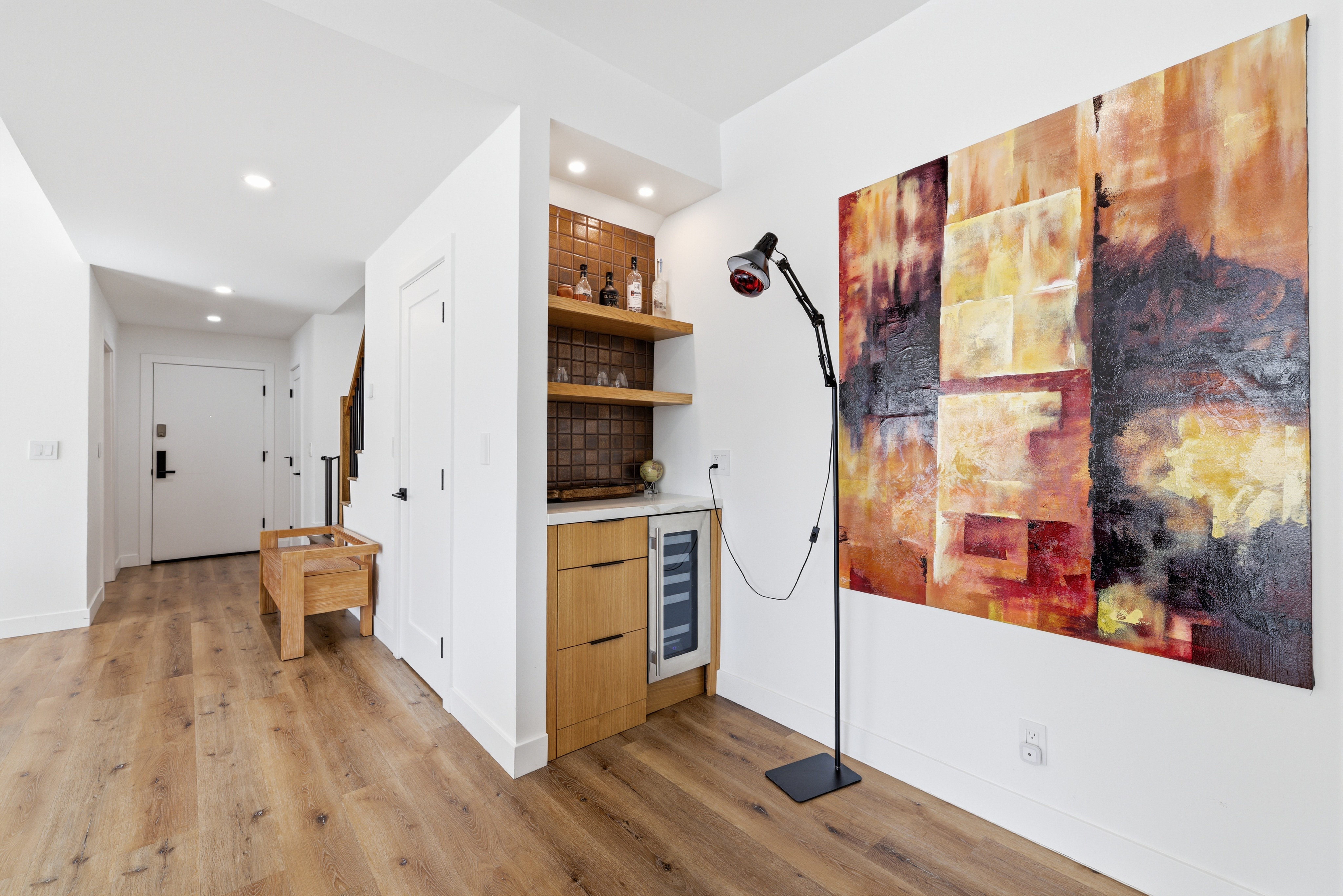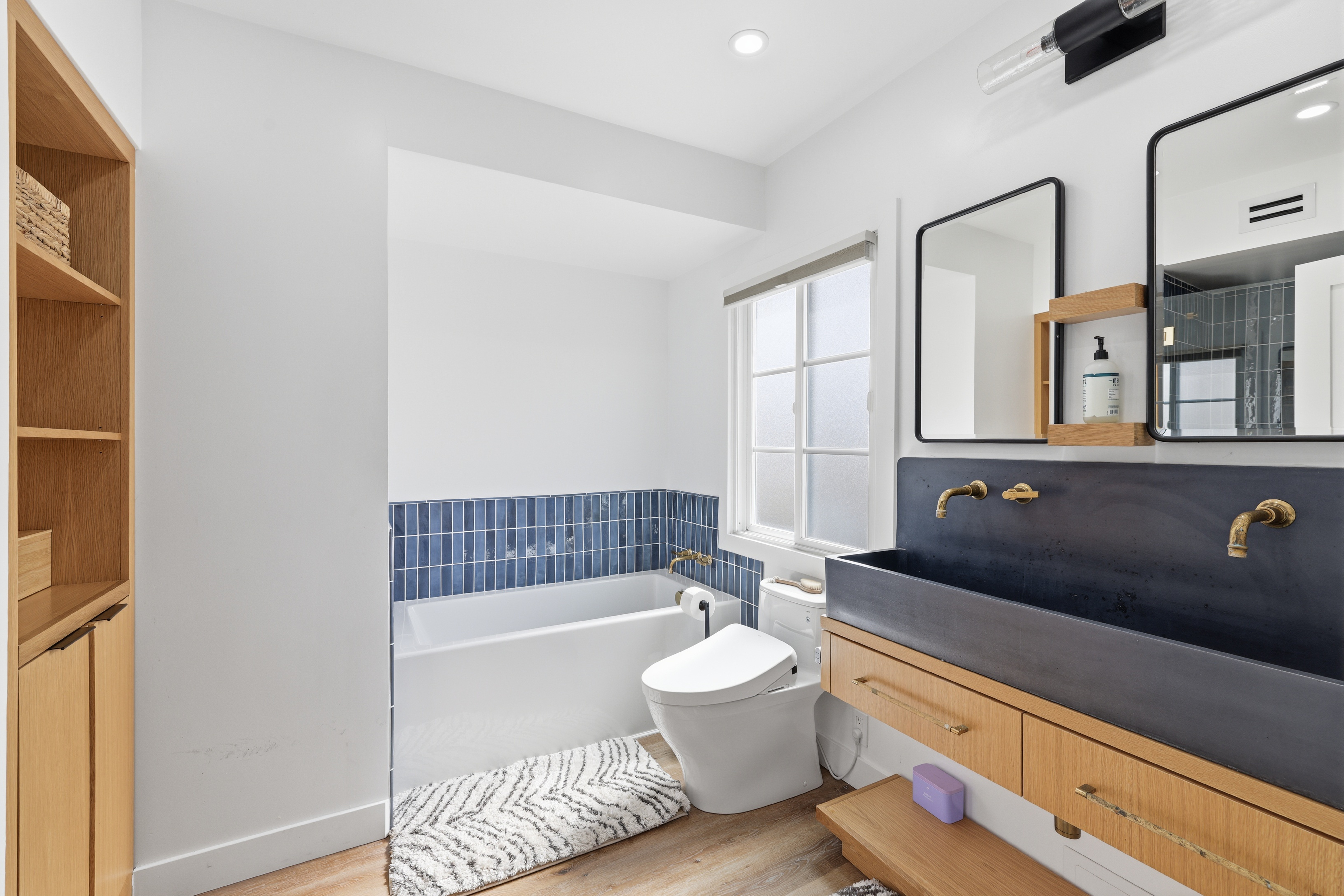 Completely remodeled with a focus on clean design and custom finishes, this 2-bedroom, 2.5-bath home offers a bright, open layout with abundant natural light and a true townhouse-style feel. The main level features wide plank engineered white oak flooring throughout, a spacious living and dining area with a gas fireplace, and a fully updated kitchen showcasing custom rift white oak cabinetry, quartz countertops, and Café appliances. A built-in dry bar with wine refrigerator adds both function and a thoughtful design element, along with a convenient updated powder room for guests. Upstairs, both bedrooms are en-suite, including a primary suite with vaulted ceilings, a walk-in closet, and a dual vanity bathroom with a separate tub and walk-in shower. The bathrooms have been fully remodeled with designer tile work, custom vanities, and updated fixtures. The secondary bathroom features a walk-in shower with full tile surround, glass enclosure, and modern finishes, while the secondary bedroom includes a custom Murphy bed, offering flexibility for guests or a home office. Additional features include a stackable washer and dryer upstairs, two tandem parking spaces, and a private patio enclosed with vinyl fencing, ideal for outdoor dining or BBQ. Located in a well-maintained 6-unit building just moments from Brentwood’s shops and restaurants along San Vicente and Montana Avenue.