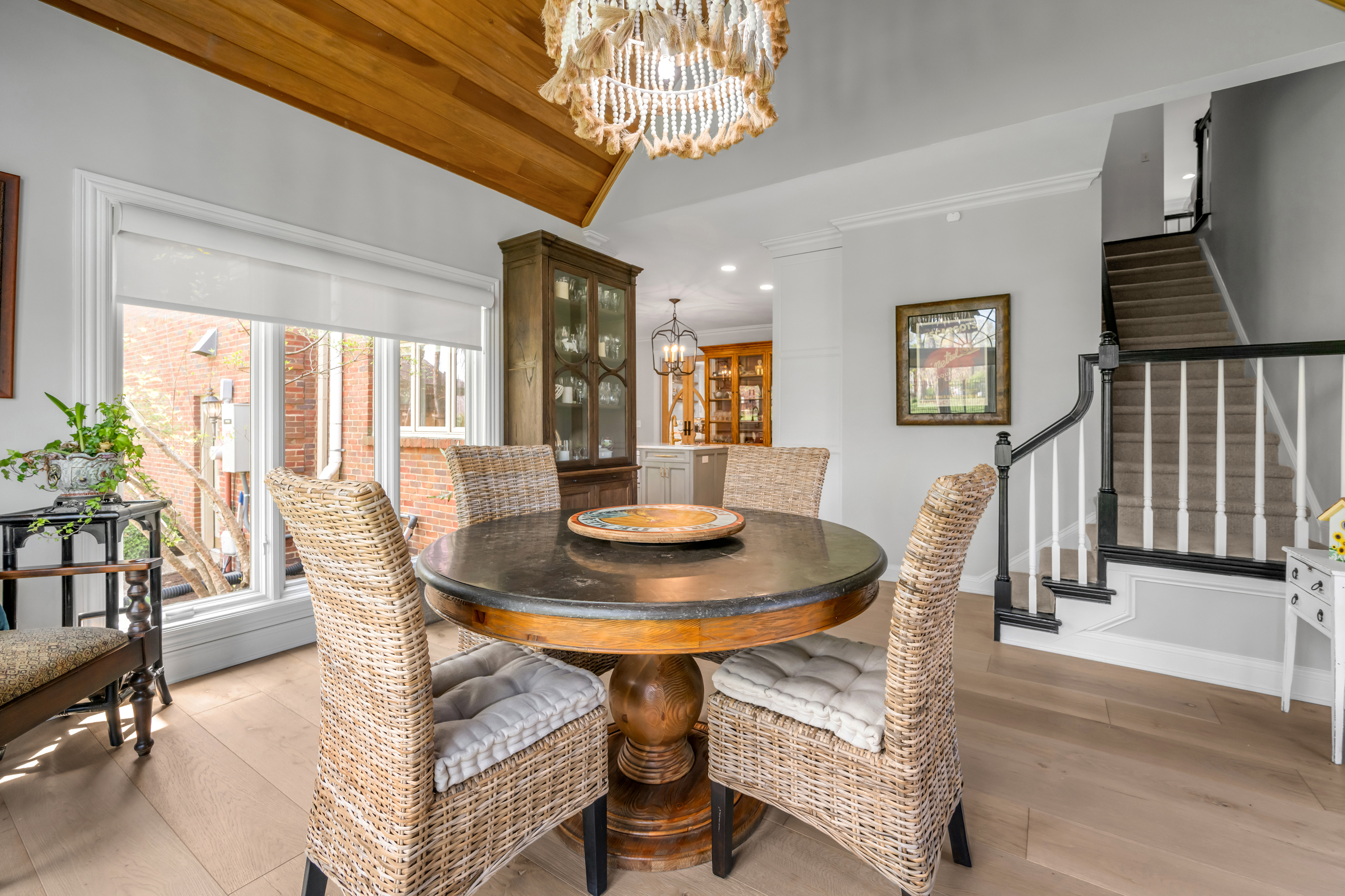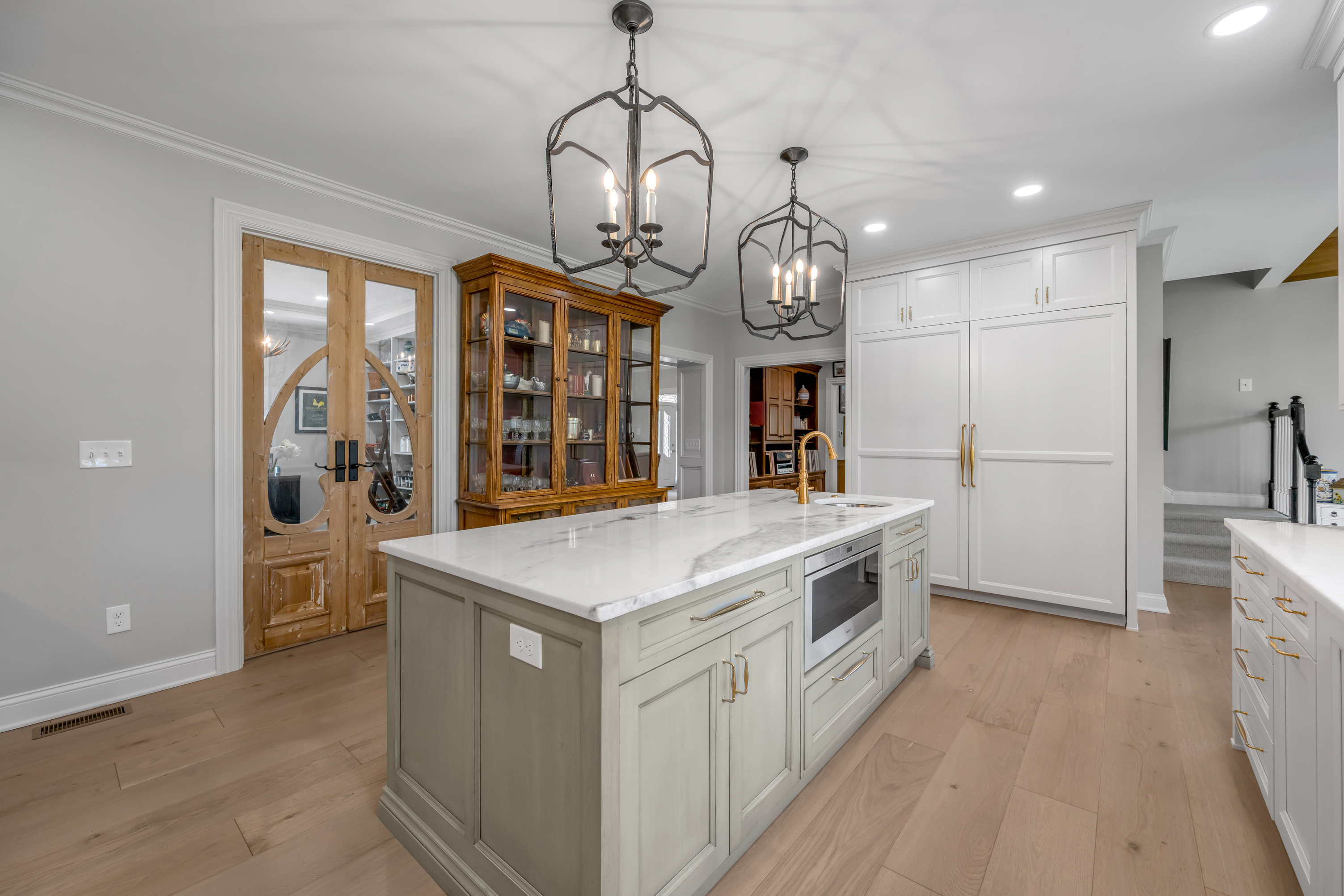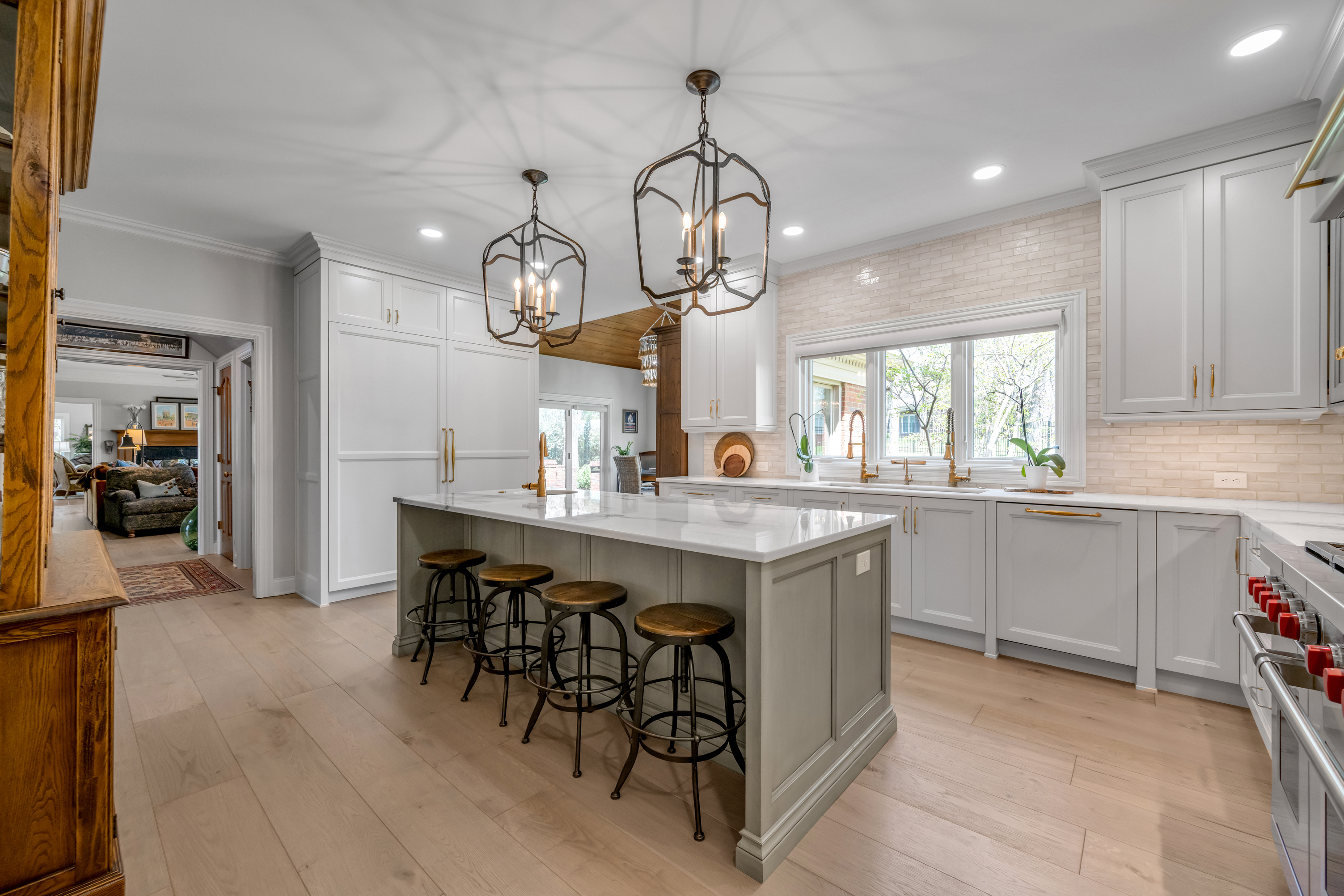 Tucked away on a quiet, tree-lined cul-de-sac in Hartland Estates, this home is the perfect blend of classic style and Southern charm. Step inside and you're greeted by a stunning two-story foyer with dramatic lighting that feels both elegant and inviting. Warm French oak flooring runs throughout the main level, adding a relaxed, lived-in feel. A gracious formal dining room seamlessly transitions into what can only be described as the heart of the home: a truly bespoke, designer kitchen where no detail has been overlooked. This one-of-a-kind culinary space, designed by Derrick Whitaker, is a masterclass in luxury and function. Marble countertops rest atop handcrafted cabinetry, complemented by a striking Moroccan tile backsplash. A custom-designed vent hood crowns the professional-grade 48-inch Wolfe range with pot filler. A full-size 36-inch Sub-Zero refrigerator and freezer, Wolfe microwave and warming drawer, and expansive stainless steel sink, outfitted with dual brass faucets and integrated accessories, reflects the kitchen's thoughtful design. Just off the kitchen, the breakfast room features a cathedral ceiling with stained tongue-and-groove wood, access to the back staircase, and doors that open directly to the patio. Tucked behind a set of circa 1850 French doors is a scullery, as functional as it is charming, with a beautifully restored cast iron sink, additional Bosch dishwasher, an abundance of shelving and cabinetry, plus a convenient drop zone. The main living space is built for both relaxing and entertaining, with a spacious family room featuring a fabulous wet bar—complete with an ice maker, beverage fridge, wine cooler, and a standout hammered copper sink. A double-sided fireplace connects the great room to a bright, oversized sunroom with terracotta tile. Both areas open right out to the patio, making indoor-outdoor living feel effortless. A dedicated office with rich wood moldings and built-ins offers a quiet, polished workspace. Upstairs, the primary suite offers loads of privacy with a separate sitting area—perfect for a quiet morning coffee or winding down at the end of the day. The ensuite bath offers a tiled walk-in shower, double sinks with a dedicated vanity space, and two walk-in closets so you don't have to share. Two additional bedrooms share a centrally located hall bath, while the third has its own private ensuite with a tiled walk-in shower. The finished lower level adds flexibility with a large rec space, full bath, and a cozy family room with fireplace—ideal for movie nights or game days—plus a large unfinished storage space. Outside, a brick paver patio overlooks the fully fenced yard framed by mature trees. A three-car side-entry garage and circular drive add both convenience and curb appeal. Meticulously maintained, the home has seen major updates including a new roof with copper flashing, a whole-house Generac generator, and a water filtration system. A rare opportunity to own a beautifully designed home in one of Lexington's most desirable neighborhoods—where every detail has been considered and every space feels like home.