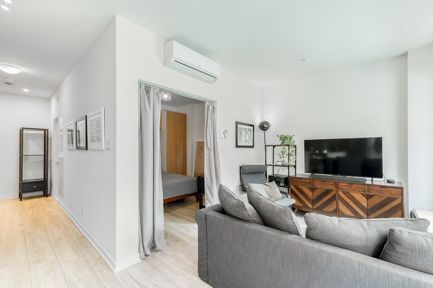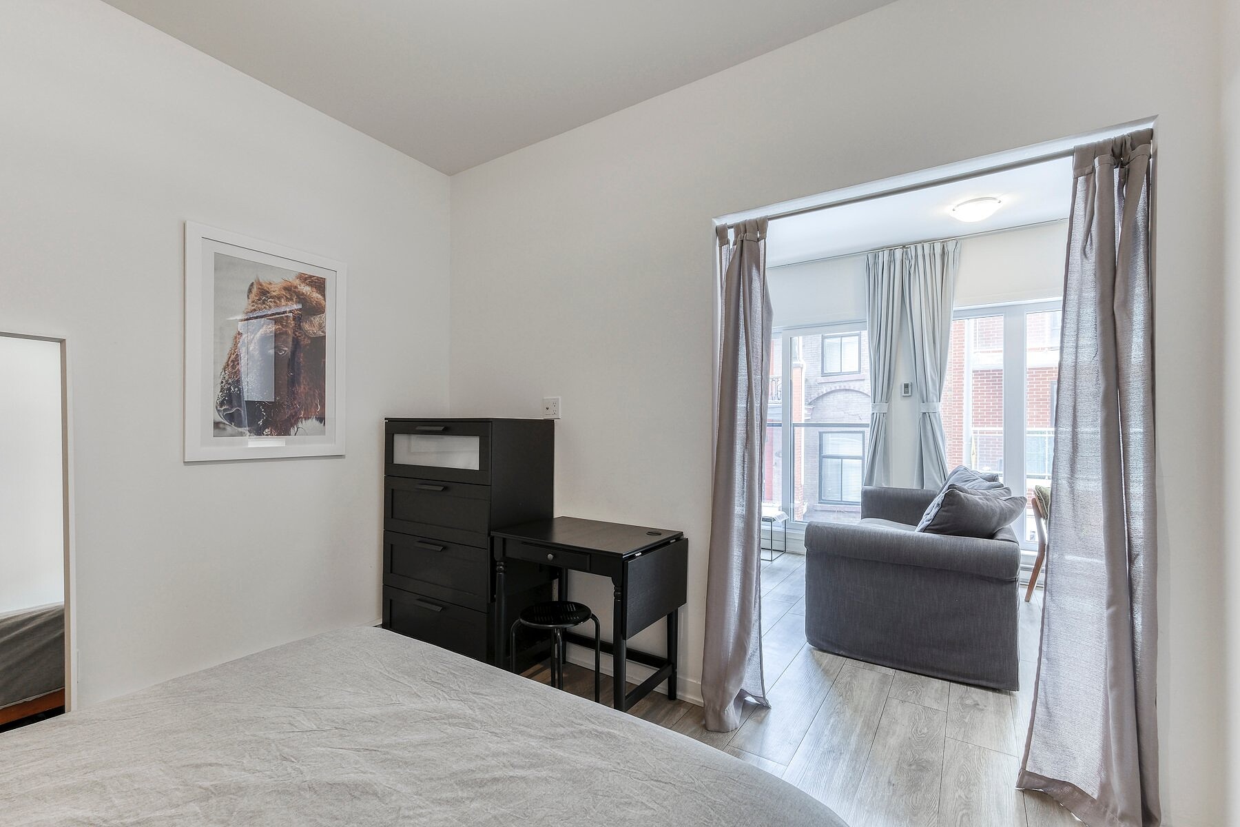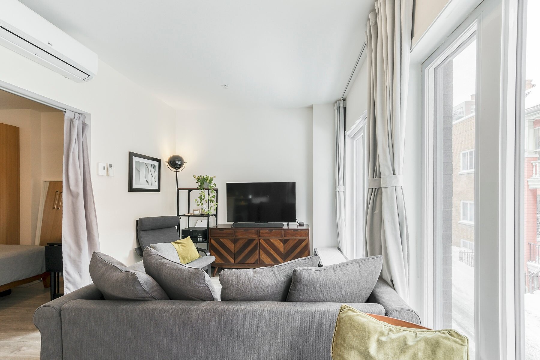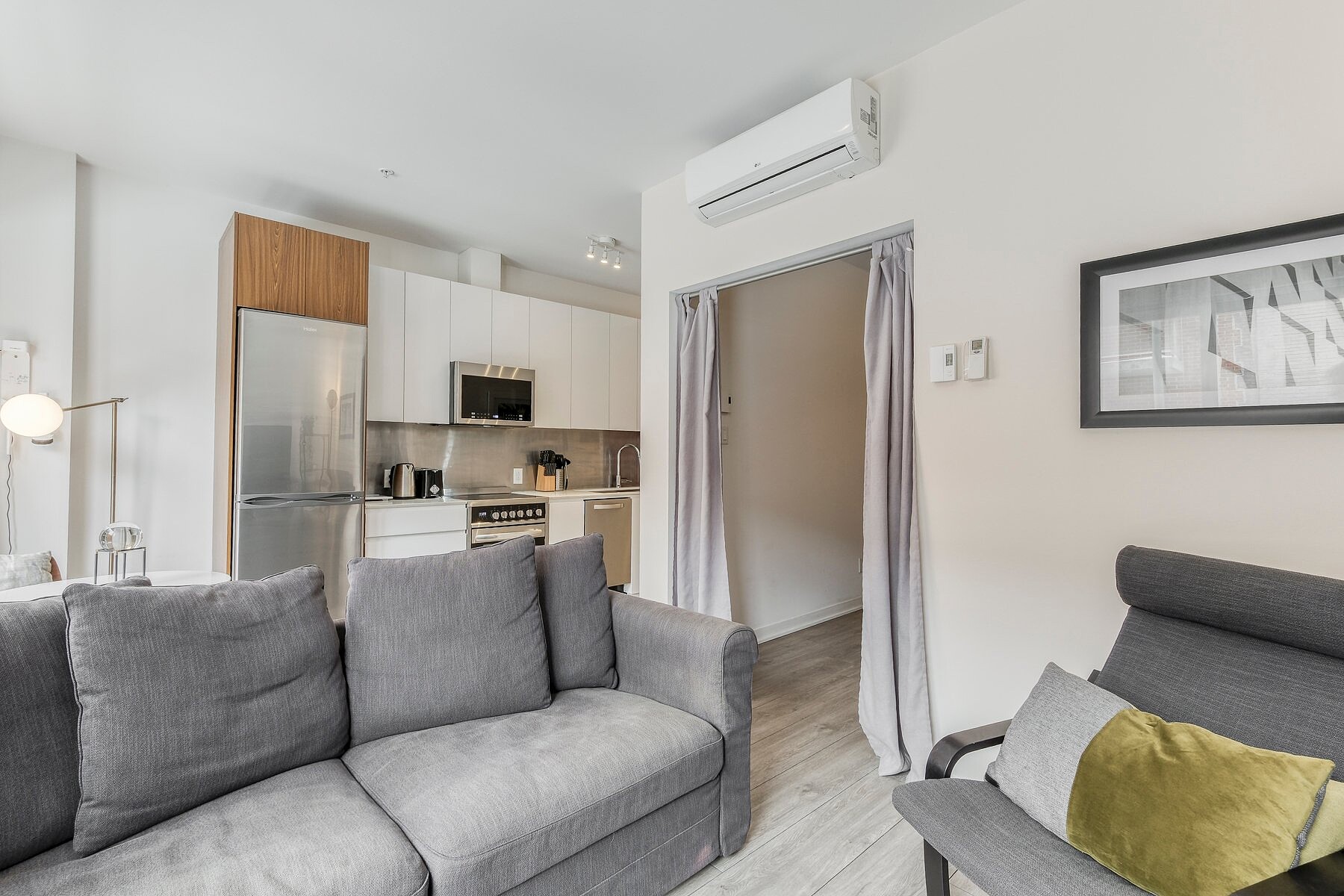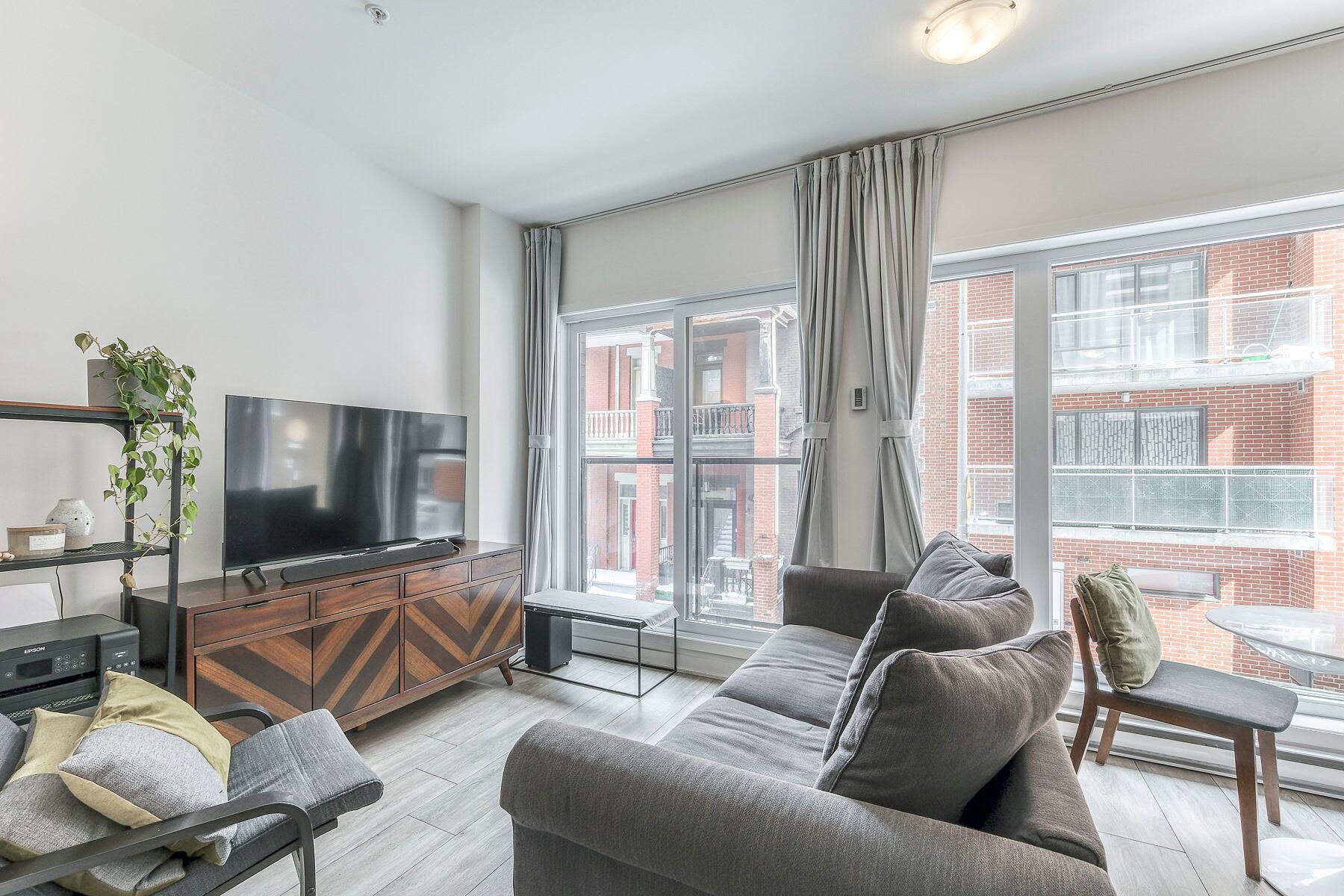Charming and stylish turnkey condo, fully equipped and furnished, bright and very well located in the heart of downtown! Open living space and abundant windows, large living room, practical kitchen with lots of storage, bedroom with closet, office area, modern bathroom, heat pump, locker in the basement, St-Laurent Metro station a few minutes away, the Quartier des Spectacles and major Universities and Colleges a few steps, close to all services on foot, restaurants, boutiques & shops, Bixi station. Short-term rental allowed! The perfect Pied-à-terre, available quickly!
