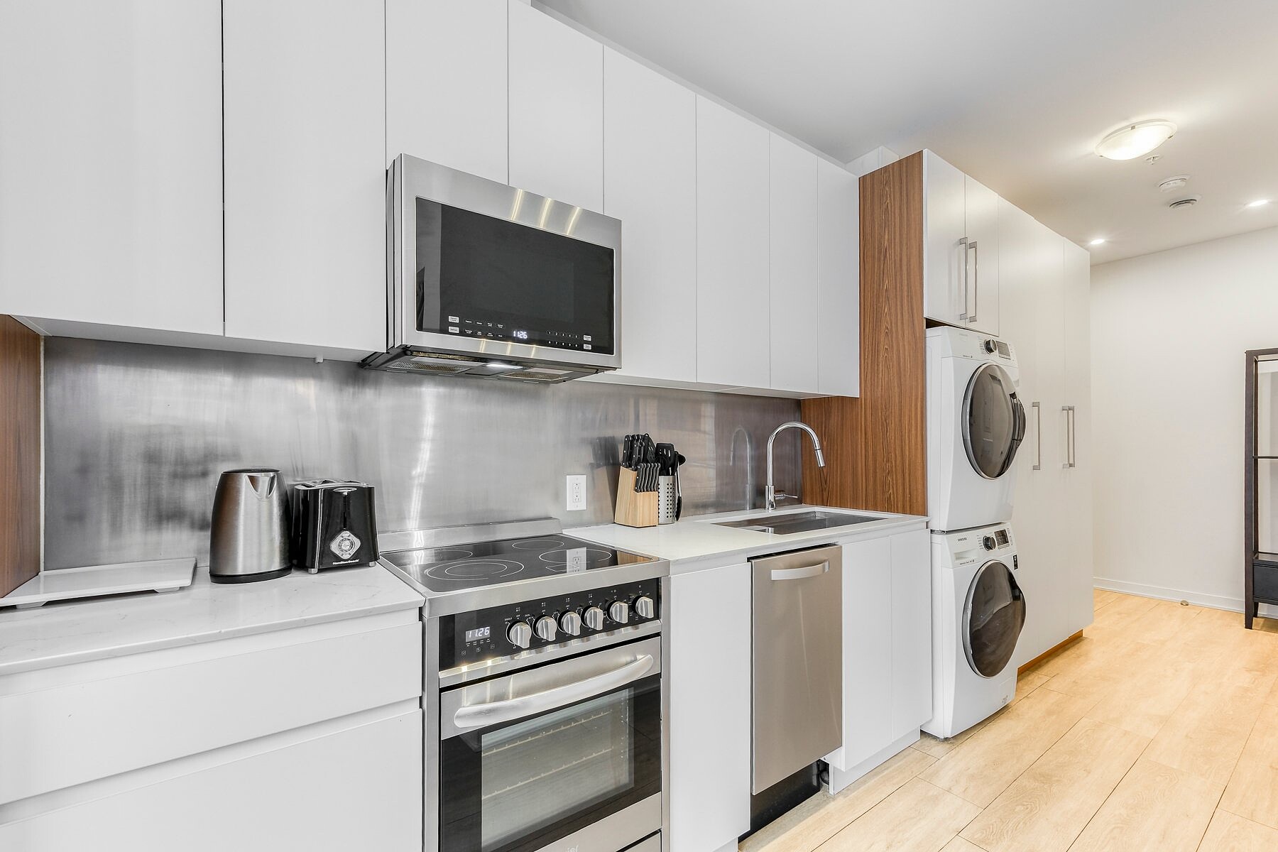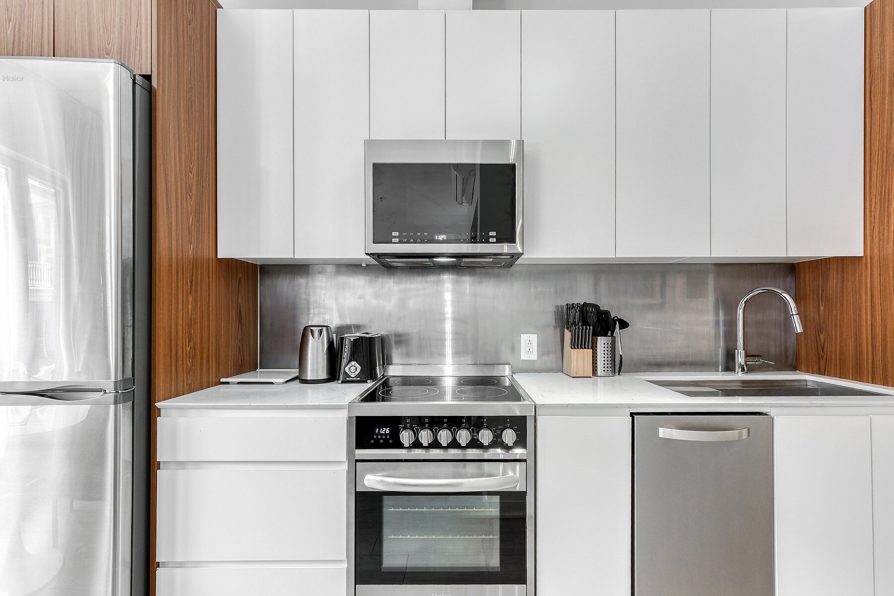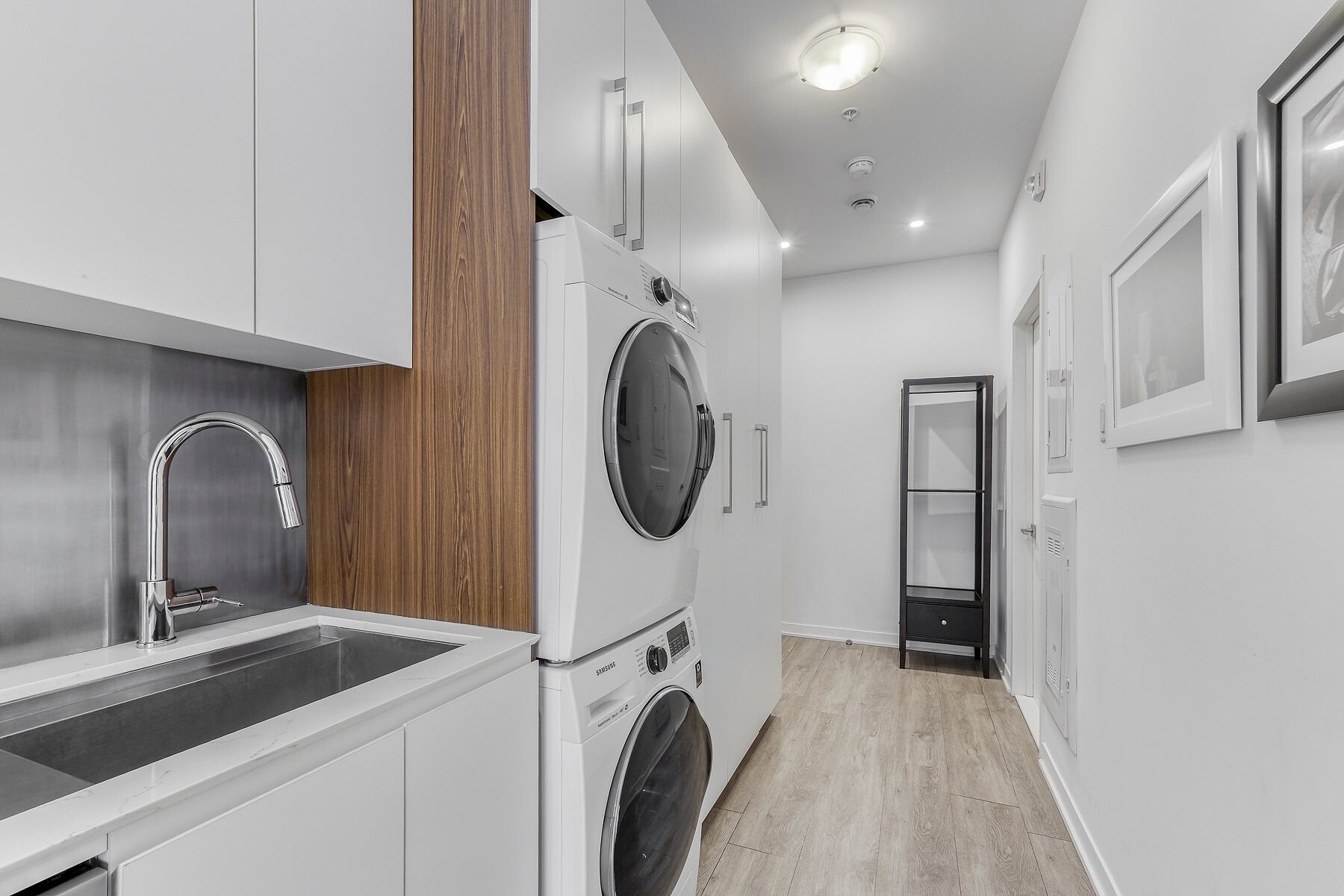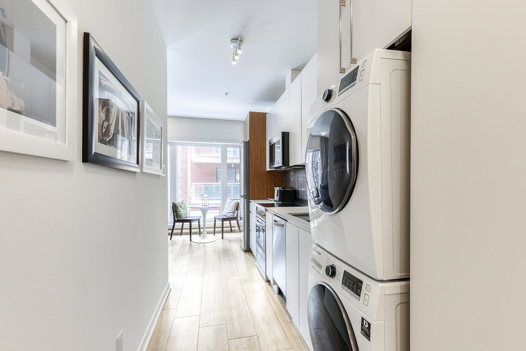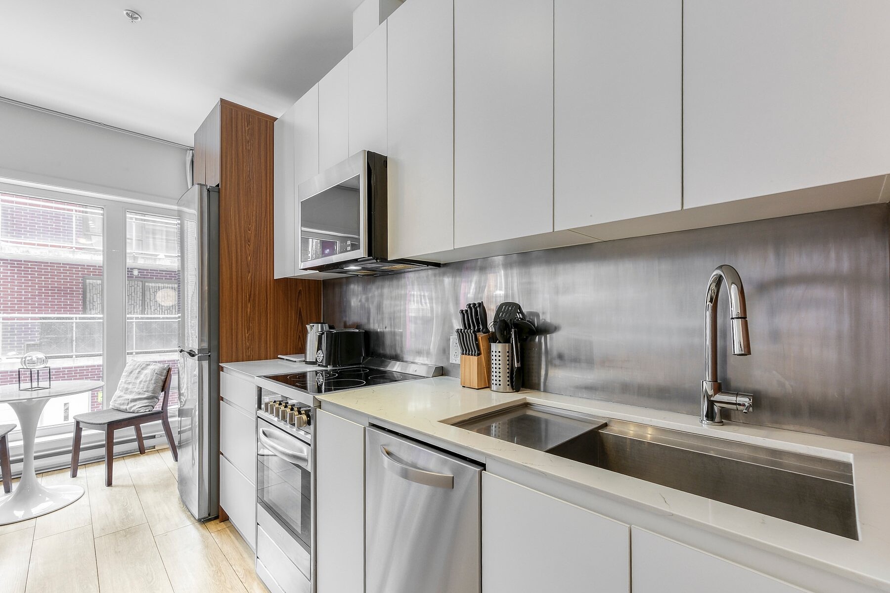 Charming and stylish turnkey condo, fully equipped and furnished, bright and very well located in the heart of downtown! Open living space and abundant windows, large living room, practical kitchen with lots of storage, bedroom with closet, office area, modern bathroom, heat pump, locker in the basement, St-Laurent Metro station a few minutes away, the Quartier des Spectacles and major Universities and Colleges a few steps, close to all services on foot, restaurants, boutiques & shops, Bixi station. Short-term rental allowed! The perfect Pied-à-terre, available quickly!