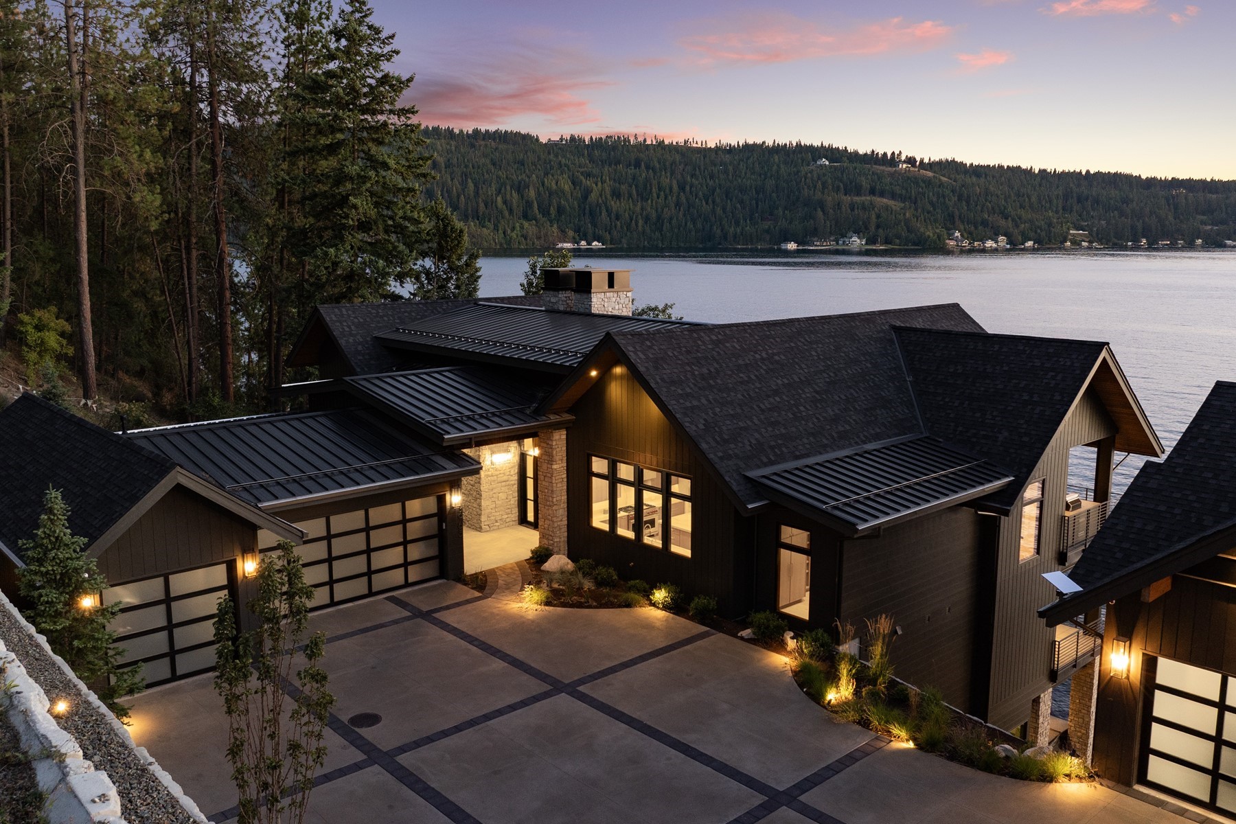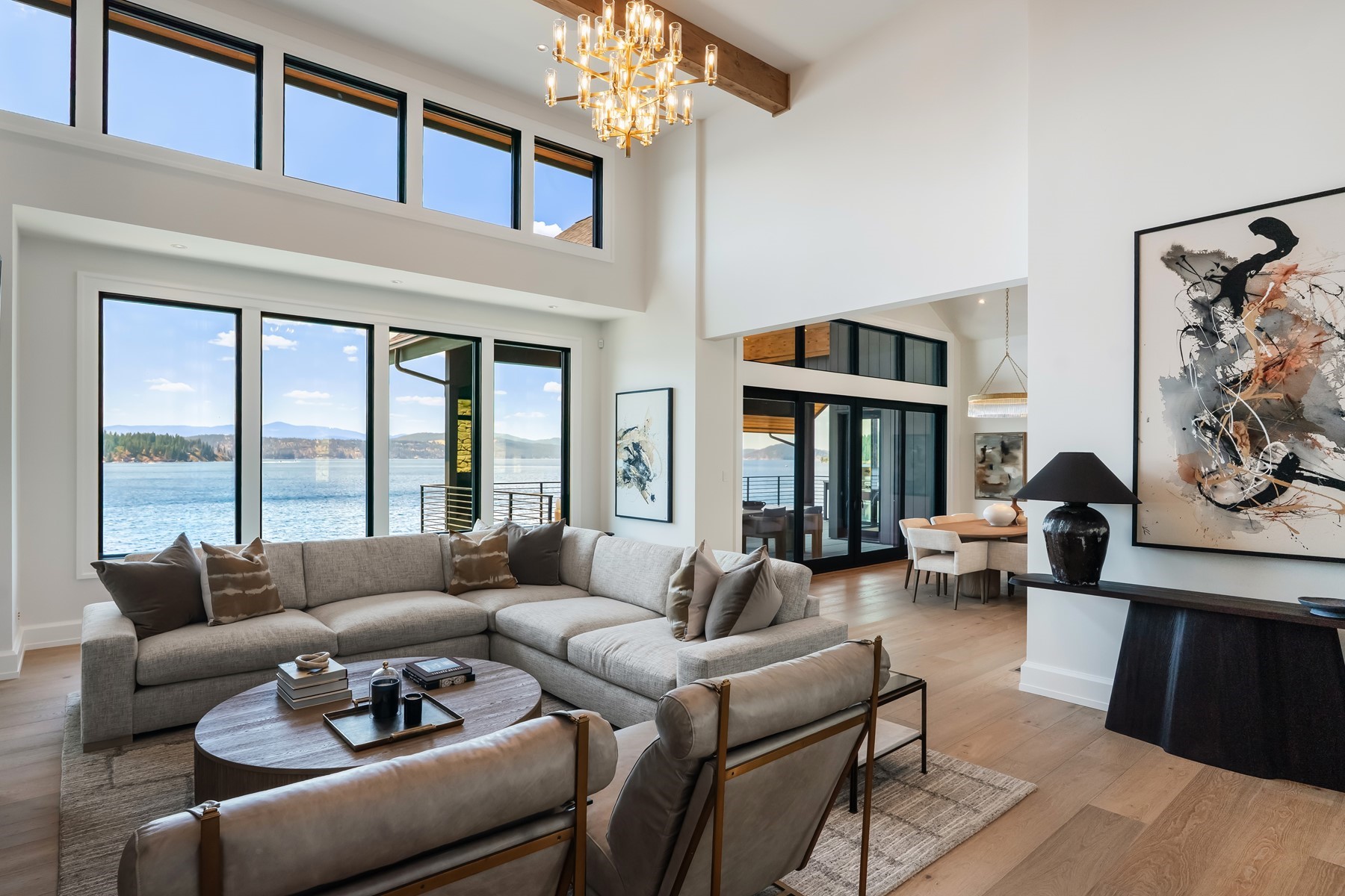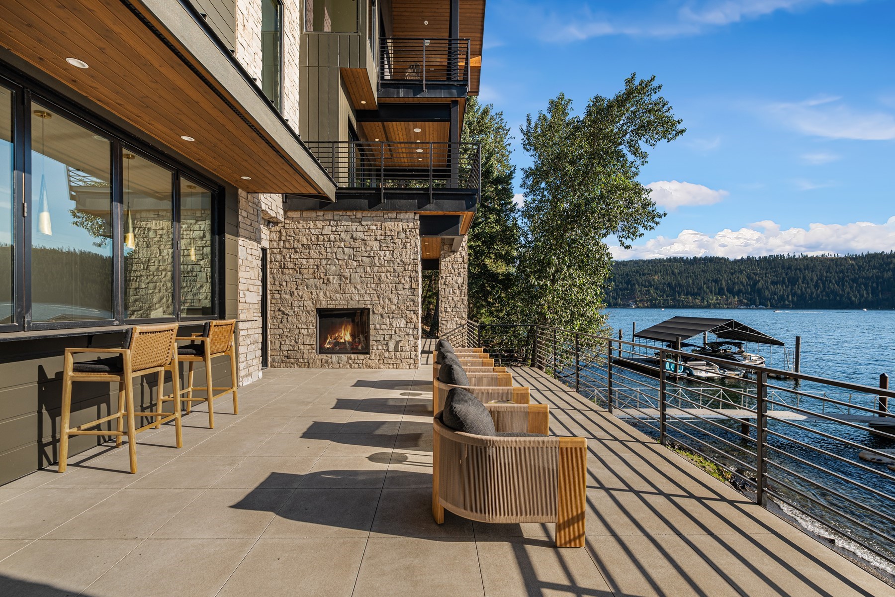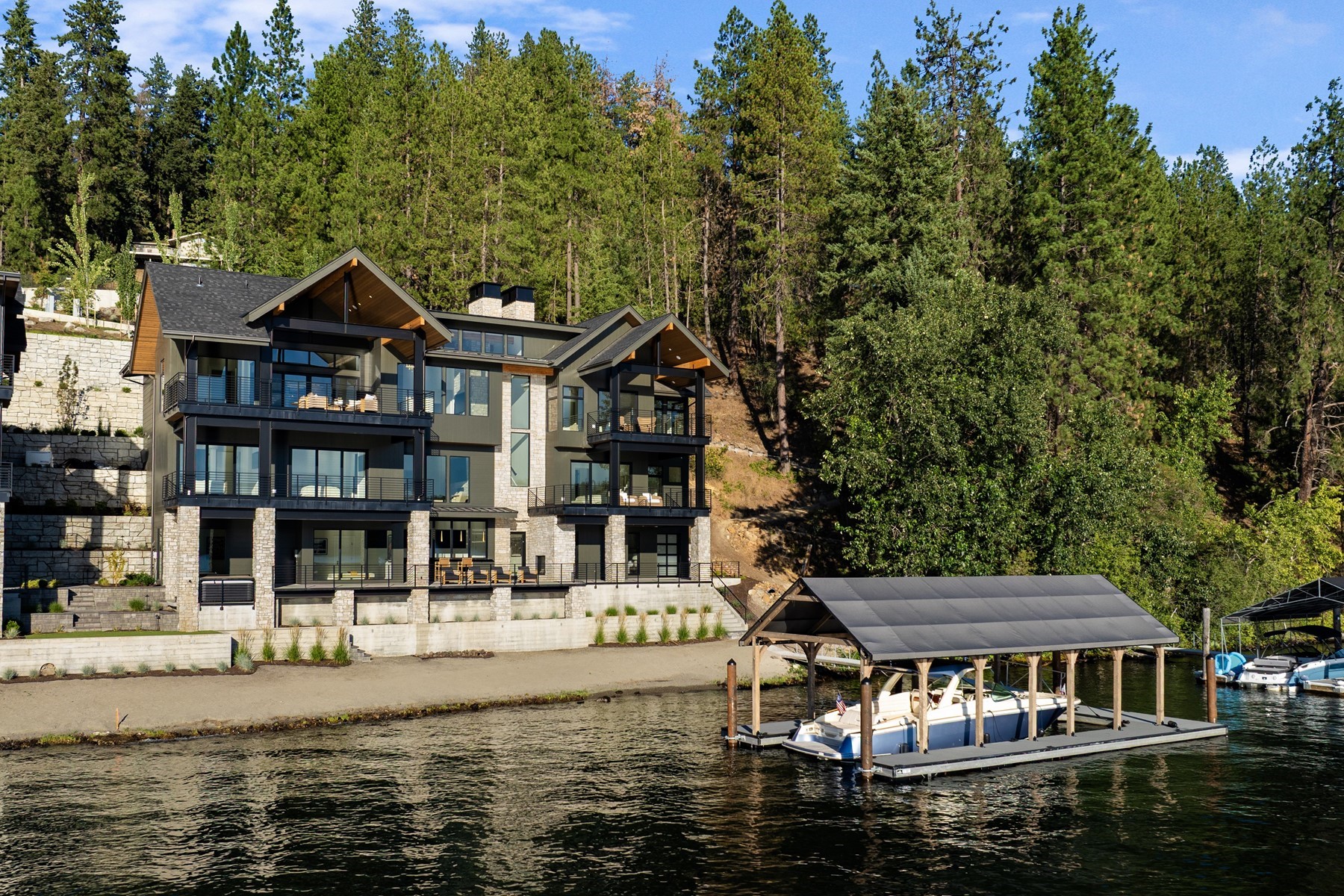 Experience extraordinary LAKEFRONT living in this 6500+ sq ft MOUNTAIN MODERN in Bennett Bay on Lake Coeur d'Alene, offering 113' of waterfront feet and a rare SANDY BEACH and low bluff to water with your private dock. Inspired design to capture sweeping Lake views from every room. The ultimate in Lake Living only 10 min to town with expansive decks, and seamless indoor-outdoor living. The great room showcases soaring ceilings, a statement fireplace, and walls of glass. A gourmet kitchen with SUBZERO and WOLF appliances, large quartz island, and walk-in pantry anchors the home. Entertain in the wine vault and tasting hall, theater, dual bars, and fitness room. The primary suite Boasts a spa bath with Carrara marble, walk-in closet, and lakeview deck, complemented by three en-suite guest rooms. Elevator access, hot tub, and 3-car garage complete this exceptional offering minutes from downtown Coeur d'Alene.Live your best life