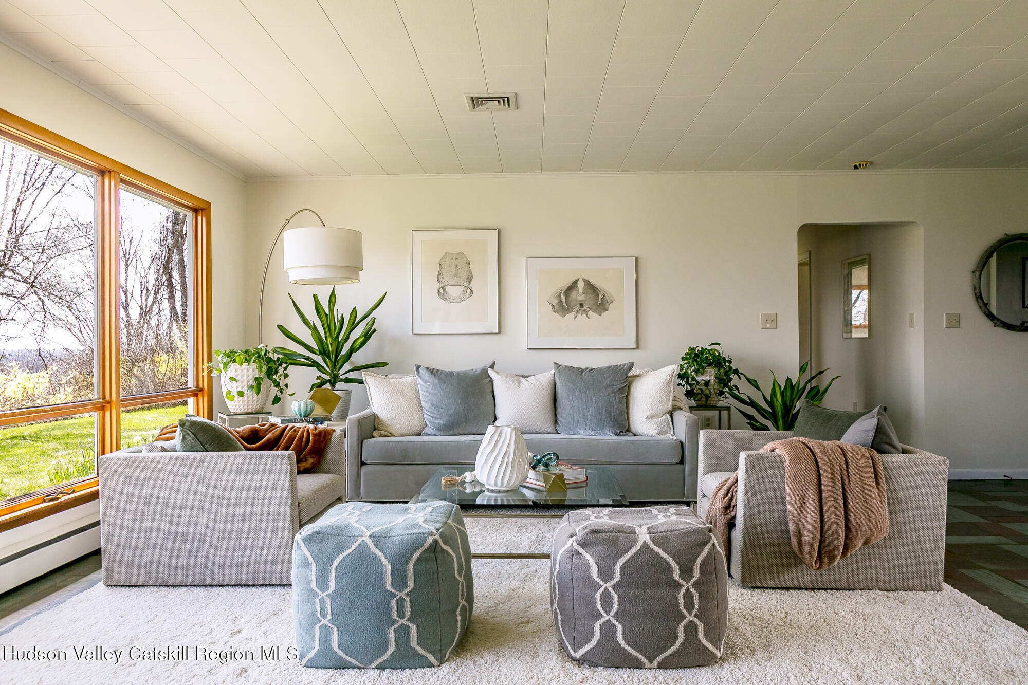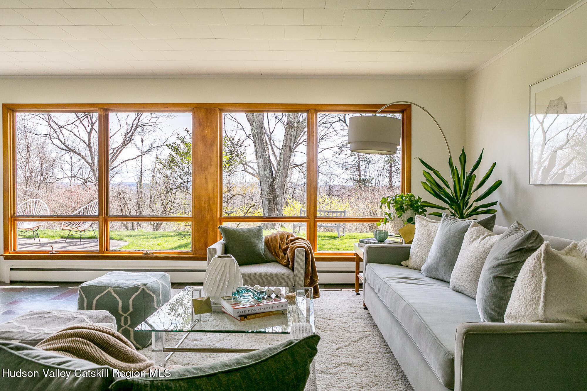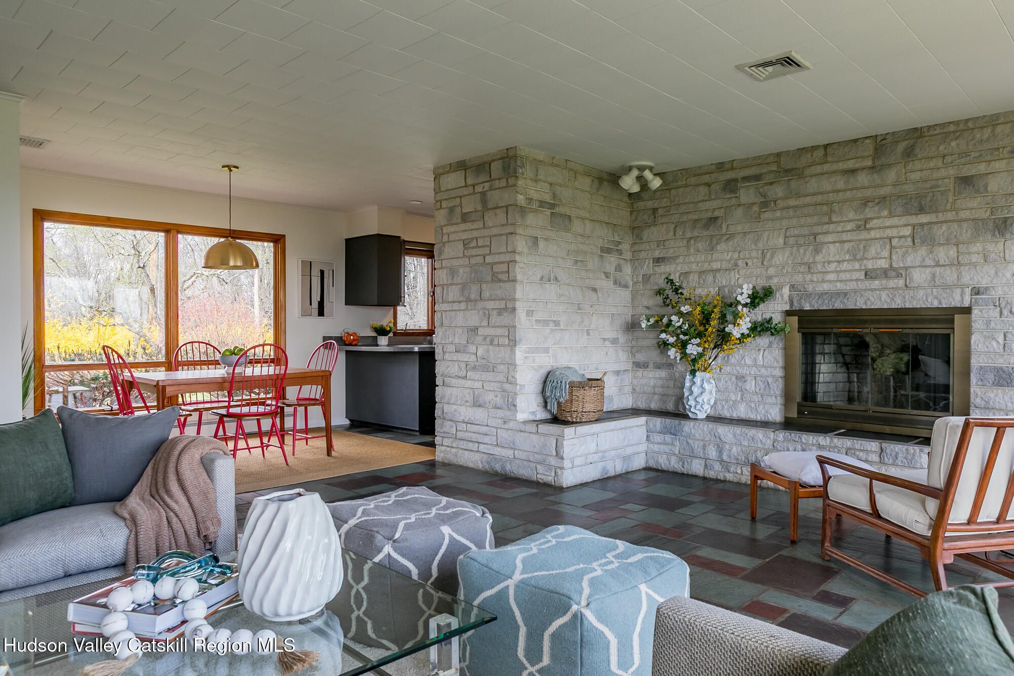 THE ''LOOKOUT HOUSE'' A Mid-Century Ranch Retreat in the Heart of the Hudson Valley Lovingly named The ''Lookout House'', this striking mid-century ranch sits confidently perched overlooking endless landscape of the Hudson Valley. The three-bedroom, two-bathroom, single floor home spans approximately 1600 feet. It also offers a two-car garage and tremendous storage. The soul of the home is its great room, where floor-to-ceiling windows dissolve the boundary between interior and landscape, framing panoramic views of the mountains and the rolling terrain of Wallkill. A commanding stone wood-burning fireplace anchors the space with warmth and timeless appeal, its generous bench seating an invitation to linger on crisp winter evenings, a hallmark of mid-century design at its most livable. The kitchen is both functional and full of potential, offering abundant storage, a breakfast peninsula perfect for casual gatherings, a wall oven, cooktop, dishwasher, and double sink. A sunny dining area flows naturally from the space, while an adjacent laundry and mudroom with additional pantry provides seamless transition to the attached two-car garage. The sleeping quarters are thoughtfully arranged along the home's generous footprint. Three bedrooms offer comfort and privacy, including a serene primary bedroom with walls of glass that capture the sweeping views beyond. There is a second bedroom offering an en suite bath and walk-in closet and finally, a third bedroom that can comfortably accommodate a Queen-sized bed plus additional furniture. A second full bath features a tub/shower combo, a newly updated, oversized vanity and additional storage in the linen closet. Completing this remarkable home is a luminous all-season room featuring a wall of windows drawing in natural light year-round, opening to a private backyard and patio ideal for al fresco entertaining or quiet contemplation of the landscape. Outside a sculptural spiral staircase ascends to a private lookout perch, where sweeping vistas of the countryside unfold in every direction -- a feature as poetic as it is rare. Mechanical highlights include central air conditioning, a whole-house generator, a newer roof, and an efficient Buderus furnace, ensuring comfort and peace of mind across every season. Perfectly positioned on a quiet country road, the property offers near-instant access to the very best the Hudson Valley has to offer: the charm of Gardiner, Wallkill, and Pine Bush; acclaimed wineries and craft breweries including Angry Orchard; the natural grandeur of Minnewaska State Park, Mohonk Mountain House, and the Shawangunk Grasslands National Wildlife Refuge. Chapel Field School and Blue-Chip Farm are just down the road, and major commuter routes are easily within reach. Whether sought as a forever home, a savvy investment, The ''Lookout House'' is a rare opportunity to own something genuinely irreplaceable, a home with a soul, a view, and a story all its own.