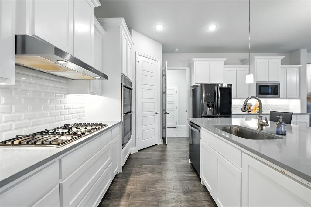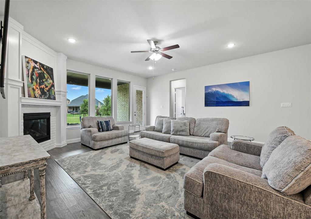 LIKE-NEW SPRAWING SINGLE-STORY LOADED WITH UPGRADES ON A QUIET CUL-DE-SAC STREET, located within the award-winning ARGYLE school district! This home has recently been painted and is move-in ready! Discover a home styled to perfection, graced with a Brilliant smart home system, extensive wood flooring, 6-panel interior doors, plantation shutters, crown molding, a cozy fireplace & a home office with French doors. Inspire your inner chef in the modern kitchen boasting white cabinets, quartz countertops, stainless steel appliances, a double oven, a 5-burner gas cooktop, under cabinet lighting & an island with a breakfast bar. Pamper yourself in the secluded primary suite featuring a bay window sitting area, soaking tub, separate shower, dual sink quartz vanity & a walk-in closet with built-ins, or entertain family & friends in the private media room wired for surround sound. Spend time outdoors in your spacious backyard, including a large covered patio & gorgeous greenbelt views, or take advantage of the tandem 3 car garage, ideal for oversized vehicles. Trailwood Residents have access to a community pool, playground & park. Take a first-person look at this gorgeous home!