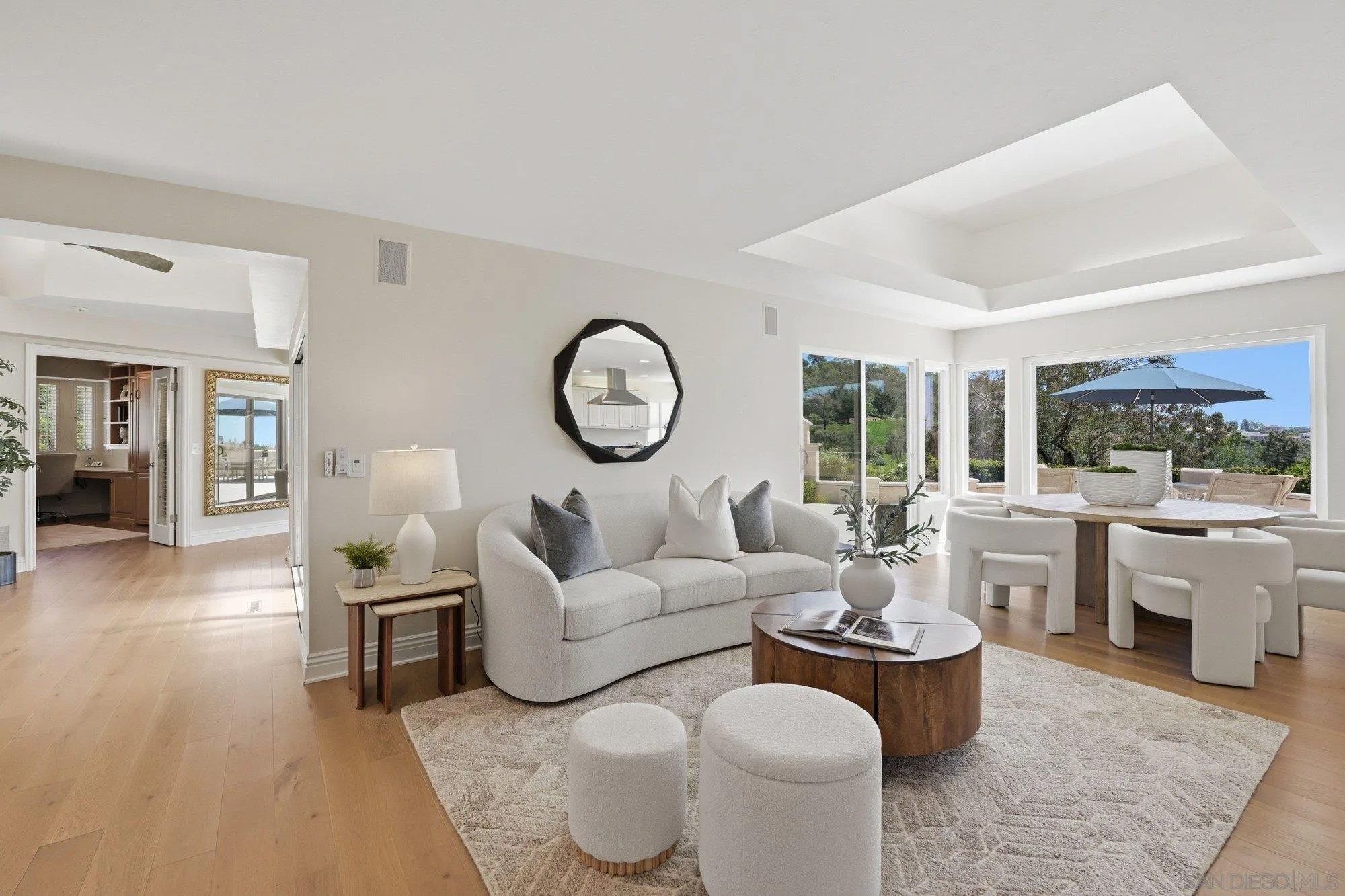 An extraordinarily rare offering, this Summit home is discreetly set at the end of a long private driveway, delivering a level of seclusion unlike anything within the community. Beautifully situated to capture southerly views of the bay and downtown skyline, this exceptional single-level residence offers a rare blend of privacy, space, and natural light. Beautiful hardwood floors and vaulted open-beam ceilings create a warm yet airy ambiance throughout the home. The thoughtfully designed floor plan features three bedrooms in the main house, including a luxurious primary suite complete with an expansive spa-like bath and spacious walk-in closet. A separate wing - currently configured as a home office and gym - offers two additional potential bedrooms, accessible through the primary bath as well as a separate exterior entrance, providing flexibility for guests, work, or wellness. Step outside to a spacious back patio ideal for entertaining and enjoying the view with built-in BBQ, multiple seating areas, outdoor fireplace and a putting green for year-round enjoyment. Plus, fantastic proximity to The Summit's community amenities including: two pools, spa, tennis courts, sport court, exercise room, playground and clubhouse!