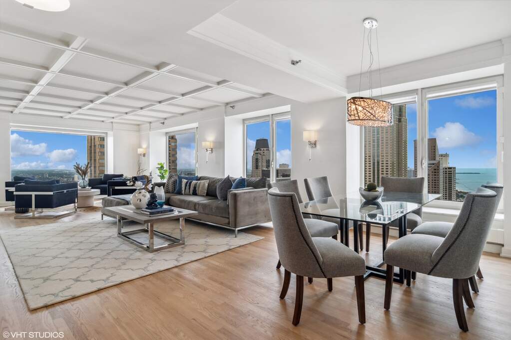 SPECTACULAR CORNER RESIDENCE IN THE HEART OF MAG MILE! This ONE-OF-A-KIND COMBINED HOME offers STUNNING LAKE & SKYLINE VIEWS from every window and incredible natural light throughout. A COMPLETE DESIGNER REMODEL (2023) showcases thoughtful details including designer lighting, Calacatta marble window sills, hardwood floors throughout, central humidification system, a wenge wood bar, and custom coffered ceilings. The CONTEMPORARY EAT-IN KITCHEN features a breakfast bar, custom European cabinetry, and fully integrated SubZero/Wolf appliances. Spa-inspired MARBLE BATHS include custom vanities, timeless tilework, frameless glass, and a floating soaking tub. Abundant storage and a MODERN SPLIT-BEDROOM FLOOR PLAN create effortless flow and everyday comfort. A truly SENSATIONAL HOME in one of Chicago's most iconic locations.