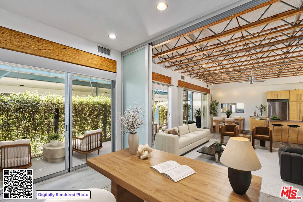 Defined by its striking industrial-modern design and exceptional outdoor living, this reimagined 3-bedroom plus den, 3-bath residence offers a rare opportunity to experience elevated Venice Beach living. With 2,654 of interior space, this home immediately captivates with soaring 9+ foot ceilings, dramatic volume, and sun-drenched interiors framed by beautiful wood beam accents. The open-concept living, dining, and kitchen area flows seamlessly through sliding glass doors to a private, lush balcony, creating a true indoor-outdoor lifestyle. Additional outdoor spaces include an expansive rooftop deck with room for dining and lounging areas. A flexible bedroom off the main living area easily functions as a home office, gym, or creative studio. Designed with both comfort and versatility in mind, the layout features three generously sized bedrooms, including a gracious primary suite with a sitting area, abundant natural light, and a spa-like bathroom with an oversized shower and bench seating. Ideally located just a few blocks from Abbot Kinney Boulevard and favorites like Felix Trattoria, Gjusta, RVR, and Alisa Wine & Friends, and just a 15-minute walk to the iconic Venice Beach Boardwalk, this home places you at the center of the best of Venice living while offering the privacy and space of a true residential retreat. Images shown are of a similar unit and are for illustrative purposes only. Images have been virtually staged.