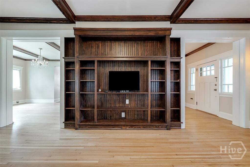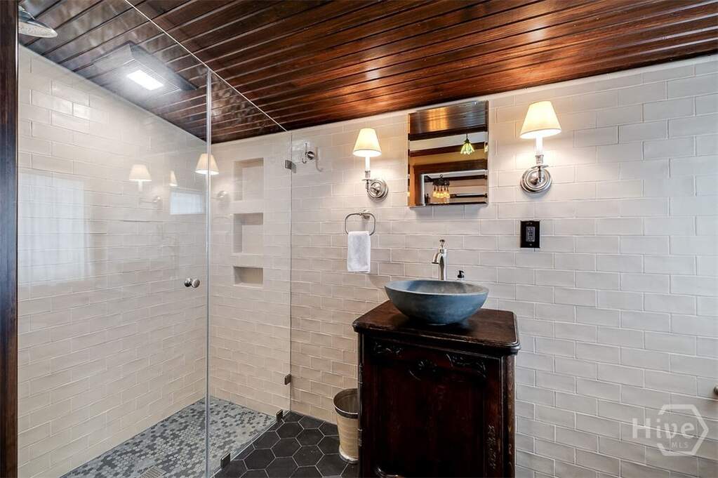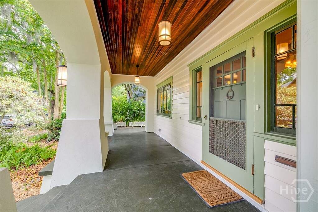 With its broad, deep wrap around porch, large walk-out balcony, screen porch, new porch with copper roof off the kitchen and fully fenced rear yard, this Craftsman home is built for enjoying our beautiful Savannah climate. Restoration work in 2024-2025 and a recent new rear porch and custom fenced rear yard, this home is a beauty. Just a block from Guckenheimer Park on tree-lined 45th St. this unique gem stands among some of the best Historic Ardsley Park homes. Electric has been updated, plaster has been repaired and original Heart Pine woodwork refinished and varnished throughout. Antique Arts & Crafts light fixtures grace the home with Quezal, Steuben & slag glass shades. A massive brick fireplace, ceiling beams & built-in bookshelves in the living room create a warm, inviting atmosphere. Two additional sitting rooms offer flexibility, & there is a new full bath with shower on the main. The kitchen has Maple cabinets and granite counters. The upstairs primary bedroom has a fireplace, an ensuite bath with a tub/shower combo, a dressing room & two closets. Two additional bedrooms feature large closets; one has a trunk room ideal for office use. The second bath is fully tiled with a tub & separate shower. The generous front porch & walk-out balcony features a new built-in copper gutter, historic railing & copper capped pergola. Add your own touches and enjoy this beautiful home!