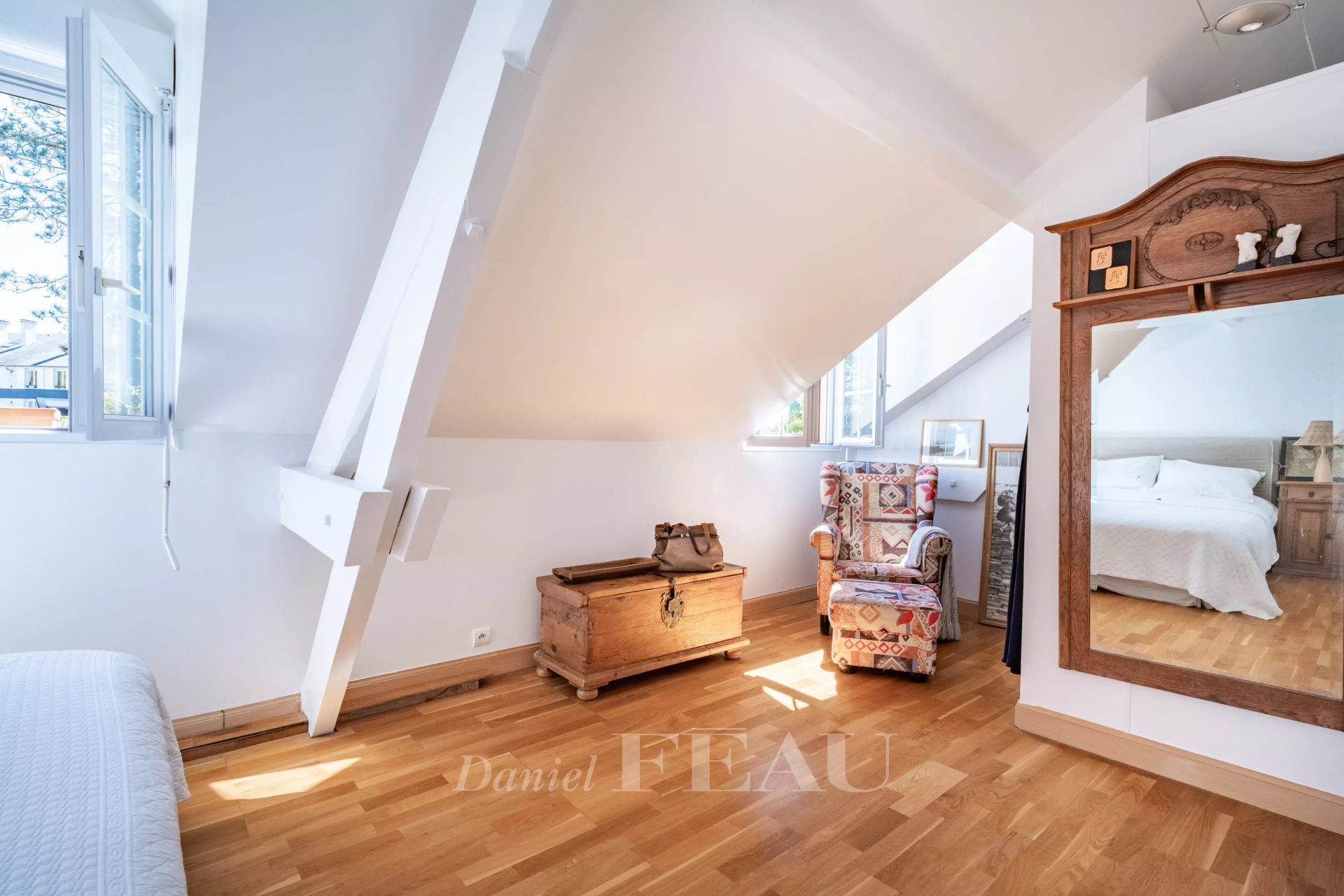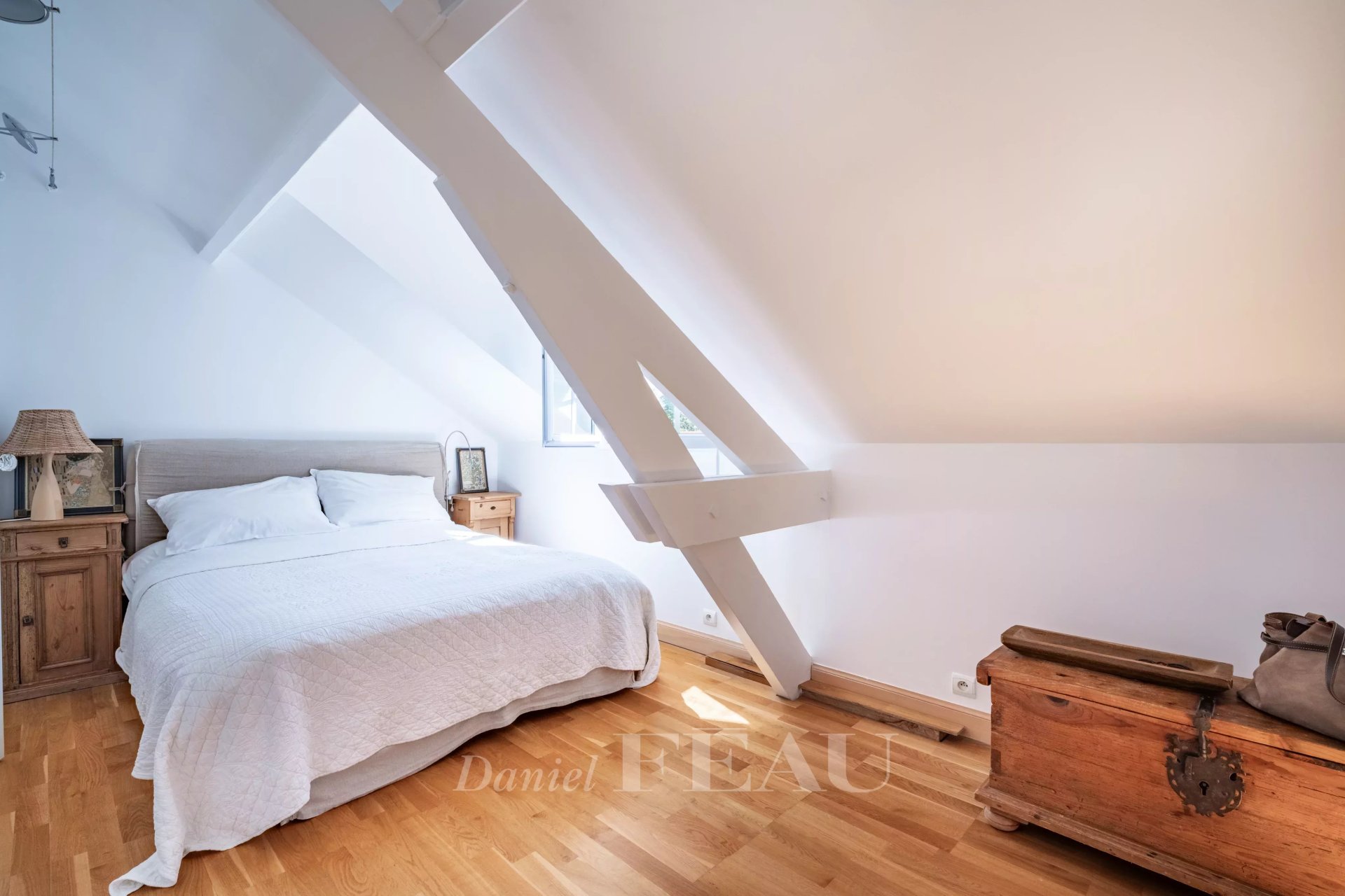 First floor: Three attic bedrooms, one with a dressing room, a bathroom with double vanity unit, and a study. All rooms benefit from new Velux windows fitted with sun blinds.