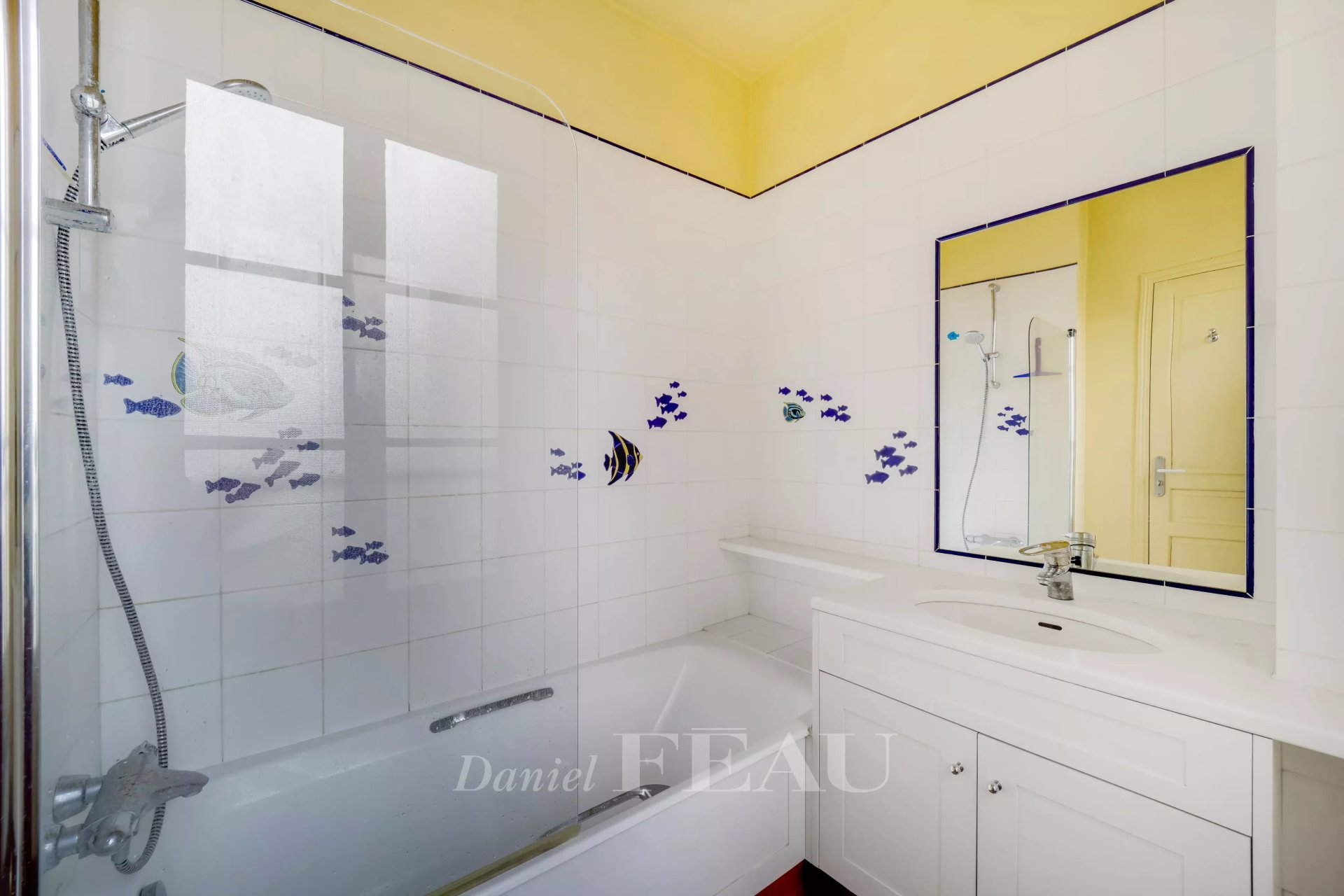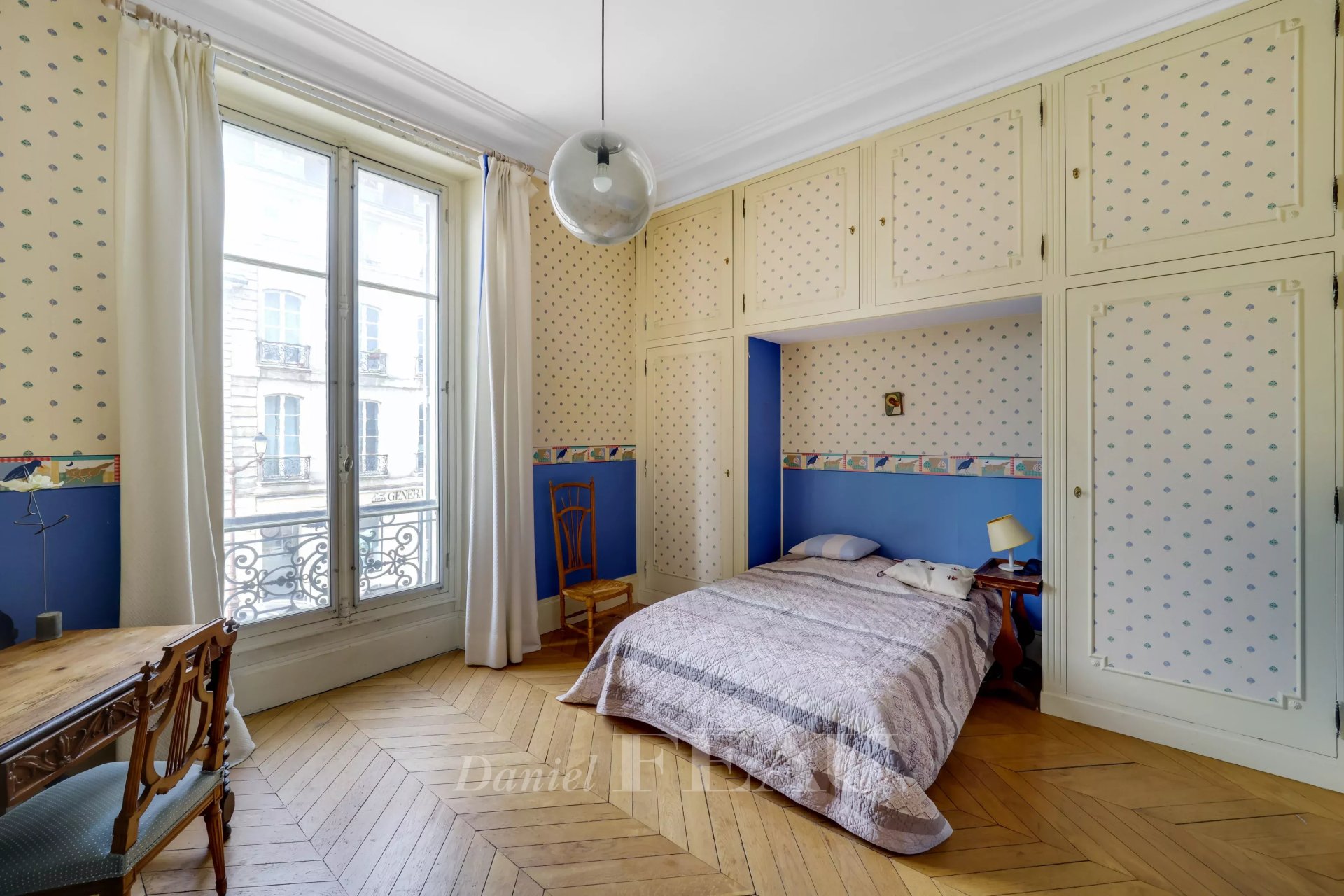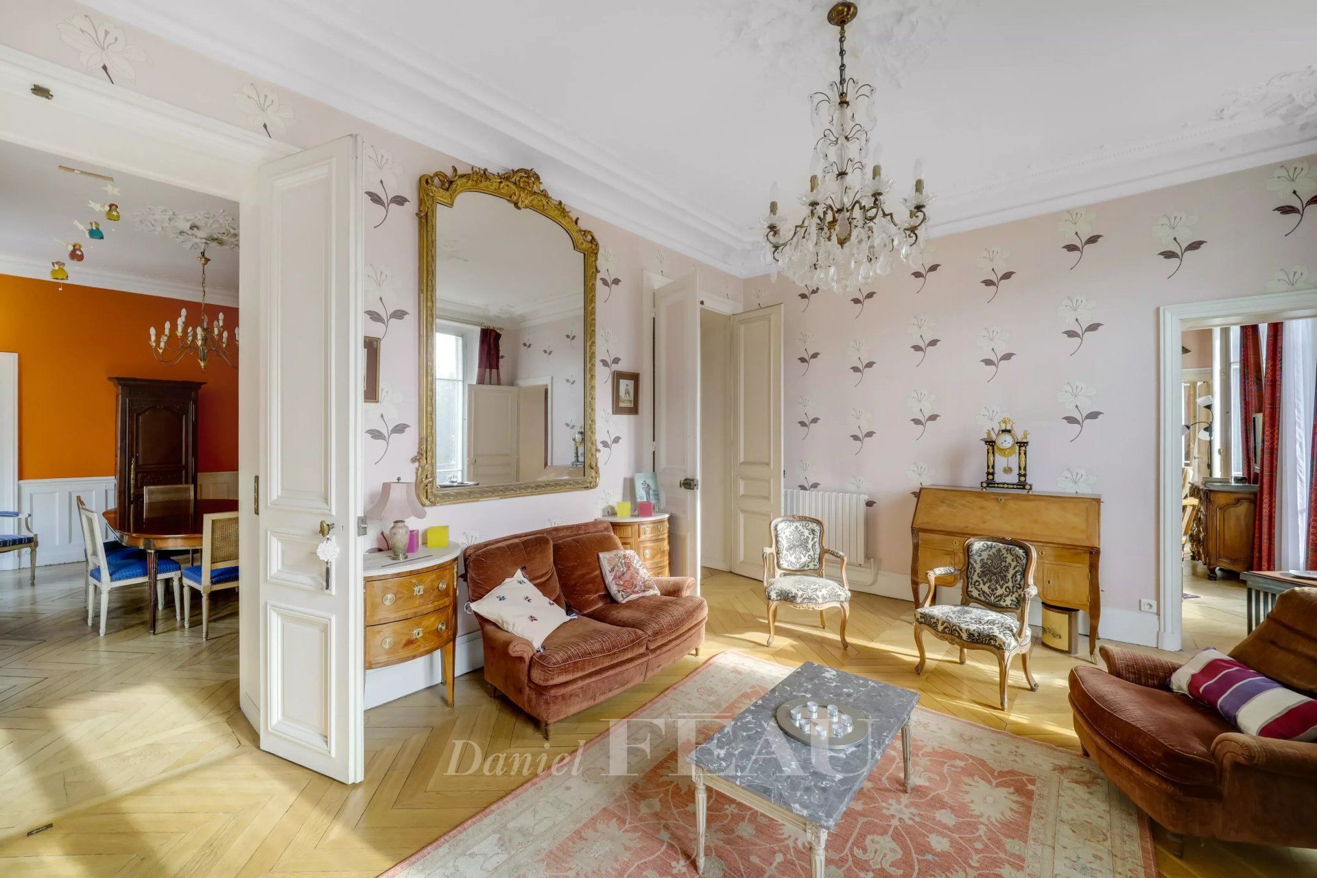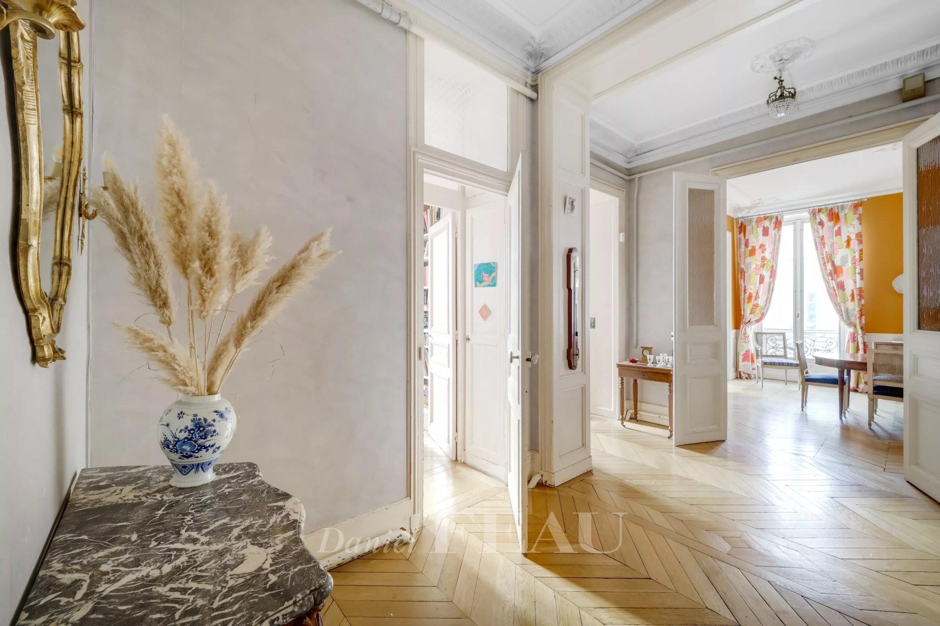 L'appartement à rénover a cependant conservé tous les attributs des beaux appartements anciens : hauteur sous plafond généreuse, parquets en point de Hongrie, cheminées, cimaises, moulures et rosaces. Les parties communes de l'immeuble sont très belles et bien entretenues.
