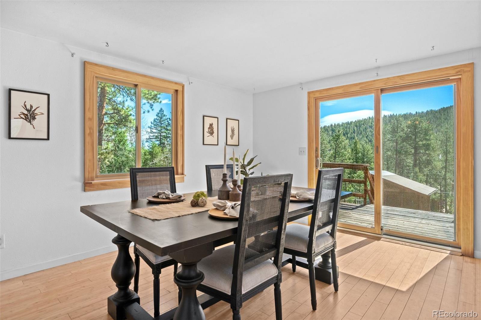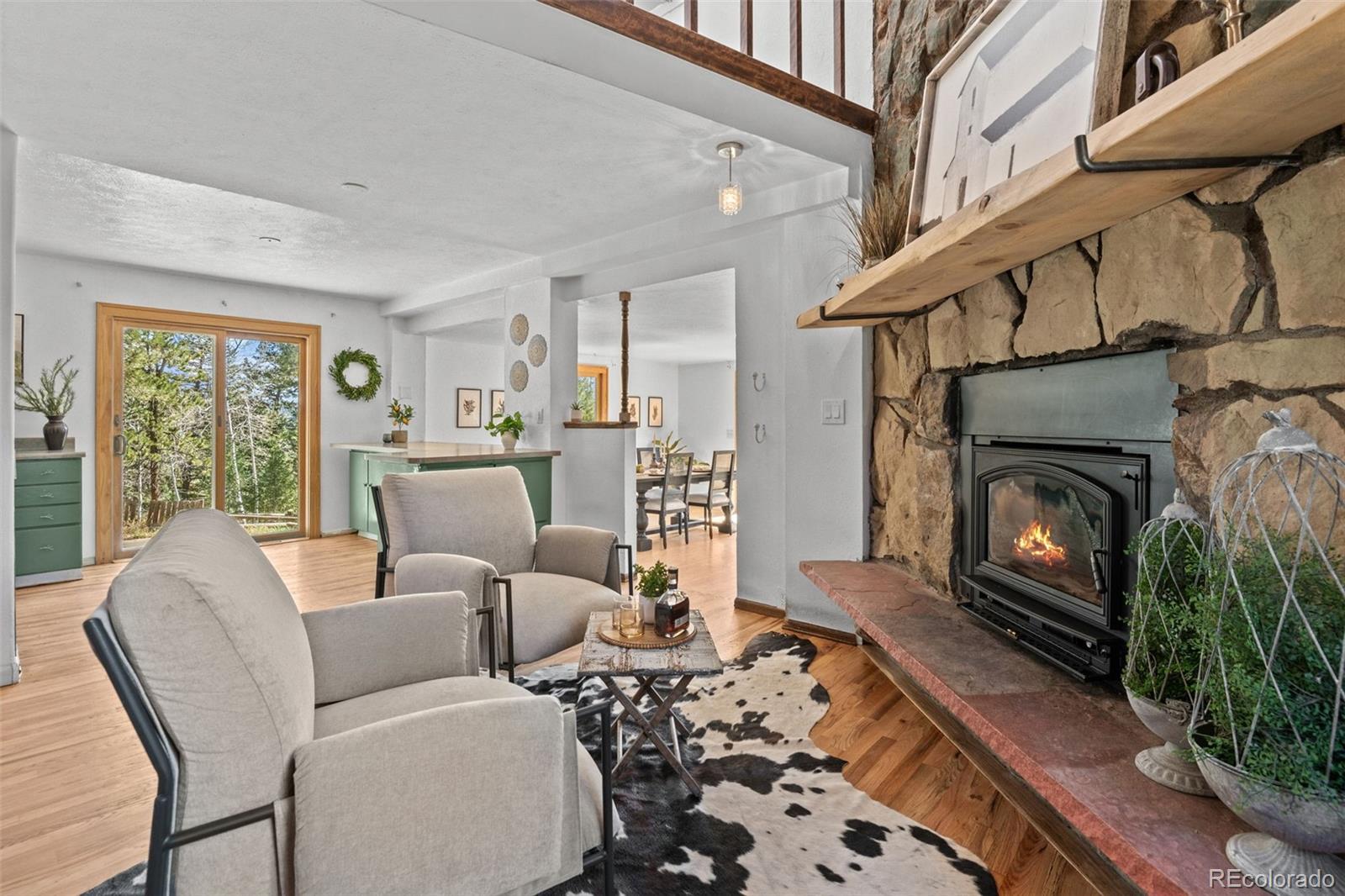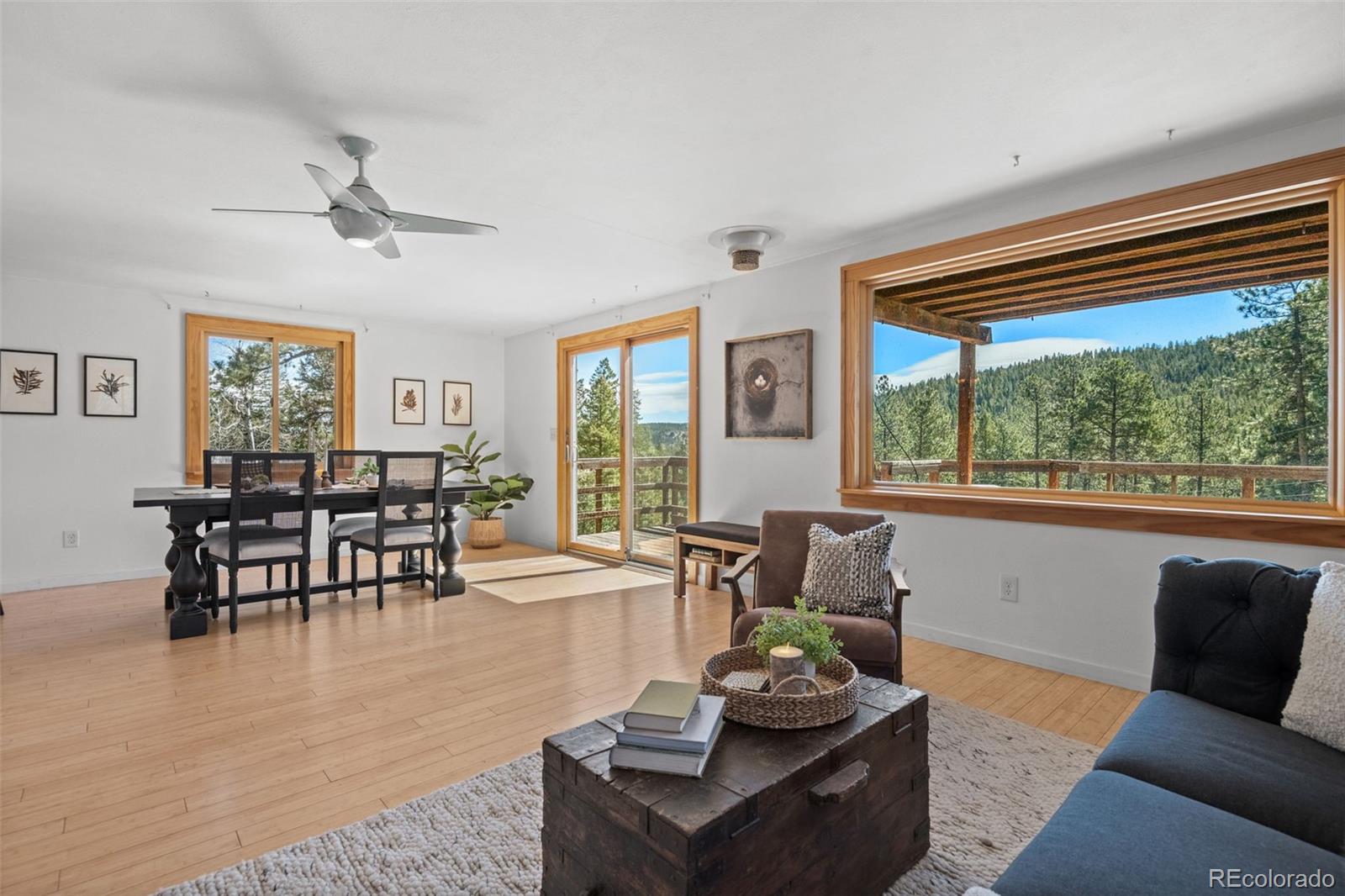 Nestled in the tranquil foothills of Evergreen, this charming mountain retreat offers a rare combination of privacy, sunshine, and views. Set on .84 acres of gently sloped land, the property is surrounded by natural beauty while still conveniently close to everyday amenities. Inside, the 3-bedroom, 2-bath home spans 1,764 square feet and features a bright, open layout designed for comfortable mountain living. Rich wood floors and a classic wood-burning fireplace create a warm, inviting atmosphere, while expansive windows bring in abundant natural light and showcase the scenic surroundings. The living room flows seamlessly into the dining area and kitchen, with patio access from both the living room and kitchen - perfect for enjoying morning coffee or evening sunsets outdoors. The main floor includes a spacious primary suite complete with a large ensuite bathroom and walk-in closet, along with a secondary bedroom and full bath for convenient main-level living. Upstairs, a generous third bedroom is paired with a versatile, lofty, flex space. Outdoors, the property is well-equipped for a variety of lifestyles. Zoning allows for livestock, and four outbuildings - including a loafing shed, large storage shed, woodshed, and chicken coop - provide flexibility for hobbies, animals, or extra storage. A massive, heated detached garage adds even more value with room for vehicles, gear, and workshop potential. Peaceful and private, yet just minutes from Evergreen Lake, shops, dining, and recreation, this foothills escape delivers the mountain lifestyle you've been searching for.
