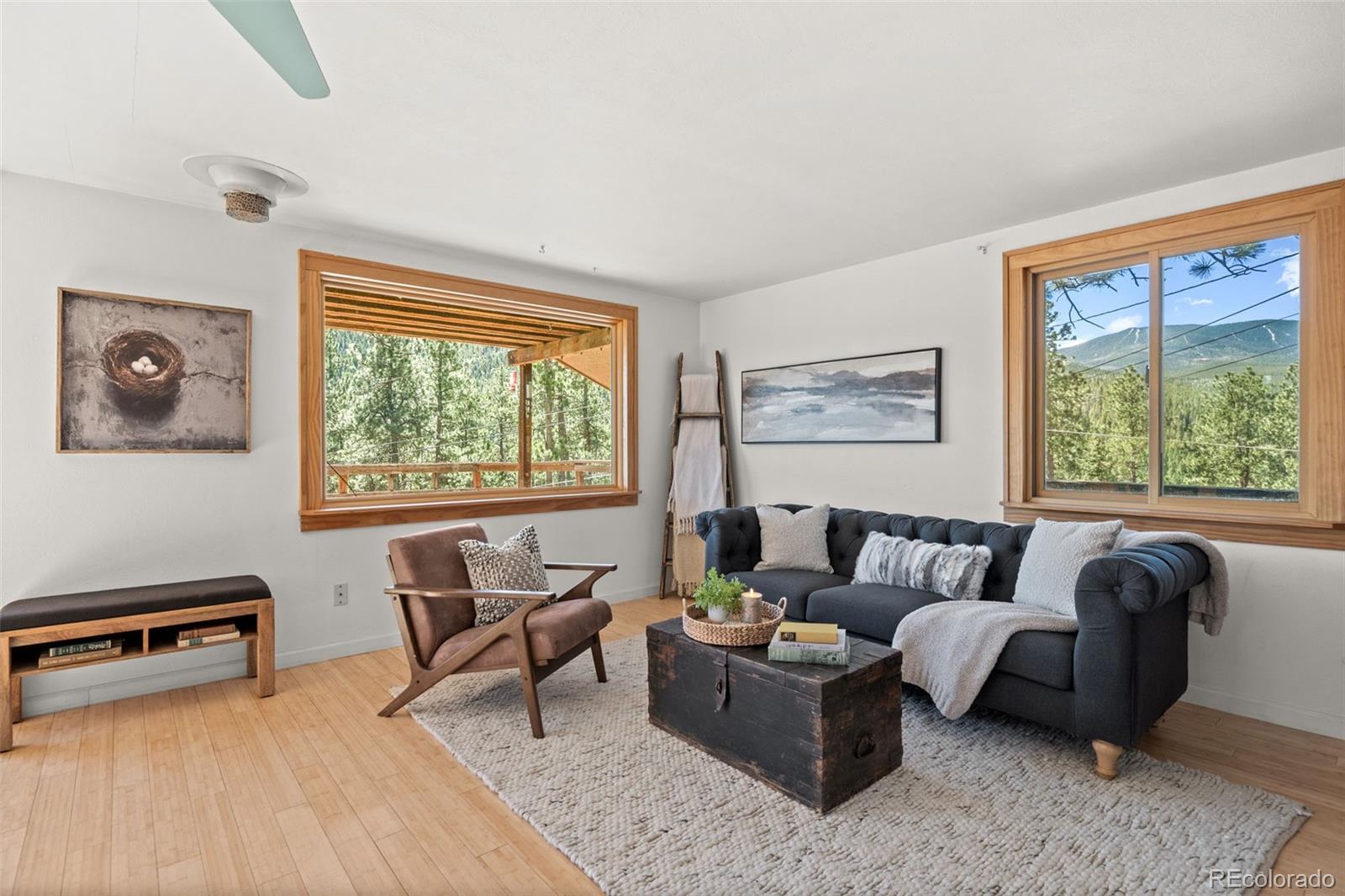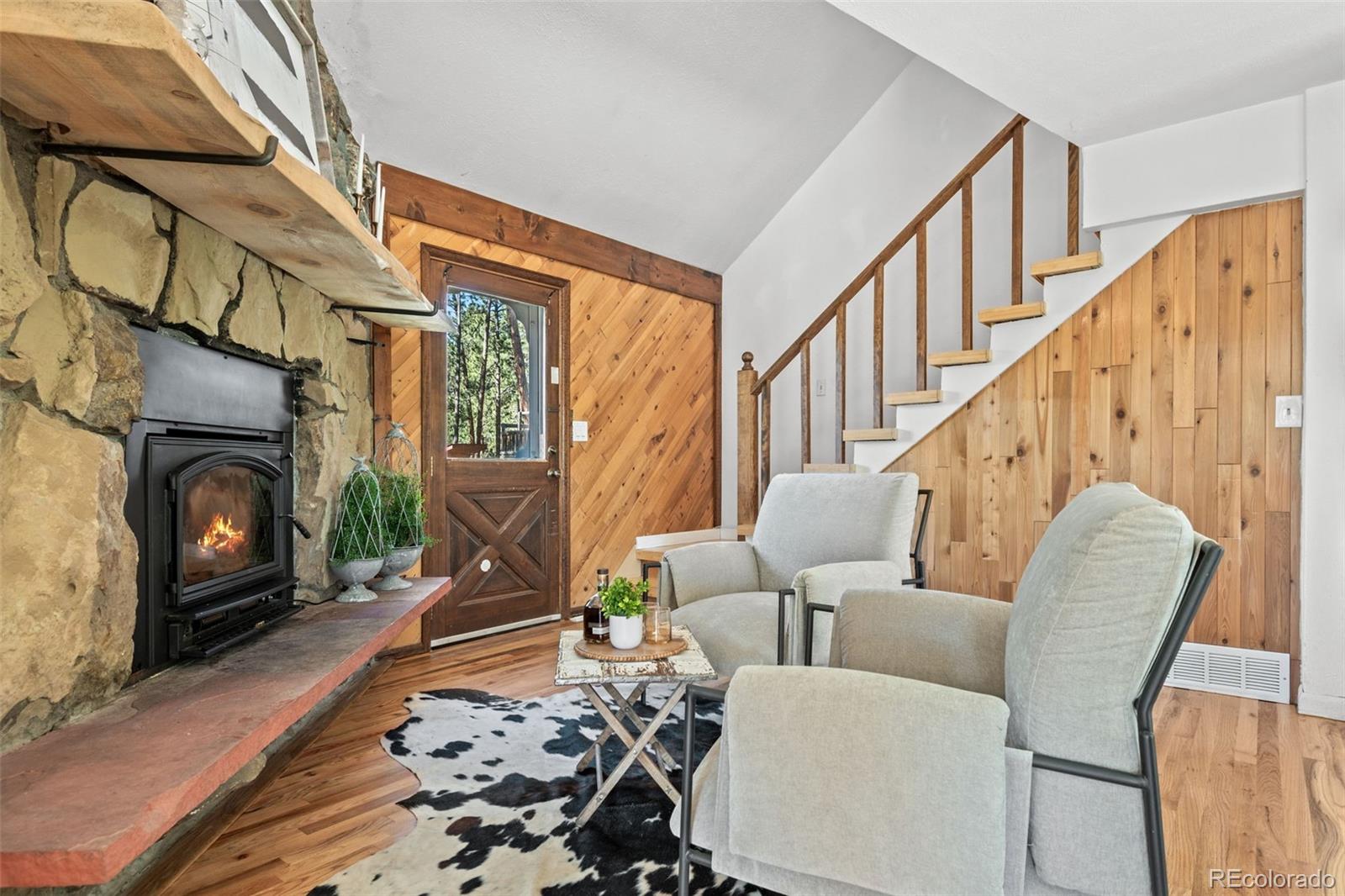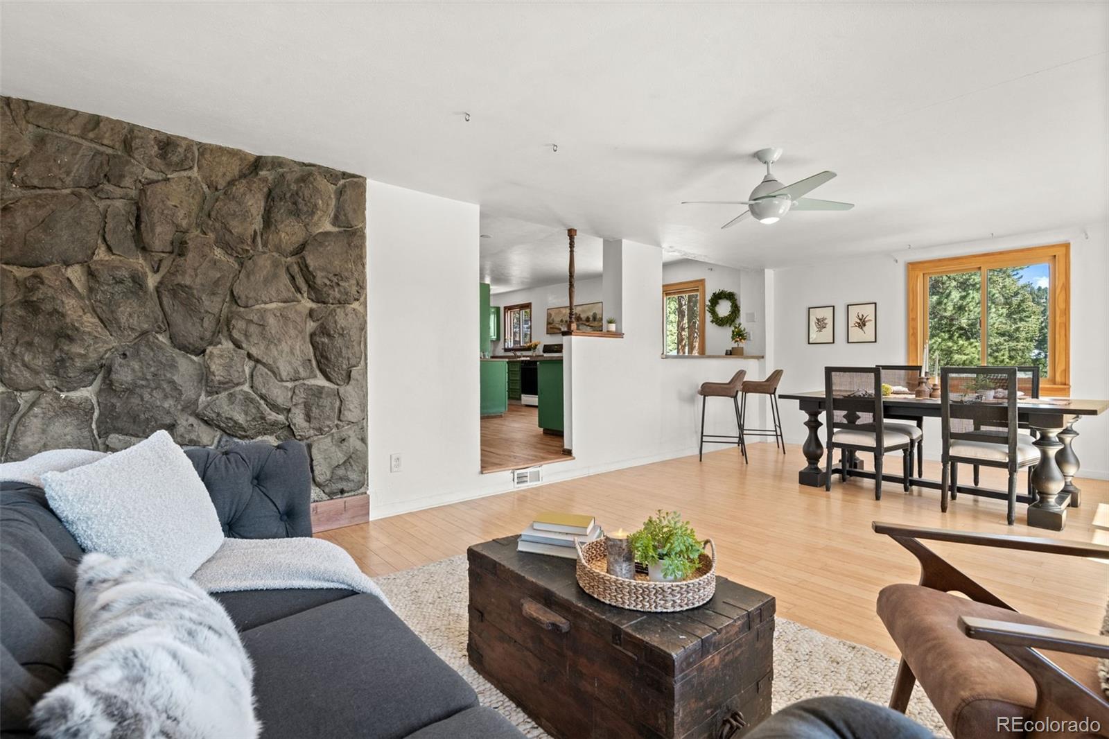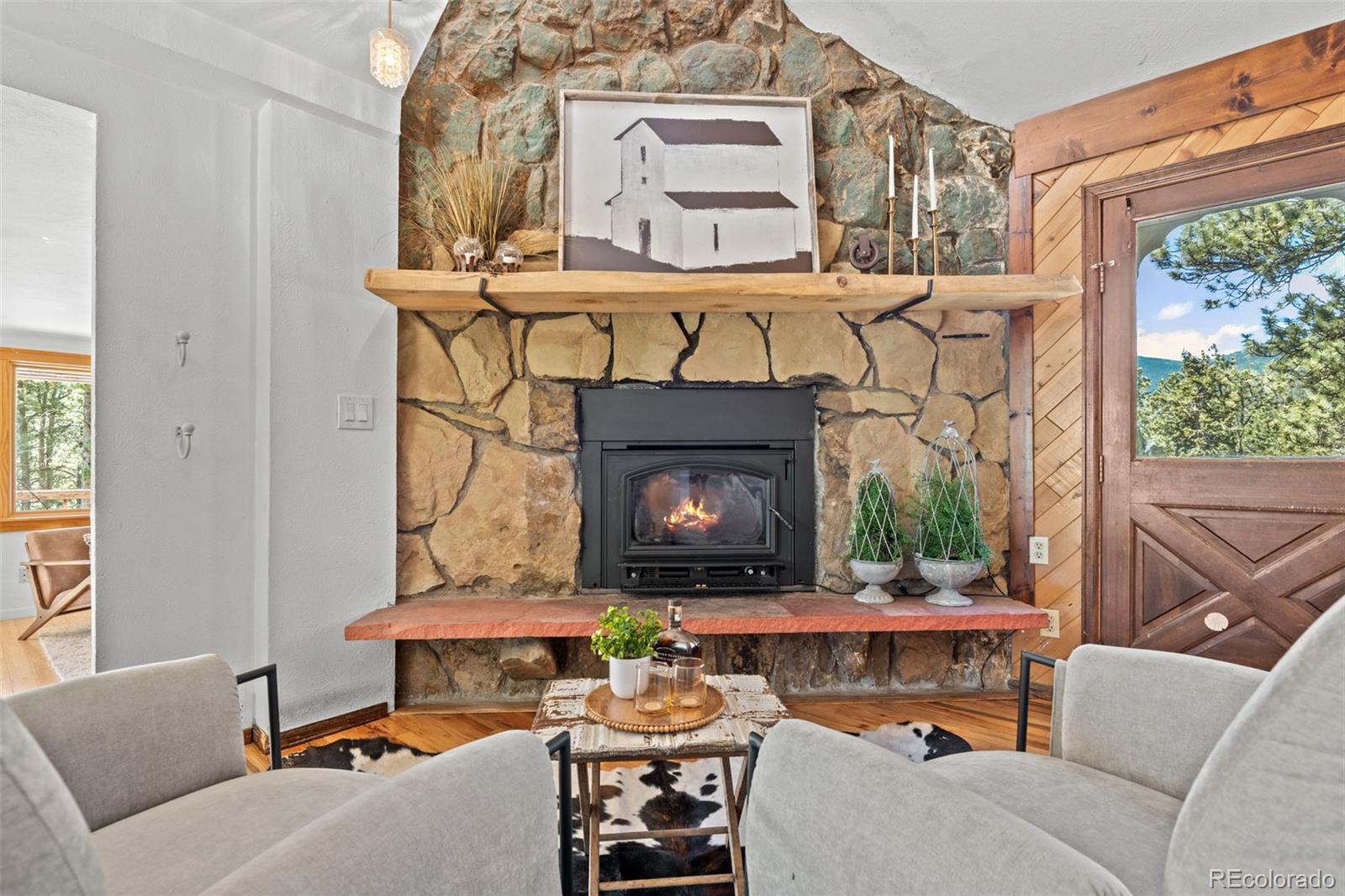 Nestled in the tranquil foothills of Evergreen, this charming mountain retreat offers a rare combination of privacy, sunshine, and views. Set on .84 acres of gently sloped land, the property is surrounded by natural beauty while still conveniently close to everyday amenities. Inside, the 3-bedroom, 2-bath home spans 1,764 square feet and features a bright, open layout designed for comfortable mountain living. Rich wood floors and a classic wood-burning fireplace create a warm, inviting atmosphere, while expansive windows bring in abundant natural light and showcase the scenic surroundings. The living room flows seamlessly into the dining area and kitchen, with patio access from both the living room and kitchen - perfect for enjoying morning coffee or evening sunsets outdoors. The main floor includes a spacious primary suite complete with a large ensuite bathroom and walk-in closet, along with a secondary bedroom and full bath for convenient main-level living. Upstairs, a generous third bedroom is paired with a versatile, lofty, flex space. Outdoors, the property is well-equipped for a variety of lifestyles. Zoning allows for livestock, and four outbuildings - including a loafing shed, large storage shed, woodshed, and chicken coop - provide flexibility for hobbies, animals, or extra storage. A massive, heated detached garage adds even more value with room for vehicles, gear, and workshop potential. Peaceful and private, yet just minutes from Evergreen Lake, shops, dining, and recreation, this foothills escape delivers the mountain lifestyle you've been searching for.