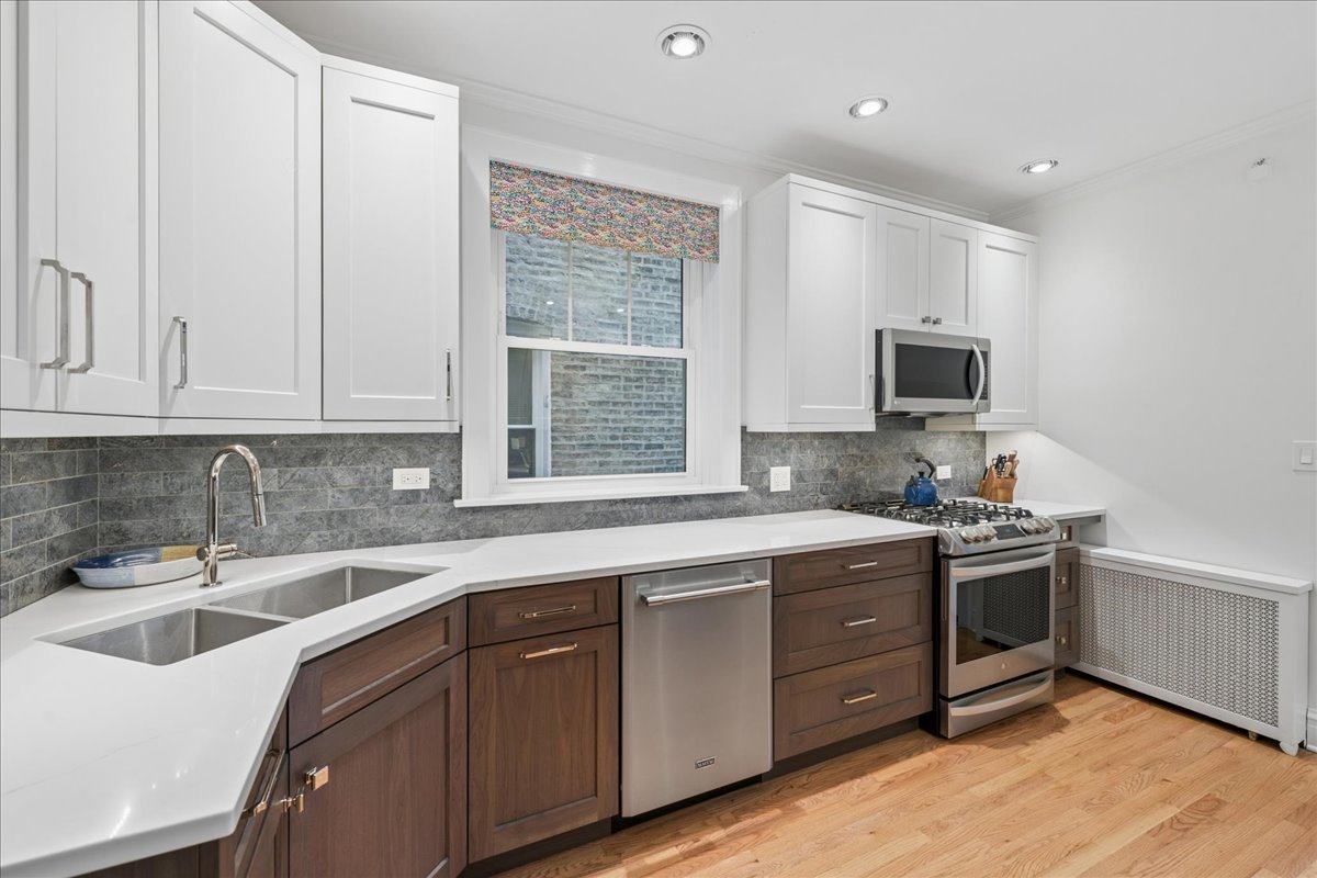 Introducing 4822 N. Leavitt, a beautiful multi-unit home, located in the heart of Lincoln Square. This all-brick 2 flat has been meticulously maintained over the past 42 years, and its updated features are endless. The first-floor duplex boasts a stunning kitchen with custom cabinets, SS appliances and quartz countertops, 3 bedrooms plus a tandem sunroom, a cozy lower-level media room with gas fireplace, zoned surround sound, a 270-bottle Enofrigo wine chiller, office nook, laundry room/storage, replacement windows, tankless water-heater and central AC. The second-floor unit includes 2 bedrooms plus a tandem sunroom, an updated kitchen with pantry, decorative fireplace, replacement windows, and laundry hook-up. Step outside and experience your very own urban oasis. The private decks and rear stairs are made of steel and Ipe decking, and the paver patio, which is surrounded by flowering pear/cherry trees and a bubbling fountain, provides ample space for entertaining and relaxing. The 2-car garage includes a charging station. This 2-flat is ideal for the live-in owner who wants additional rental income or desires an in-law arrangement. Plus, there's expansion/conversion possibilities if you need more room to grow. The home's location is perfect with its tree-lined street and proximity to parks, exceptional public/private schools, public transportation, shopping, and dining. Come see why the WSJ calls Lincoln Square "one of the city's top destinations". The current owner uses the second-floor unit as a home office and guest accommodations. There are no current leases.