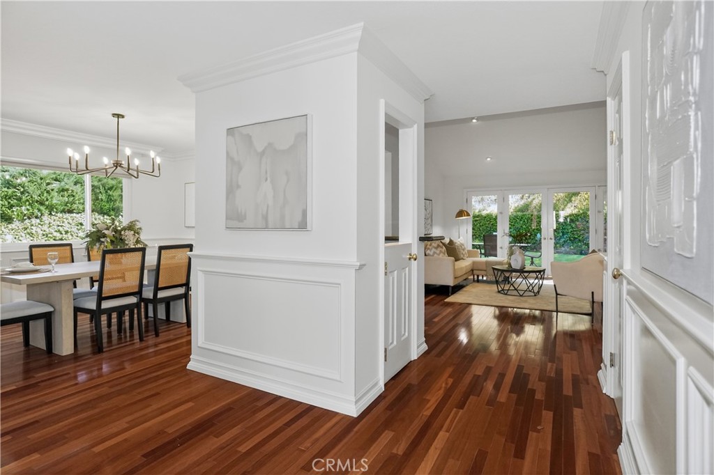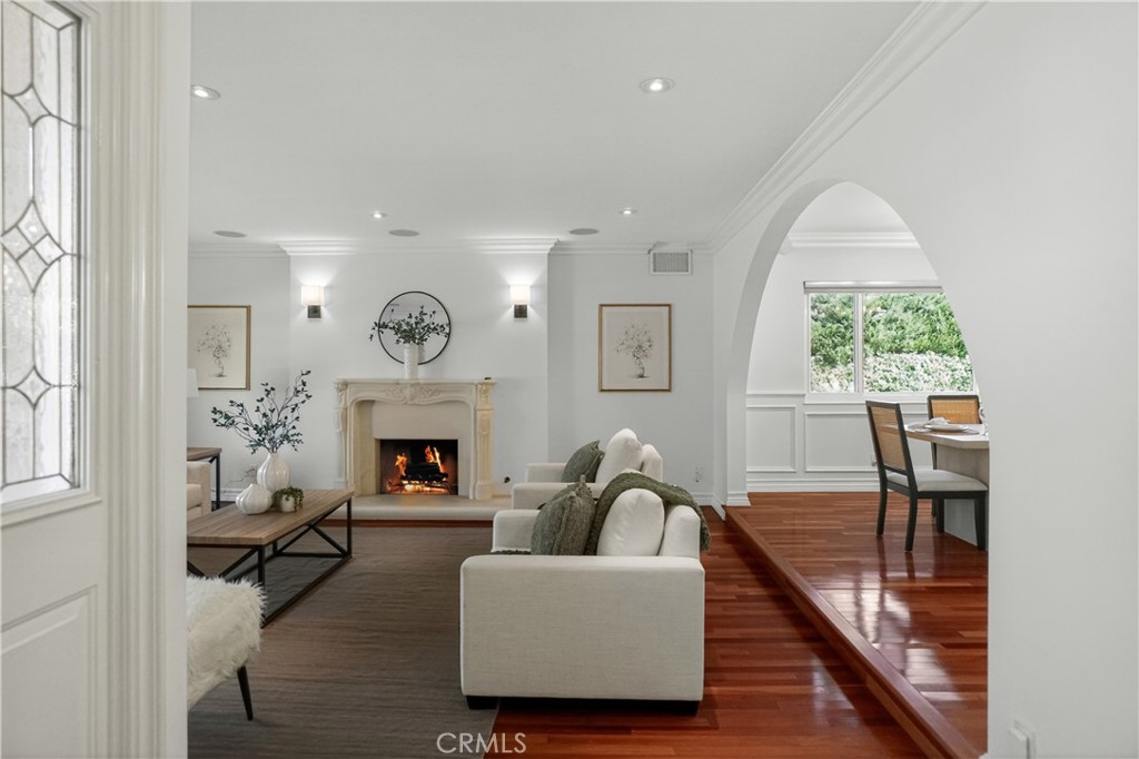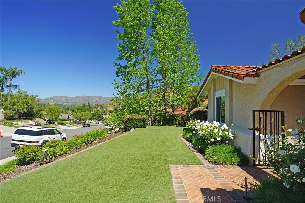 Welcome to this unique opportunity in the highly sought-after Fountainwood community of Agoura Hills. This exceptional single-story home offers over 2,100 square feet on an expanded lot exceeding 40,000 square feet - a combination of size, privacy, and potential that is seldom available. Ideally located on Carell Avenue, one of Fountainwood's most desirable streets, the property enjoys wider spacing and no backyard neighbors, creating a level of privacy that is increasingly hard to find. From the moment you arrive, the home's gorgeous curb appeal immediately stands out. Enter through an inviting atrium into a bright, flowing floor plan. Rich cherry wood flooring, custom moldings, baseboards, paneling, and wainscoting - crafted by a local artisan - add warmth and character throughout. The step-down living room is anchored by a striking limestone decorative fireplace, creating a sophisticated yet comfortable focal point. The kitchen features travertine floors, granite countertops, oak cabinetry, stainless steel appliances, and just outside the kitchen, a walk-in bar with counter seating - ideal for everyday living and entertaining. The spacious primary suite includes dual closets, including a walk-in, and a marble bath. Secondary bedrooms are well-proportioned, with a hall bath offering a relaxing spa tub. The backyard is where this home truly separates itself. Backing to open space, it offers exceptional privacy and tranquility. The oversized lot provides a rare opportunity to build a view deck on the hillside - unlocking what could become one of the most compelling view properties in Agoura Hills. The brick patio with awning is a perfect outdoor sanctuary, and is a blank canvas for a future pool or custom outdoor retreat. Additional features include owned solar panels (offsetting electric costs), smooth ceilings, recessed lighting, built-in garage storage, fresh paint, a tile roof, and a concrete driveway designed for long-term, low-maintenance living. Fountainwood is known for its peaceful setting, strong sense of community, and access to award-winning schools within the Las Virgenes Unified School District. Surrounded by scenic mountains, hiking and biking trails, and parks, yet just minutes to shopping, dining, the freeway, and the beach - this location offers the best of both convenience and lifestyle. The fire in the decorative fireplace was added virtually.