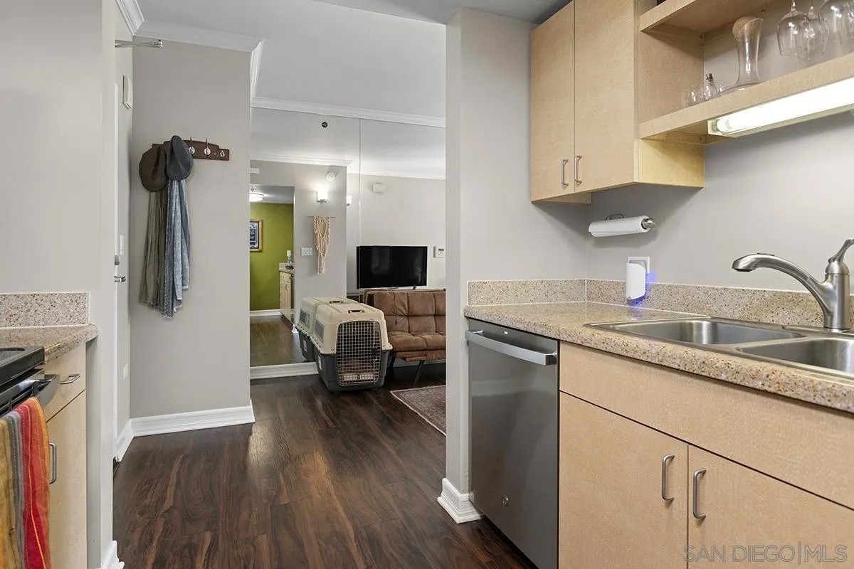 Picturesque oversized windows fill this southeast corner residence with natural light while showcasing vibrant city views, placing you near the heart of Little Italy. A private balcony offers the perfect vantage point to take it all in, overlooking the 8th-floor pool deck and skyline beyond. The home lives bright and open, feeling larger than its footprint with a seamless flow from the living area to the outdoor space - ideal for both relaxing and entertaining. A thoughtfully placed mirrored wall enhances depth and light, while crown molding and luxury vinyl plank flooring add a warm, finished touch throughout. The well-appointed kitchen features granite countertops and upgraded stainless steel appliances, blending style with everyday functionality. The corner bedroom serves as a comfortable retreat, complete with large windows, city views, and ample wall space for artwork or design personalization. Additional highlights include Acqua Vista's top-notch amenities with fitness center, pool, spa, 24hr attendant, Amazon Locker, conference room and more! Secured valet parking space is included for convenience and ease. Just down the street, enjoy immediate access to the waterfront at the Embarcadero, Little Italy's renowned dining and shops, and all the best of Downtown living A home that delivers on both lifestyle and location - comfortable, connected, and distinctly urban. Downtown San Diego's Little Italy is a vibrant culinary and cultural hotspot, beloved for its rich history and modern flairs. Classic restaurants like Mona Lisa and Civico 1845, alongside new favorites Ironside, Juniper & Ivy, and Craft & Commerce, make it a go-to for local foodies. The neighborhood is filled with cafes, bakeries, boutiques, bars, and wine shops, perfect for an evening wander. The Little Italy Association also keeps the calendar full with community events such as art walks, car shows, the yearly Little Italy Festa, and a vibrant Farmers Market on Wednesdays and Saturdays. Don't forget the NoLi Art & Design District, a vibrant hub that includes a collection of retail outlets, designer boutiques, and art galleries, all boasting unique home items and rare discoveries to help you curate the perfect ambiance for your new residence. . With the airport just minutes away, frequent travel becomes effortlessly convenient to boot. Acqua Vista features complimentary valet parking for residents, 24/7 security and lobby attendants, a fitness center, and an 8th floor pool and spa deck, barbecues and lounge area. Residents can also take advantage of the community's electric vehicle charging stations. *Have a 2nd vehicle? The HOA leases additional parking spaces too!*