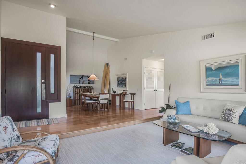 Welcome to this beautiful 4br / 2ba single-level home with panoramic ocean, sunset and coastal views. On clear days Catalina and San Clemente Islands are visible on the horizon. Surrounded by lush tropical landscaping with fragrant plumeria and jasmine, the home evokes a year-round vacation feel. The entry is through an oversized custom Mahagany door that leads into the living and dining spaces with vaulted ceilings. The island kitchen opens seamlessly to the family room, creating a bright, open-concept layout ideal for everyday living and entertaining. Large windows frame ocean and sunset views, complemented by electric shades for added comfort and convenience. The chef's kitchen is appointed with a Viking range, KitchenAid oven and warming drawer, Bosch dishwasher, and Sub-Zero refrigerator/freezer. The family room features a distinctive beach rock fireplace and hearth, with glass window panels on both sides that visually terminate into the natural stone. The beach rock flooring extends outward to a matching beach rock patio through a frameless glass door, creating a cohesive indoor-outdoor transition. The backyard is designed for outdoor enjoyment, featuring a Trex deck with a central fire pit and ocean views, as well as an elevated balcony offering whitewater views of Ponto Beach and the evening light of Oceanside pier. Additional features include remodeled bathrooms, wood flooring, wood cabinetry, garage cabinetry, owned solar, air conditioning, and a whole house fan. One of the four bedrooms is currently configured as a home office /studio, offering flexible use.