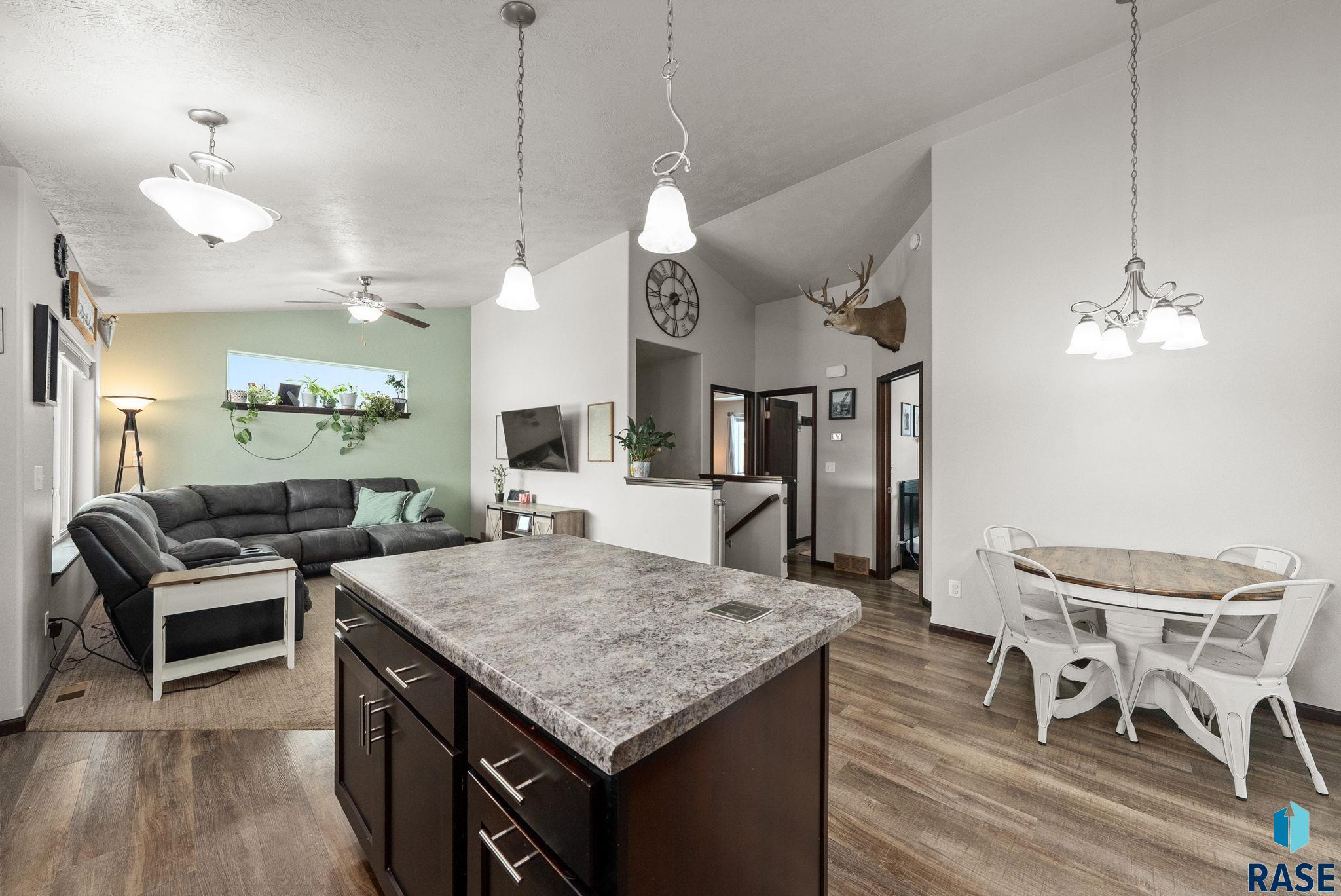 Welcome to this great home in Tea, SD, offering a fully finished and thoughtfully designed interior. The open-concept main floor features vaulted ceilings that create a bright, spacious feel, perfect for everyday living and entertaining. A functional laundry room with added storage and a convenient drop zone provides direct access to the oversized three-stall garage. The finished basement expands the living space with two additional bedrooms, a generous office or flex room, a secondary living area, and large bedroom closets. The utility room offers even more storage, keeping everything organized and efficient. Step outside to a completely fenced backyard with a nice deck, huge patio, and storage shed; ideal for relaxing, hosting, or enjoying outdoor time. Fresh exterior paint enhances curb appeal and adds to the home's move-in-ready appeal.