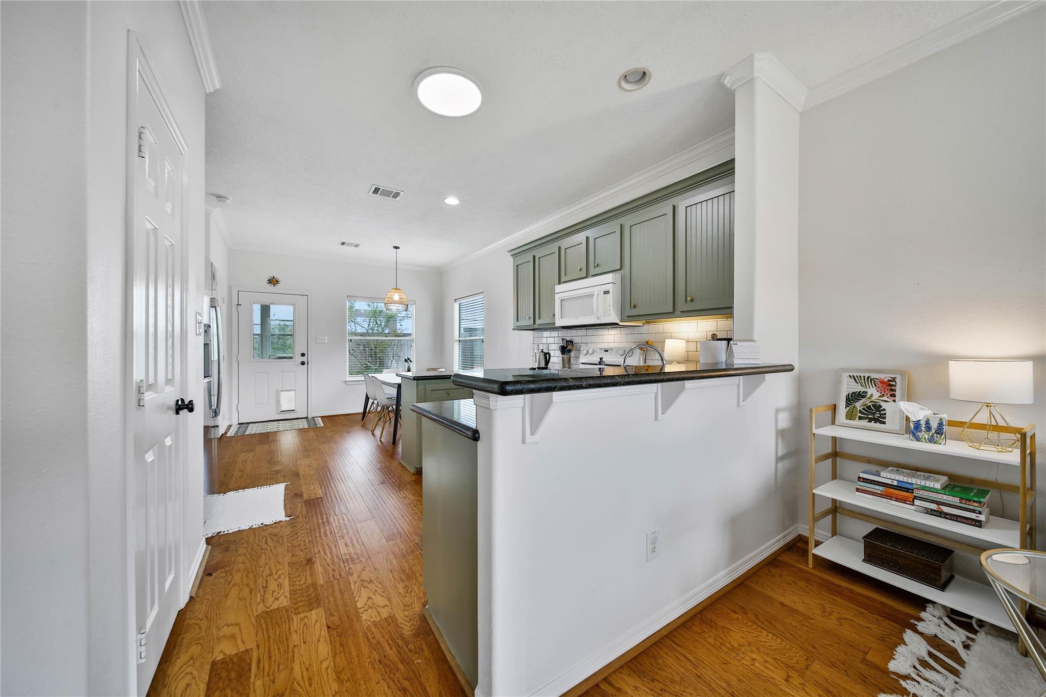 Welcome to this beautifully maintained 2-bedroom, 2-bath traditional home in the heart of Tomball! Featuring 1,227 sqft of thoughtfully designed living space, this home offers stunning wood floors throughout - NO carpet anywhere. The kitchen showcases custom-painted cabinetry with gold hardware, opening seamlessly to the living and dining areas. Both bathrooms have been tastefully updated with modern finishes and stylish retro-inspired tile. Enjoy year-round comfort in the fully enclosed back patio with its own A/C unit - perfect for relaxing or entertaining. The spacious backyard offers no rear neighbors for added privacy. Additional highlights include a 1-car garage with an A/C-equipped workshop/flex space. Located in a charming neighborhood near Tomball's Main Street, shopping, dining, and with easy access to 99, 249, and major airports. Zoned to highly sought-after Tomball ISD!