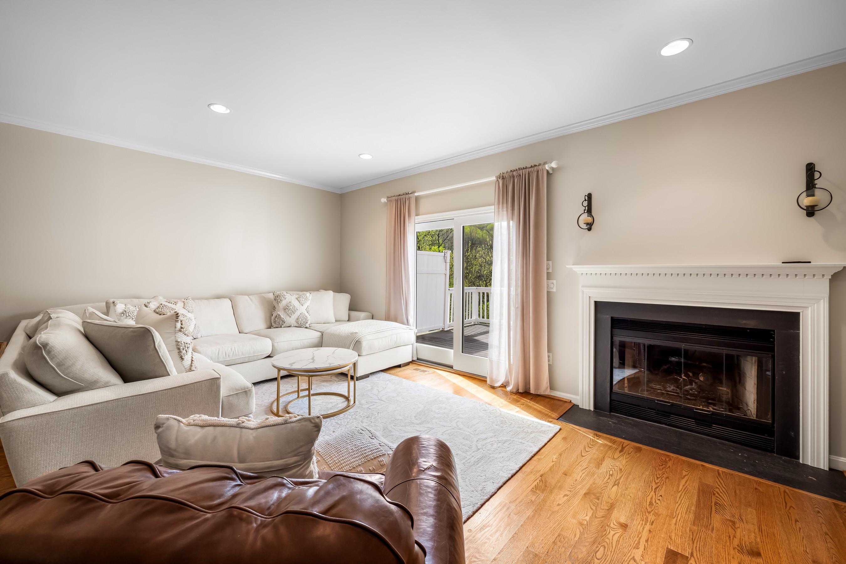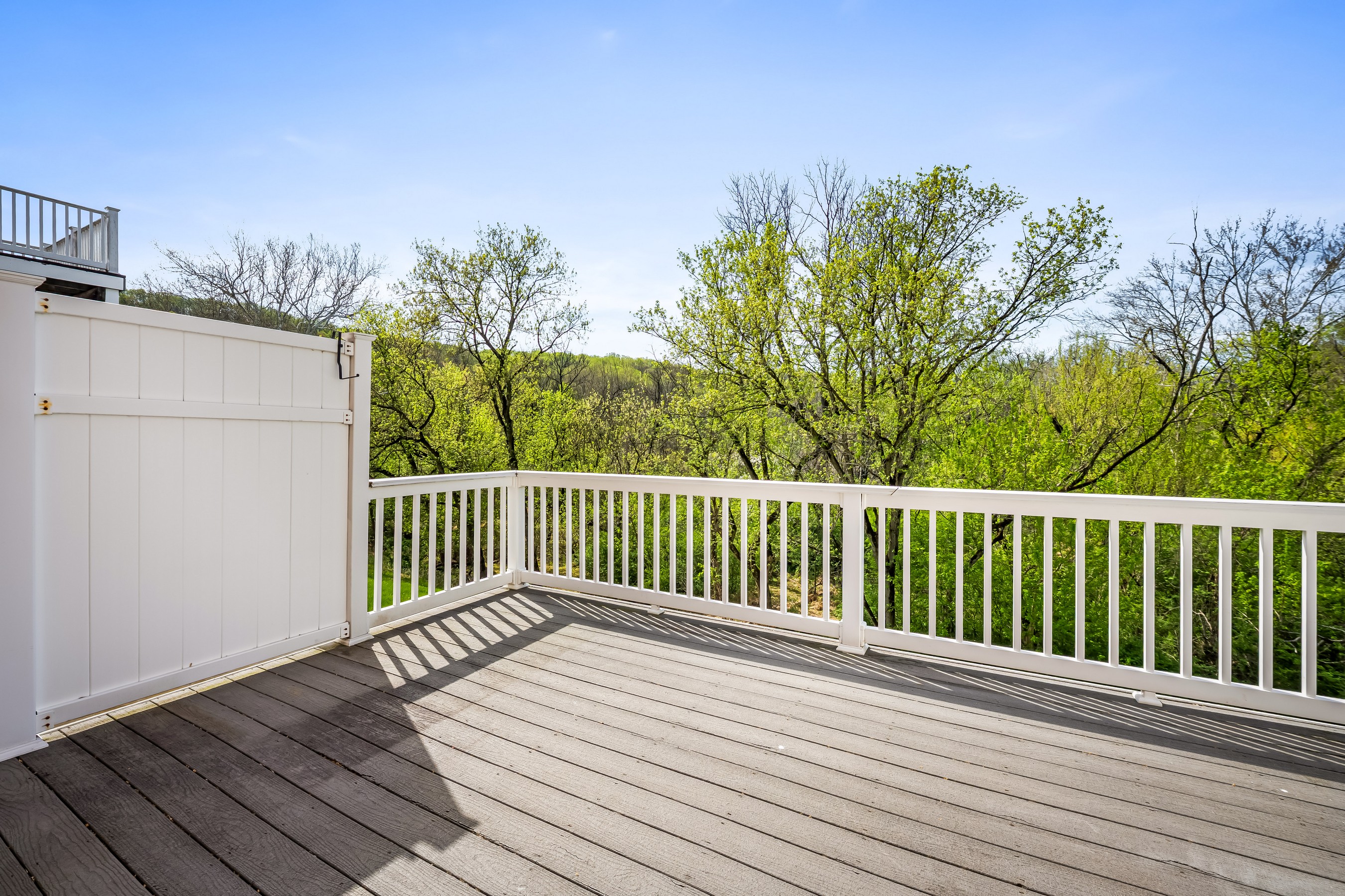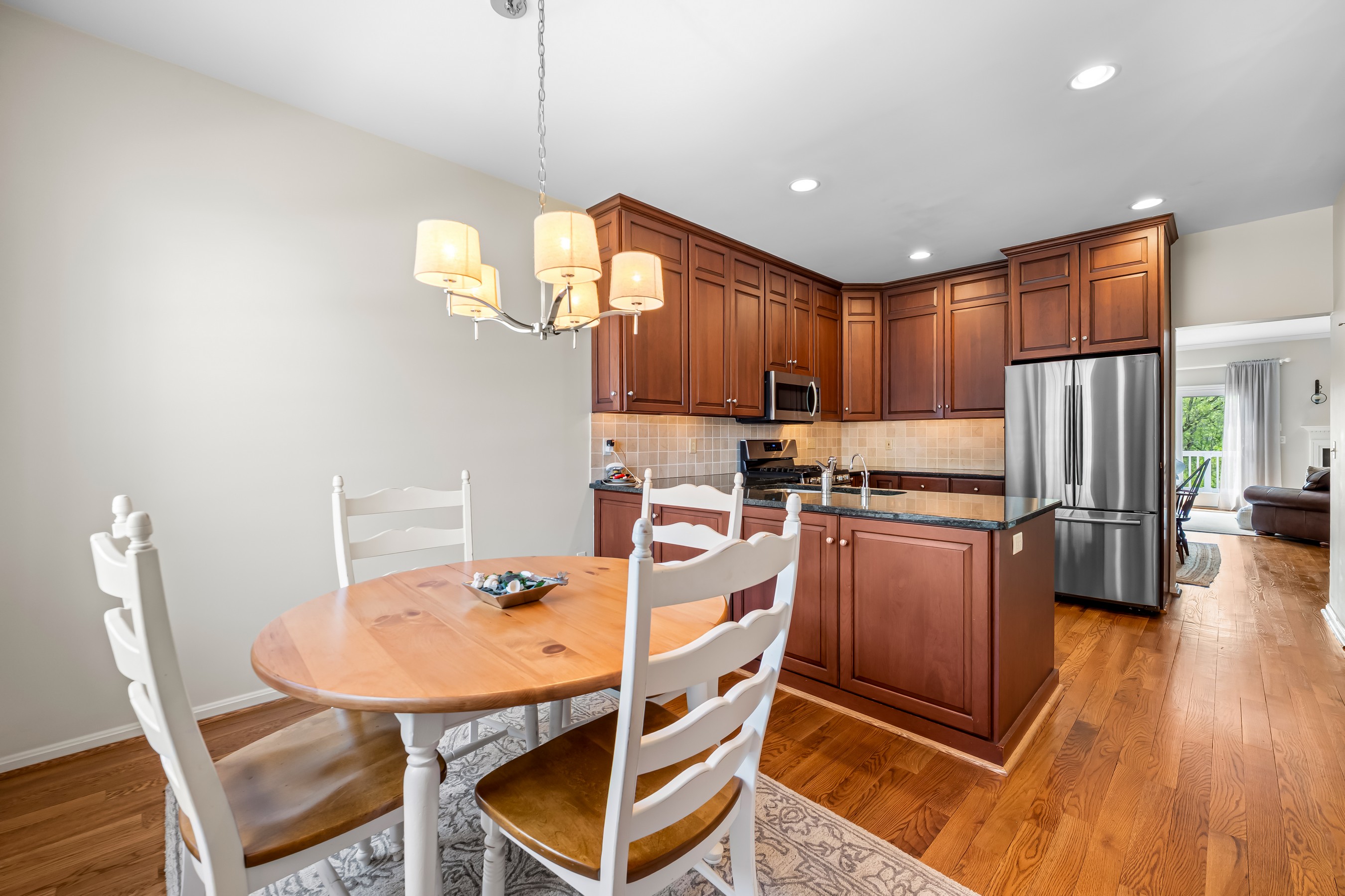A covered porch and tasteful landscaping greet you upon arrival. Step inside the bright and welcoming main level featuring a powder room and an eat-in kitchen with an abundance of cabinet space, stainless steel appliances and pantry. A separate dining area that flows into a spacious living room with a cozy gas fireplace is ideal for relaxing or entertaining. Just off the living area, enjoy seamless indoor-outdoor living with a private deck overlooking serene, tree-lined views.