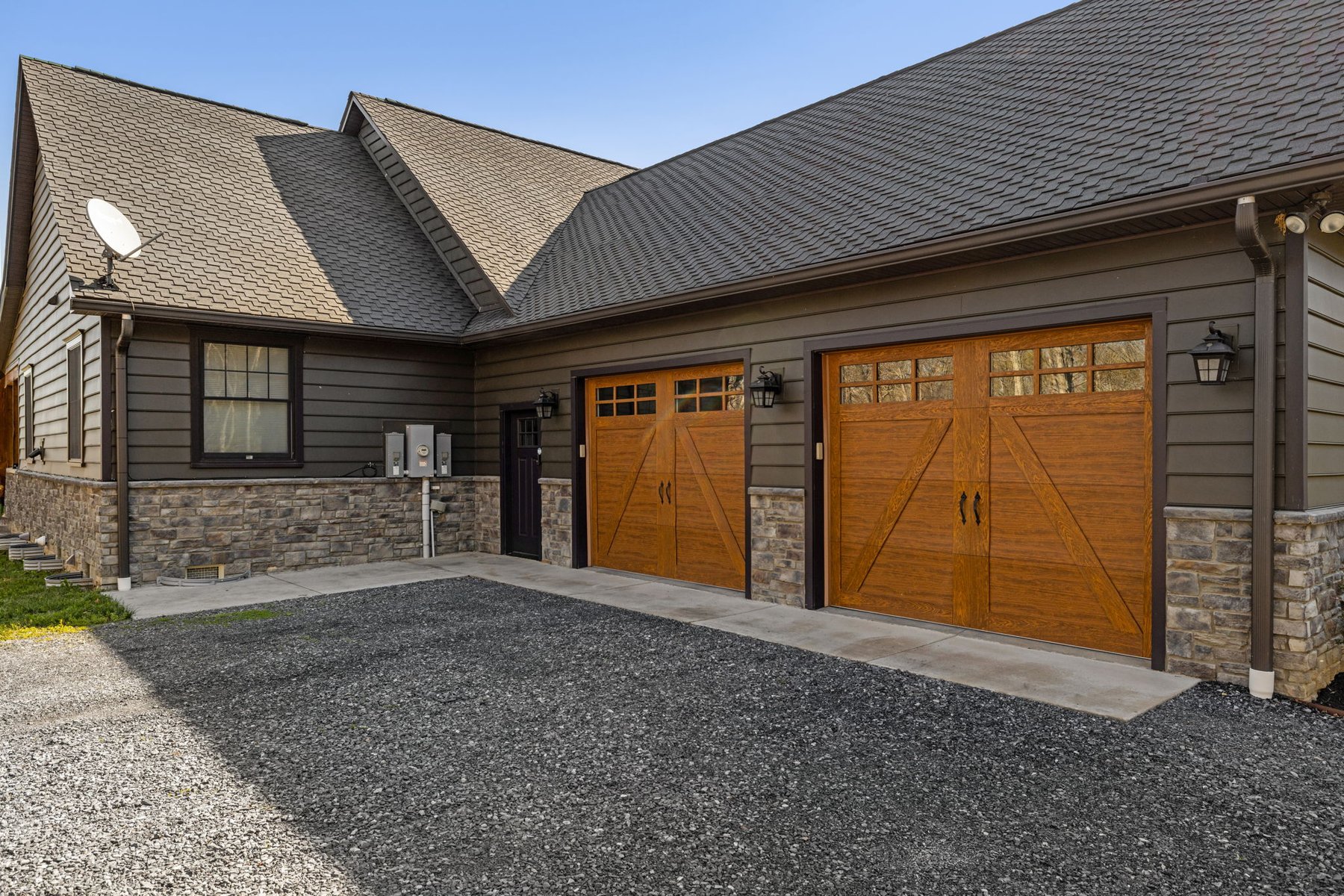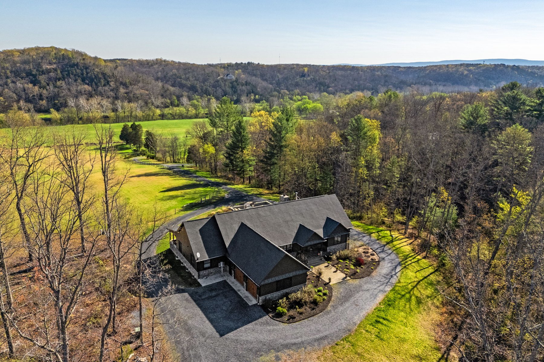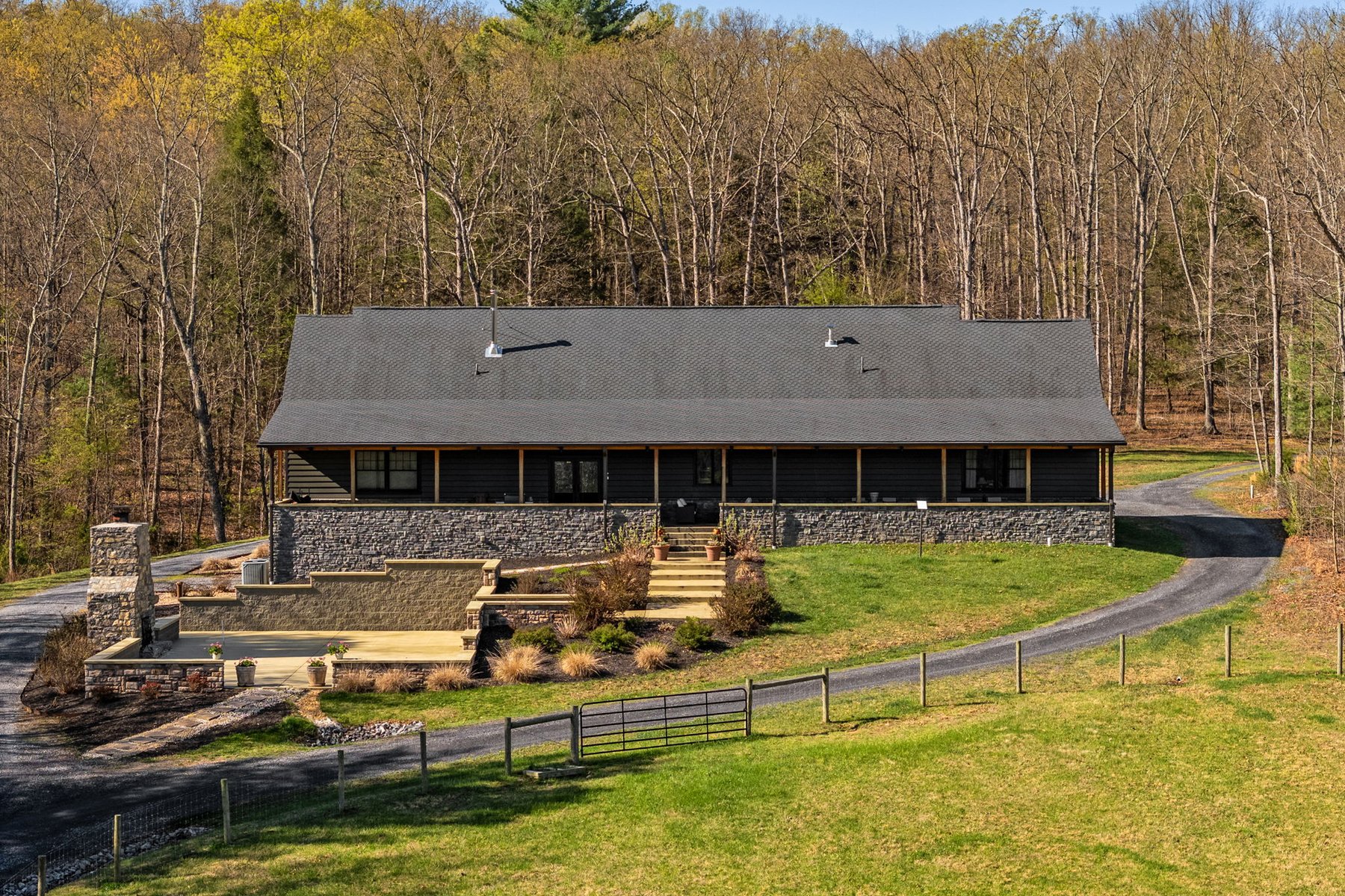 The residence was built to exacting standards using 2x6 framing, stone and HardiePlank siding, custom exterior doors, and locally milled hardwood flooring installed by Cochran’s of Berryville using lumber harvested from the property. The home offers 3,174 square feet of above-grade finished living space with three bedrooms, two full and two half baths, and a layout that places all primary living areas on the main level. An unfinished lower level provides approximately 850 square feet of storage with potential for future finishing, along with an additional one-car garage.