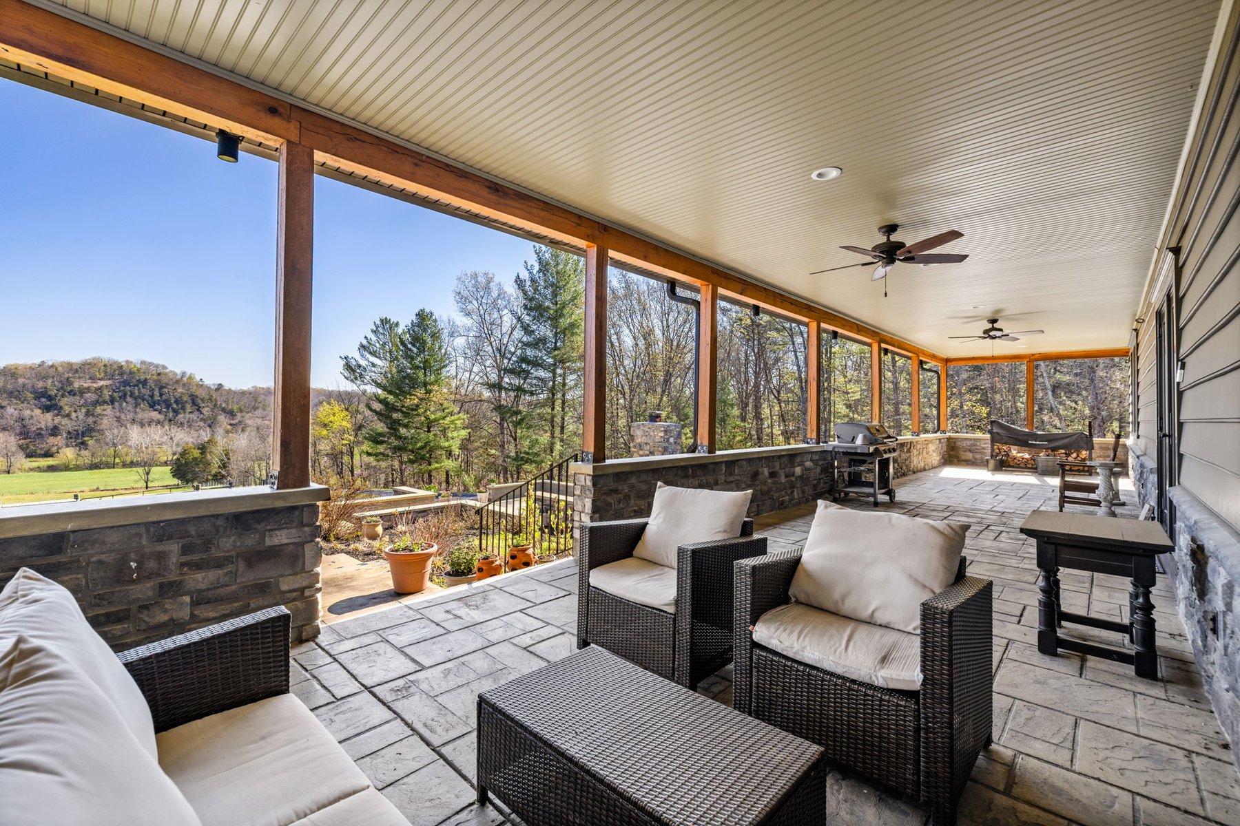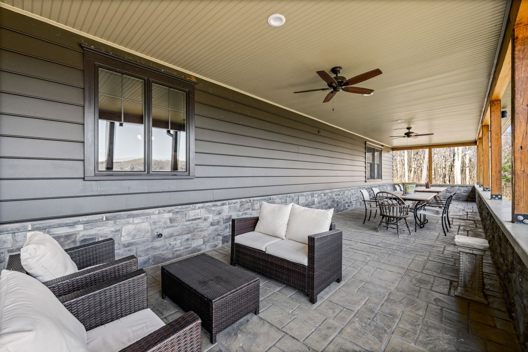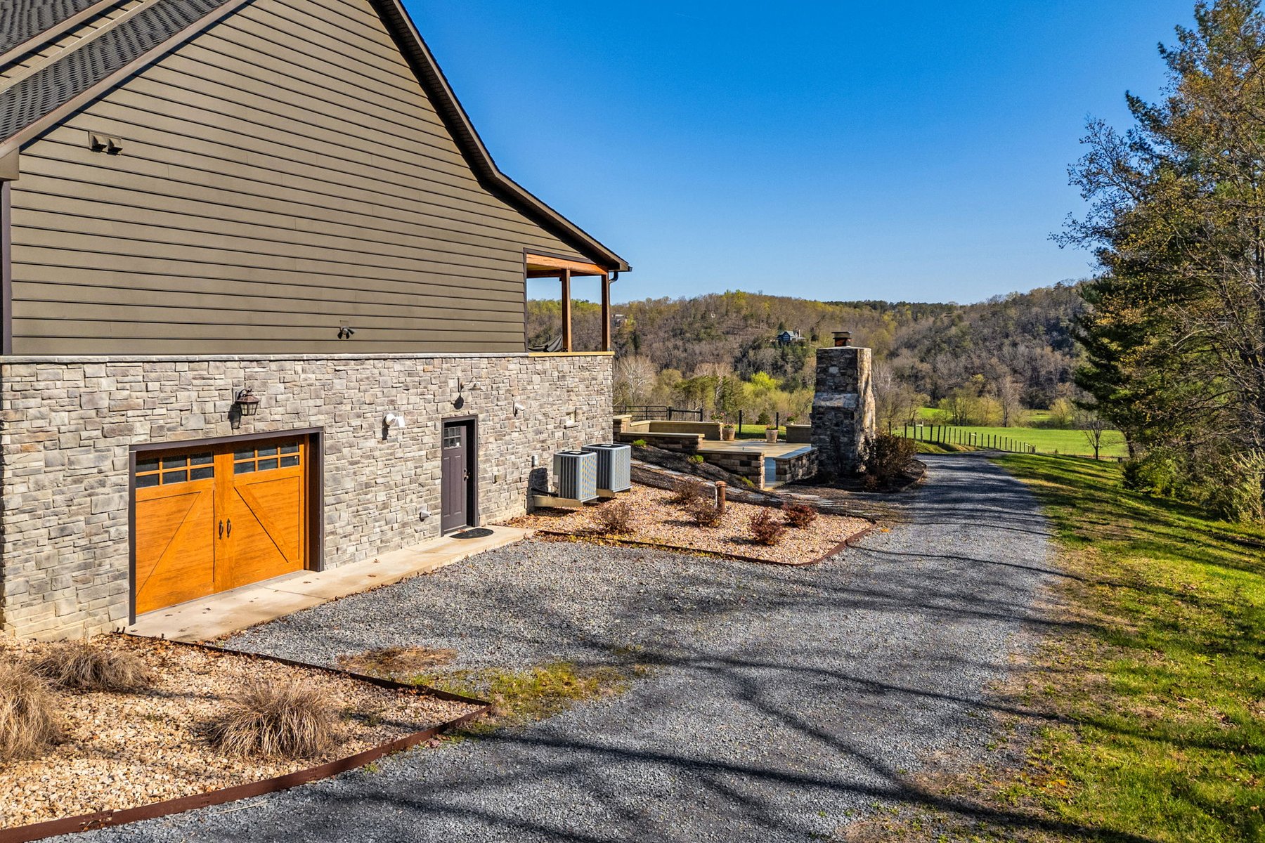 The residence was built to exacting standards using 2x6 framing, stone and HardiePlank siding, custom exterior doors, and locally milled hardwood flooring installed by Cochran’s of Berryville using lumber harvested from the property. The home offers 3,174 square feet of above-grade finished living space with three bedrooms, two full and two half baths, and a layout that places all primary living areas on the main level. An unfinished lower level provides approximately 850 square feet of storage with potential for future finishing, along with an additional one-car garage.