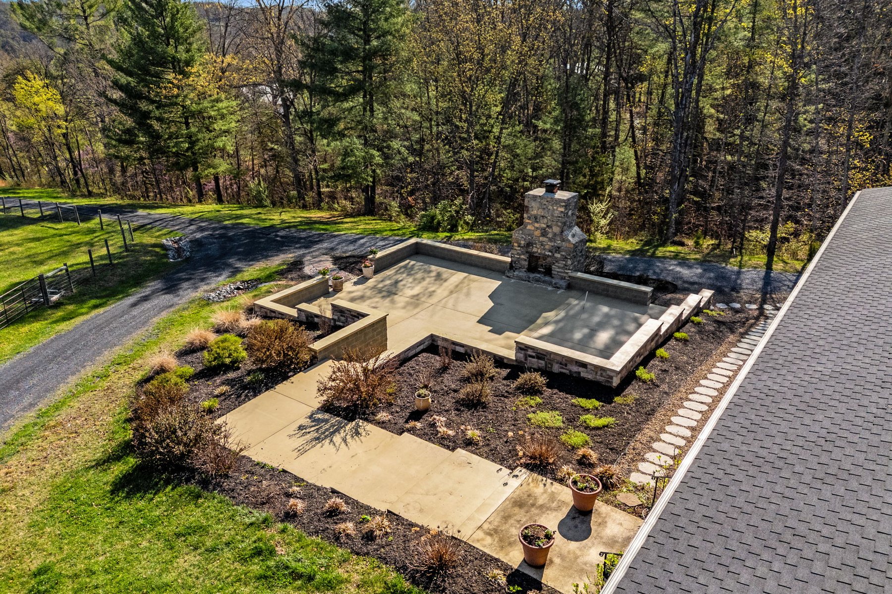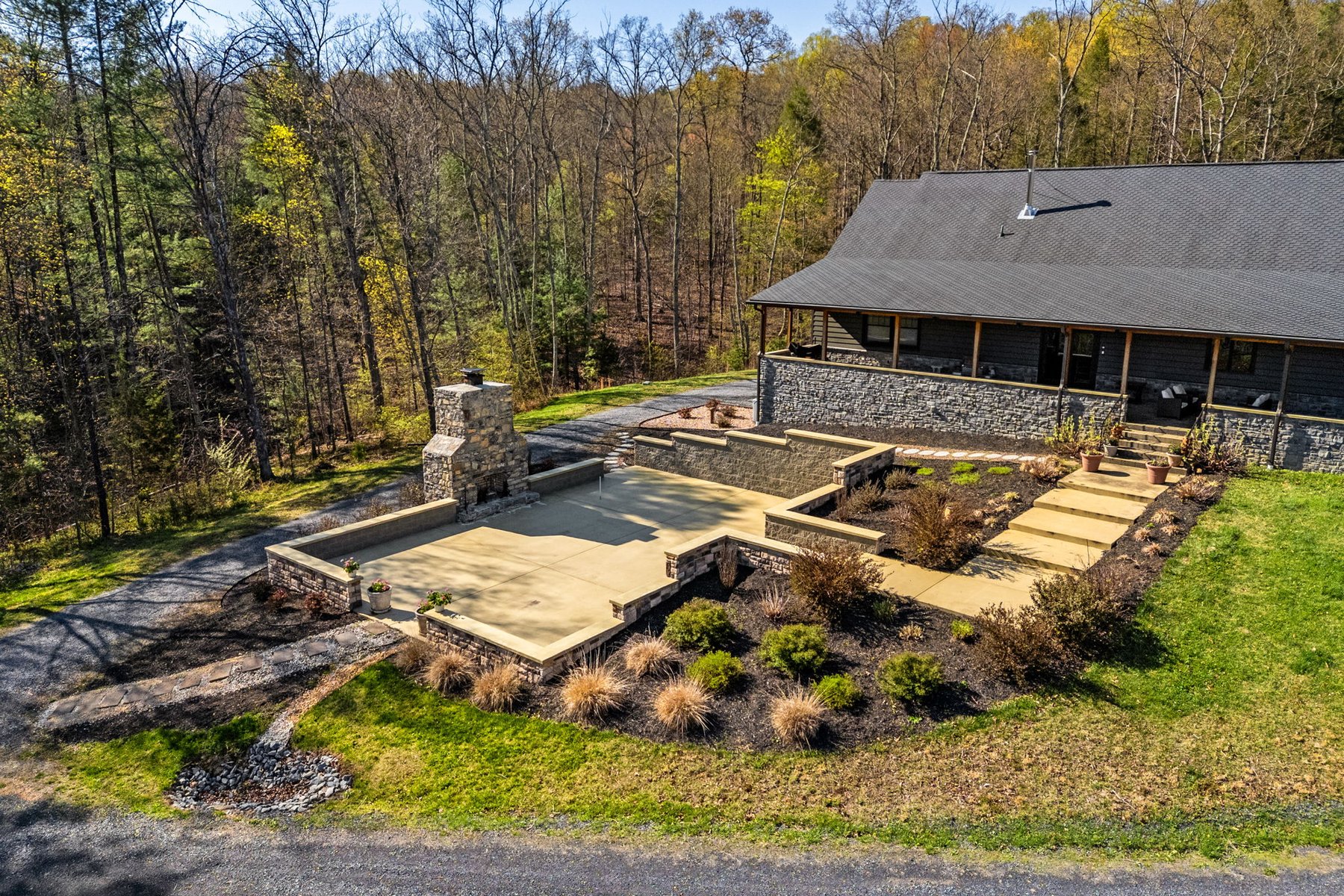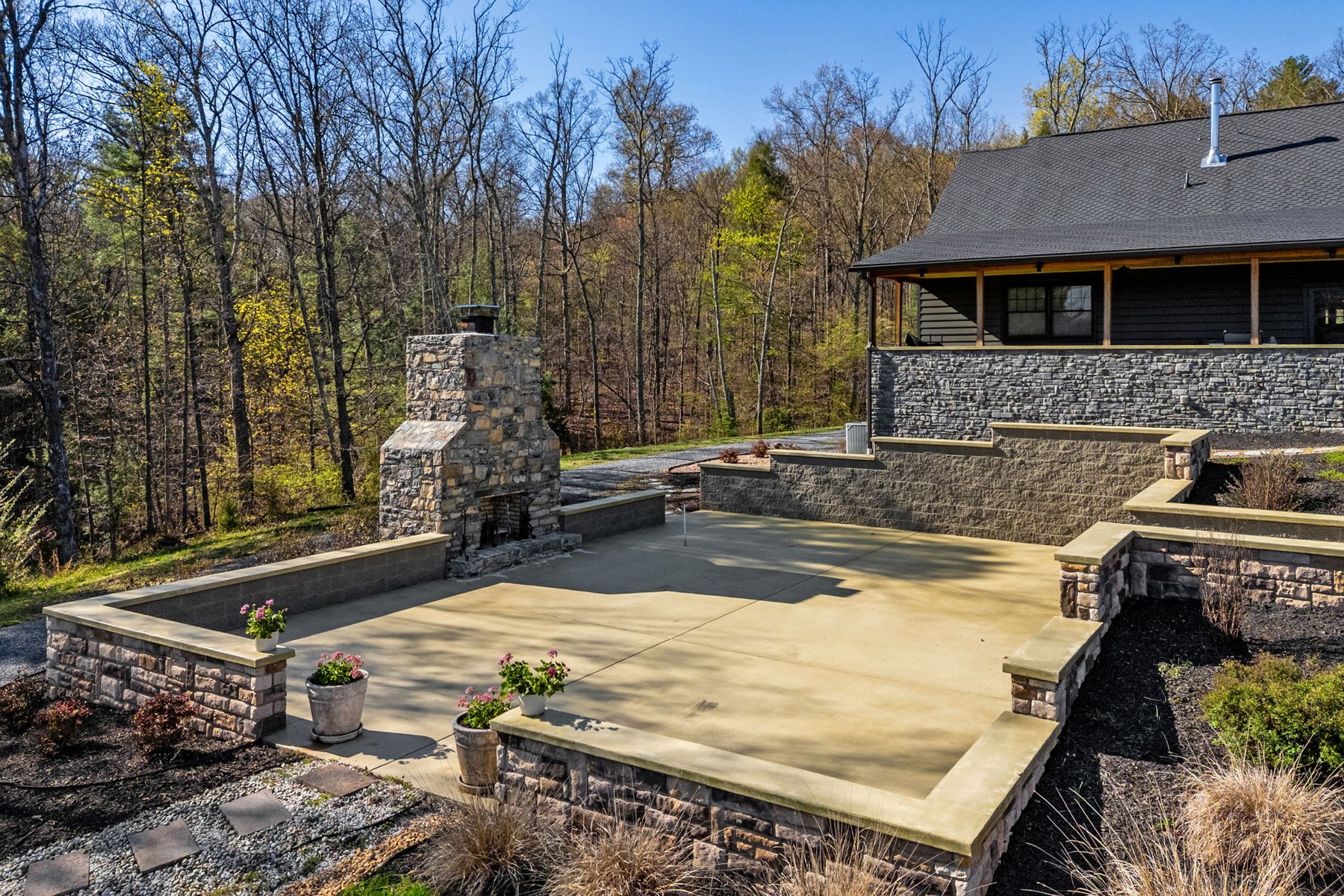 Just below the porch, a tiered outdoor entertaining terrace includes an expansive concrete patio, integrated stone seating, landscaped beds, and a substantial wood-burning masonry fireplace set against a private wooded backdrop.