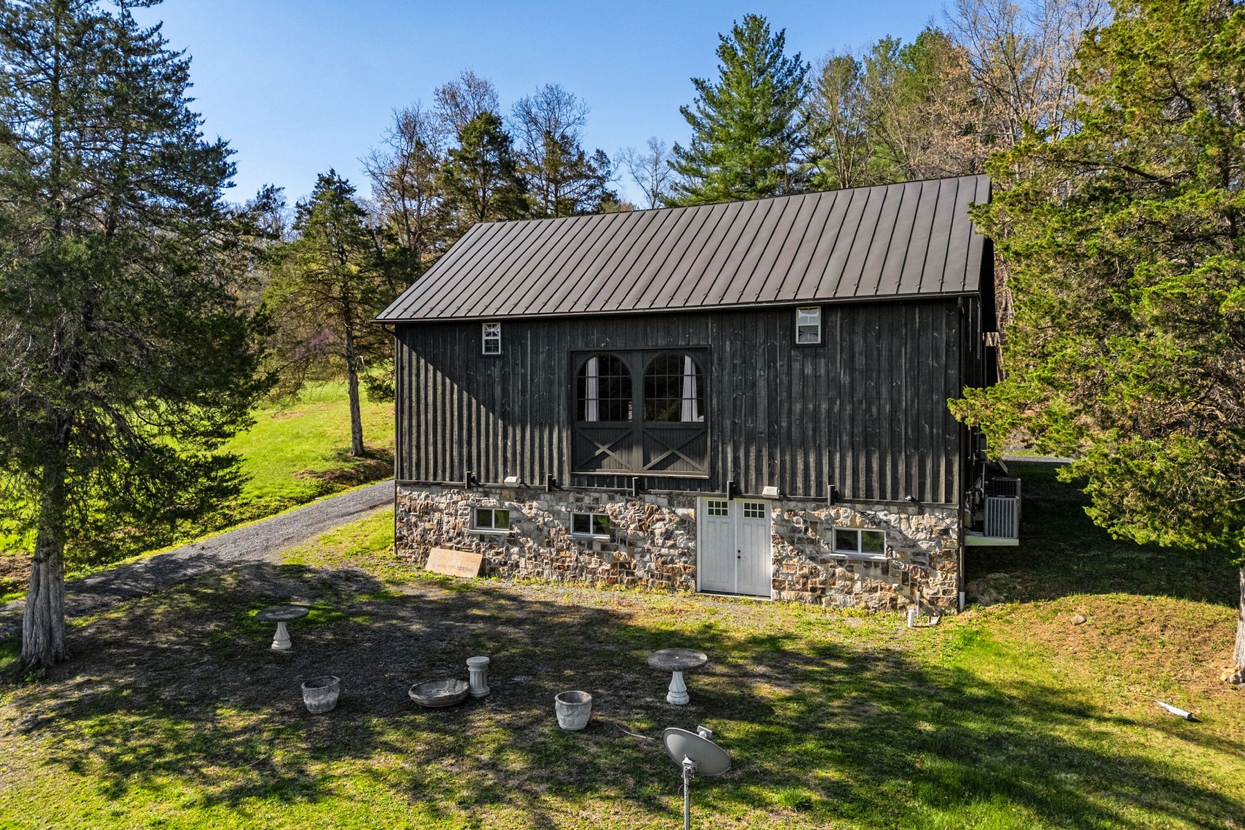 The circa 1830 bank barn, served by its own well and septic system, has been converted into guest accommodations featuring a kitchen, raised stage, two bedrooms, one full and one half bathroom, cathedral beamed ceilings, and a mezzanine gallery spanning much of the open interior.