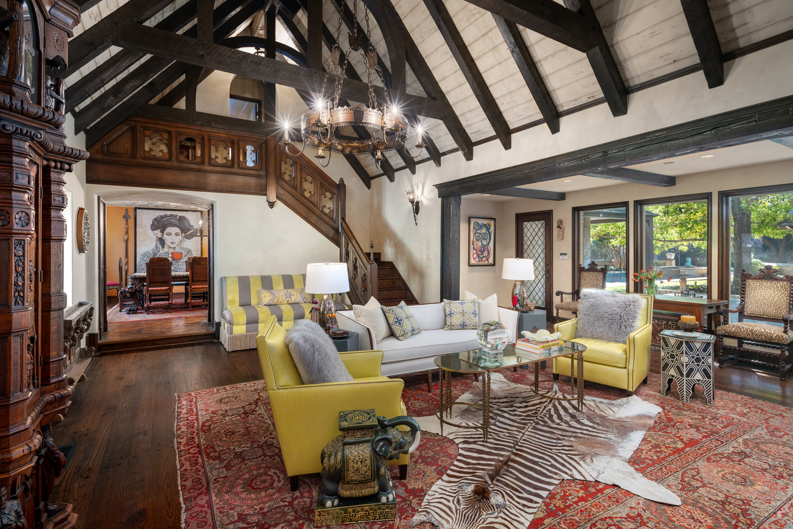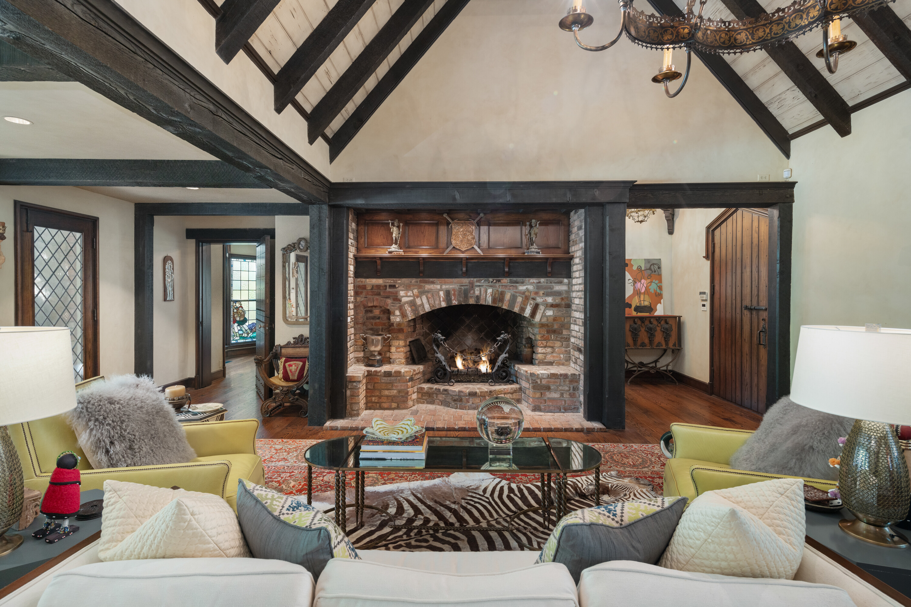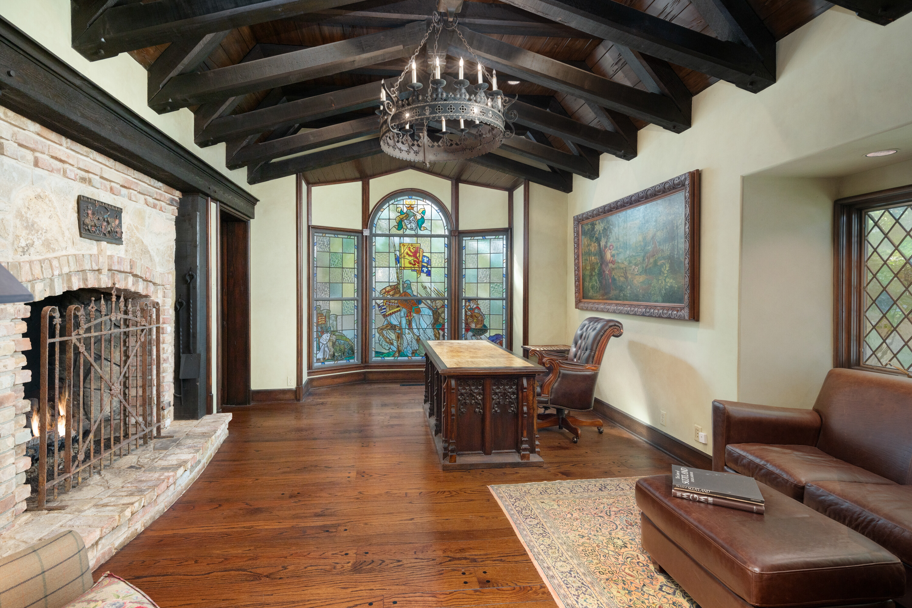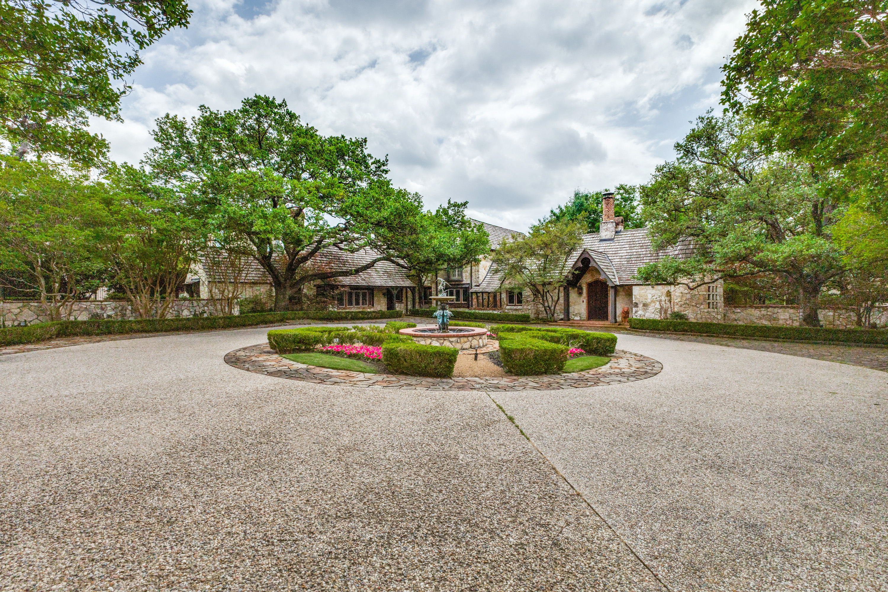 Welcome to 5106 Deloache, a Charles Dilbeck masterpiece! Dilbeck's careful approach to design resulted in warm and inviting homes. This beauty exemplifies his eclectic and visionary style. Upon arrival you are greeted by a gorgeous stone wall and custom-made security gate where this French Norman home presents itself. You will be overwhelmed by the stunning cathedral ceilings, rough-hewn log beams, gorgeous paneling, incredible oversized fireplaces, stained glass windows and all the nooks and crannies a Charles Dilbeck designed home offers. The property is as captivating as the home. This beautiful lot is 1.6 acres is canopied by abundance of trees, a koi pond, running river, cathedral like cabana with a massive fireplace, inviting pool, sport-pickle ball court, play yard, fire pit, gorgeous stone paved porches and bridges. The quarters above the oversized 3 car garage are an additional 1278 sqft, can be a great game room-office and guest house. Truly one-of-a-kind home sitting on the most beautiful lot. Don't miss this opportunity to own one of the few true architecturally significant homes in Dallas