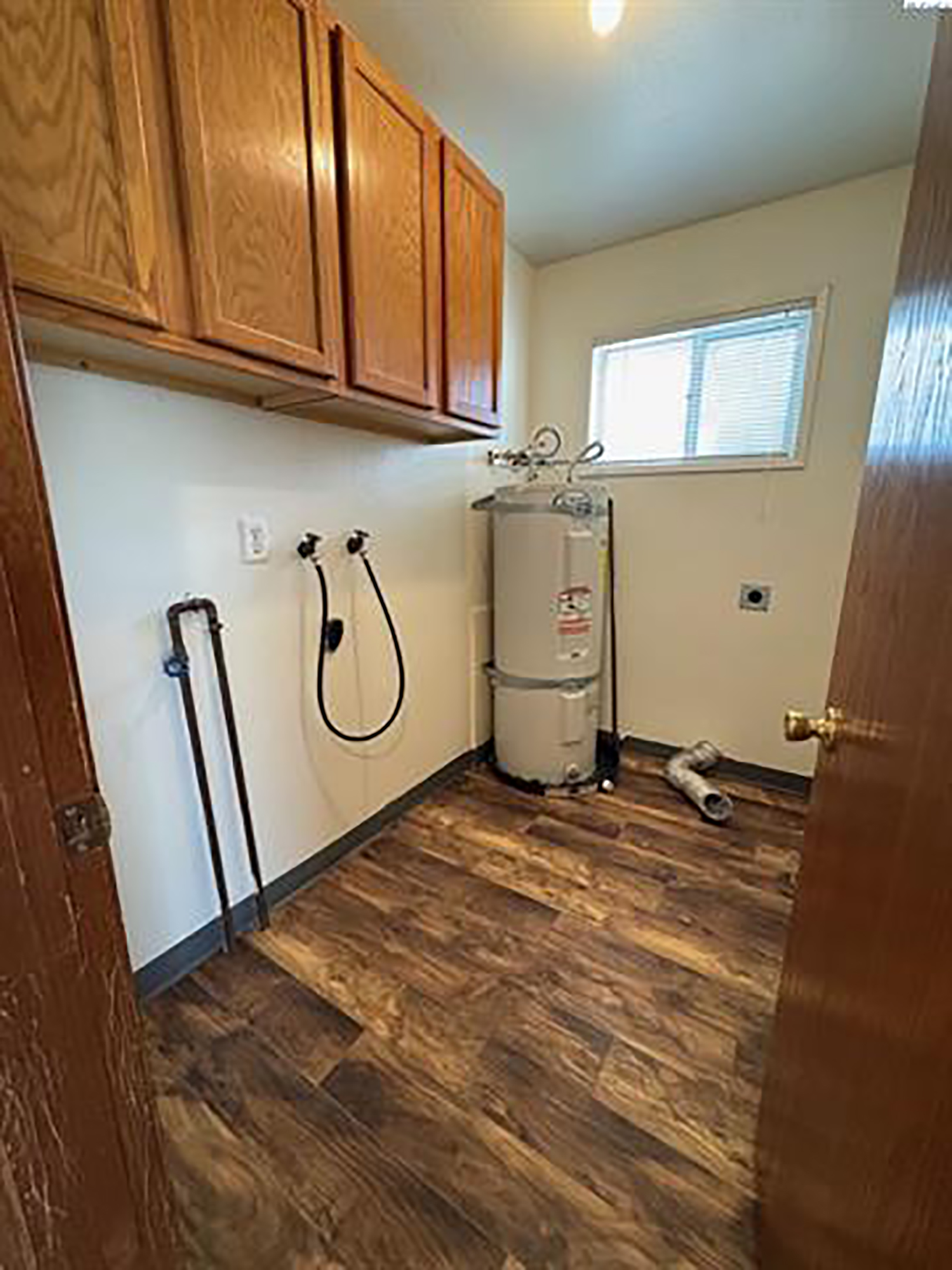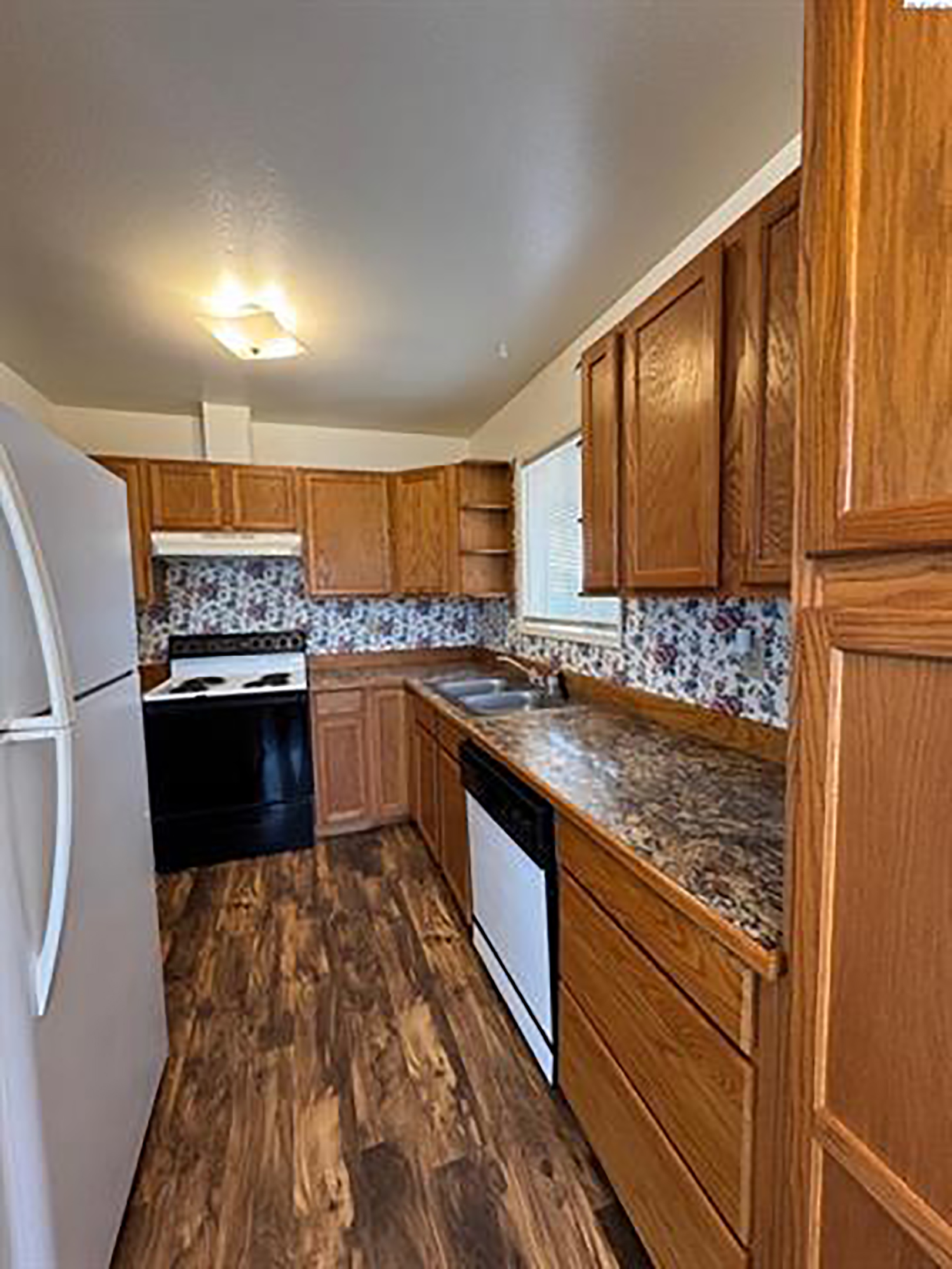 Move in condition -- 3 BR, 1 Bath with recent improvements including: New interior/exterior paint and new flooring throughout. Laminate floors in the common areas and carpet in the bedrooms. Notice the nice kitchen cabinets and stained wood doors and trim. There are two living areas; one at the front door and a garage area that has been nicely converted to a family room. The 3 bedrooms have spacious closets. Lots of off-street parking, the lot is partially fenced. Located in a nice neighborhood with friendly neighbors and easy access to everything! It's a don't miss property!