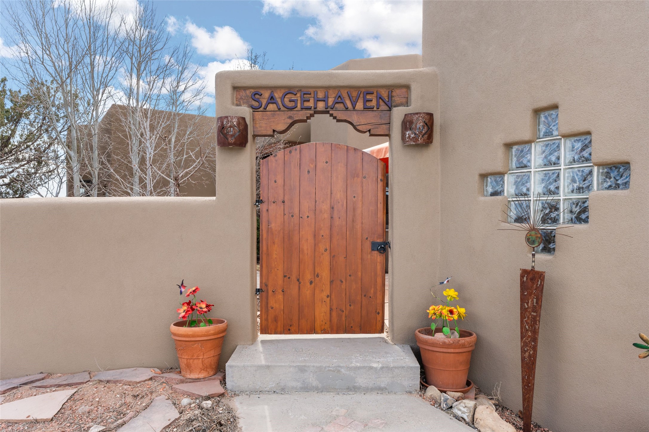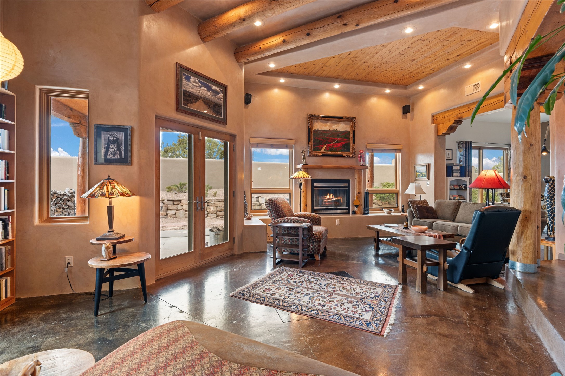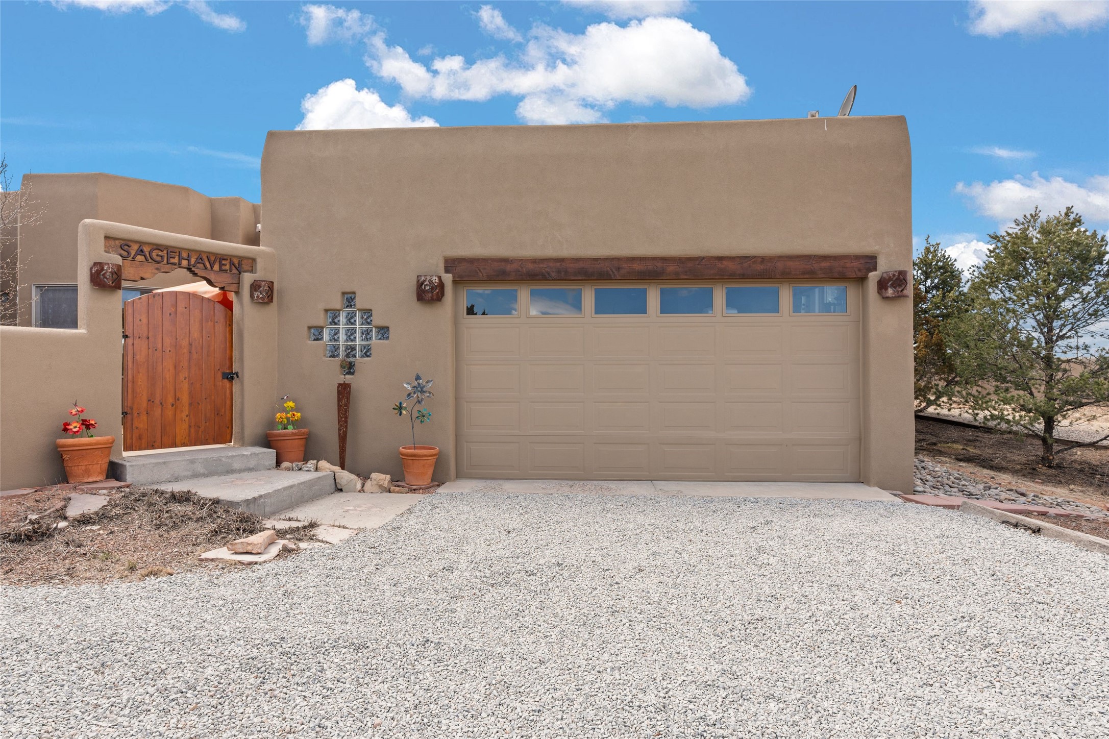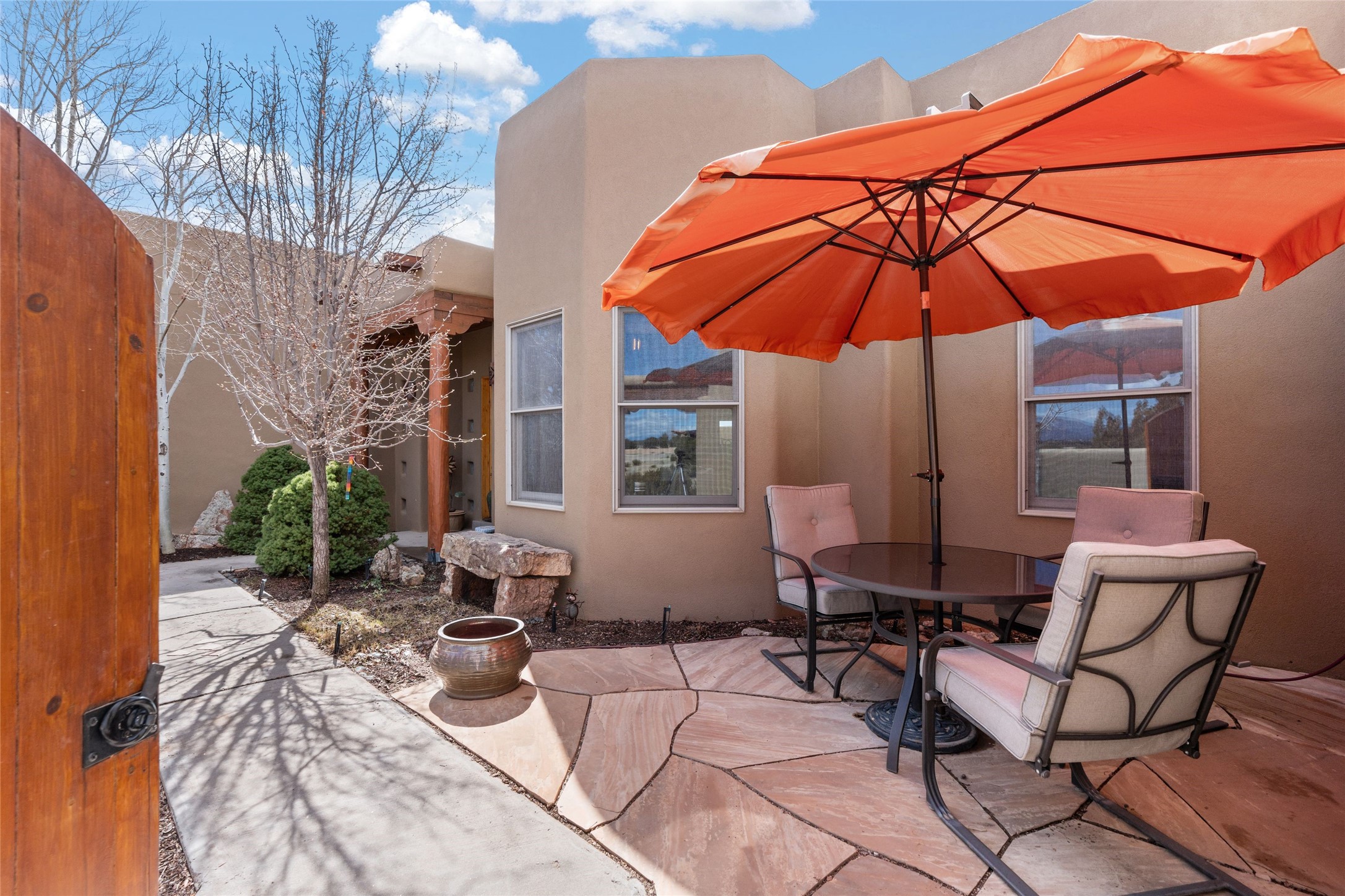 Beautifully maintained and well loved, this 2,460+/- sq ft 3 bedroom home sits on 2.5 acres with great light, gorgeous Sangre de Cristo views and is handy to walking and biking trails which run behind the back patio and go all the way to BLM land. Entering through an enclosed front patio to the entry hall, the house opens to a lovely open main living area with high wood/viga ceilings, wood burning fireplace and access to the private, walled back patio facing South and West for sunny enjoyment even on a cool day. The dining room also opens to a covered back patio for grilling and al fresco dining; and both living areas are open to a most wonderful kitchen. The kitchen has plenty of storage, granite counters, gas stove and a delightful eating nook to enjoy the morning sun and Sangre views. The kitchen also has a fabulous bar/counter area so that the cook can hang with friends and family while preparing a meal – no crowded kitchen here! Perfect bedroom separation with the primary enjoying a fireplace, walk in California closet, access to the walled patio with cool inflatable hot tub and an ensuite bath with jacuzzi tub, nice sized shower and double sinks. The two guest rooms are on the other side of the home, and share a good-sized bath, also with two sinks. Through the laundry room is a bonus room with a new mini split for heating and cooling and a separate entry – this would make a great studio, home office, game room or easy casita conversion as it is stubbed in for kitchenette and or bath. For easy direct access with groceries is a two-car garage, with an attached storage room suitable for storing multiple bikes and outdoor equipment. New stucco in 2023, new roof in 2019 with transferable warranty, and a radon mitigation system in place. There is an entirely new domestic water supply plumbing installed in June of 2025 with five year warranty; along with new 4 ton package for a forced air heating and AC system. A Moen Flo smart water monitoring, leak detection and water shut off system installed also in June of 2025.