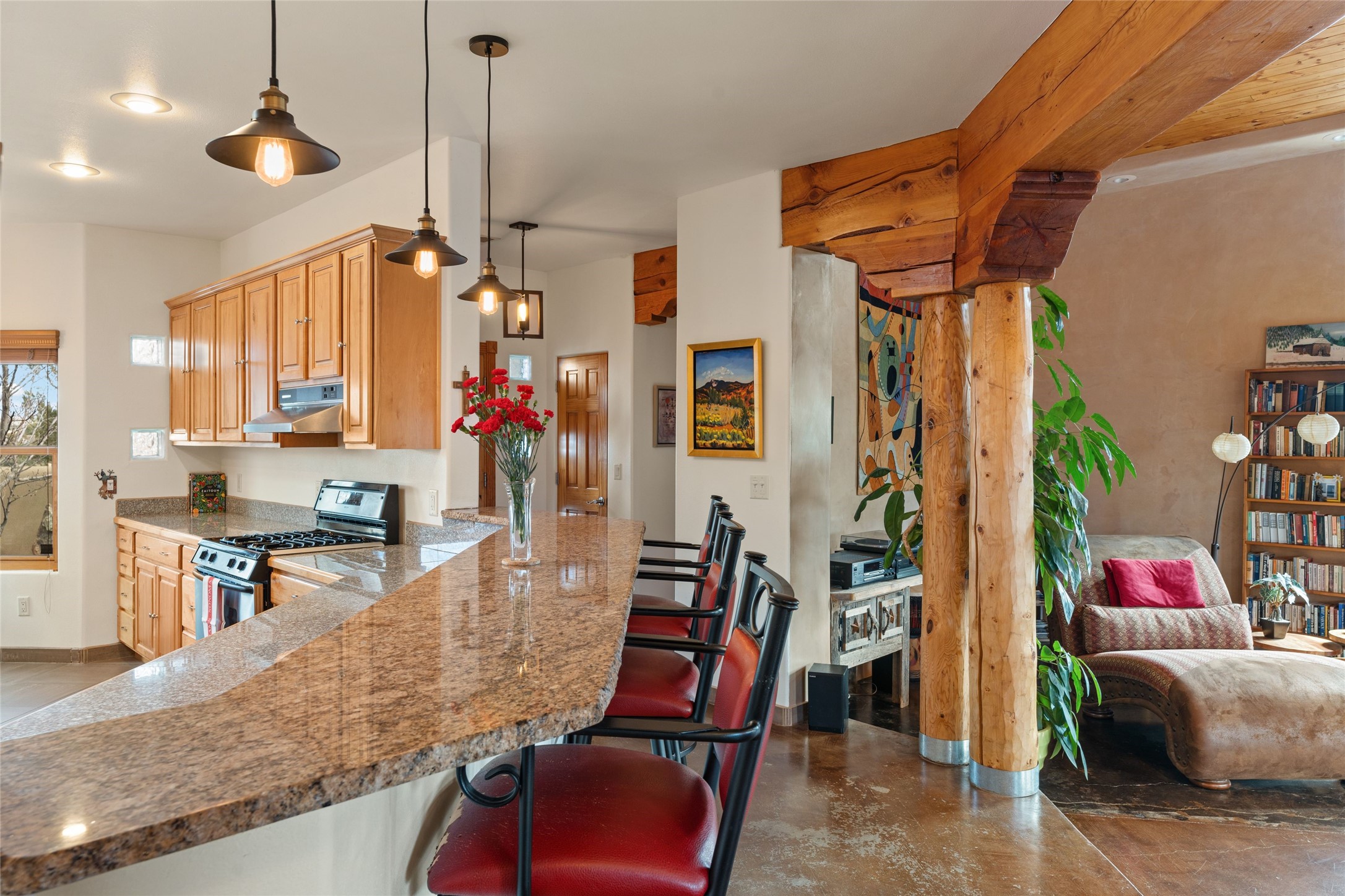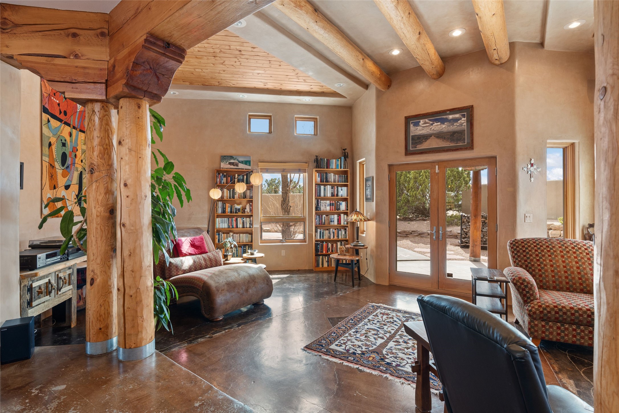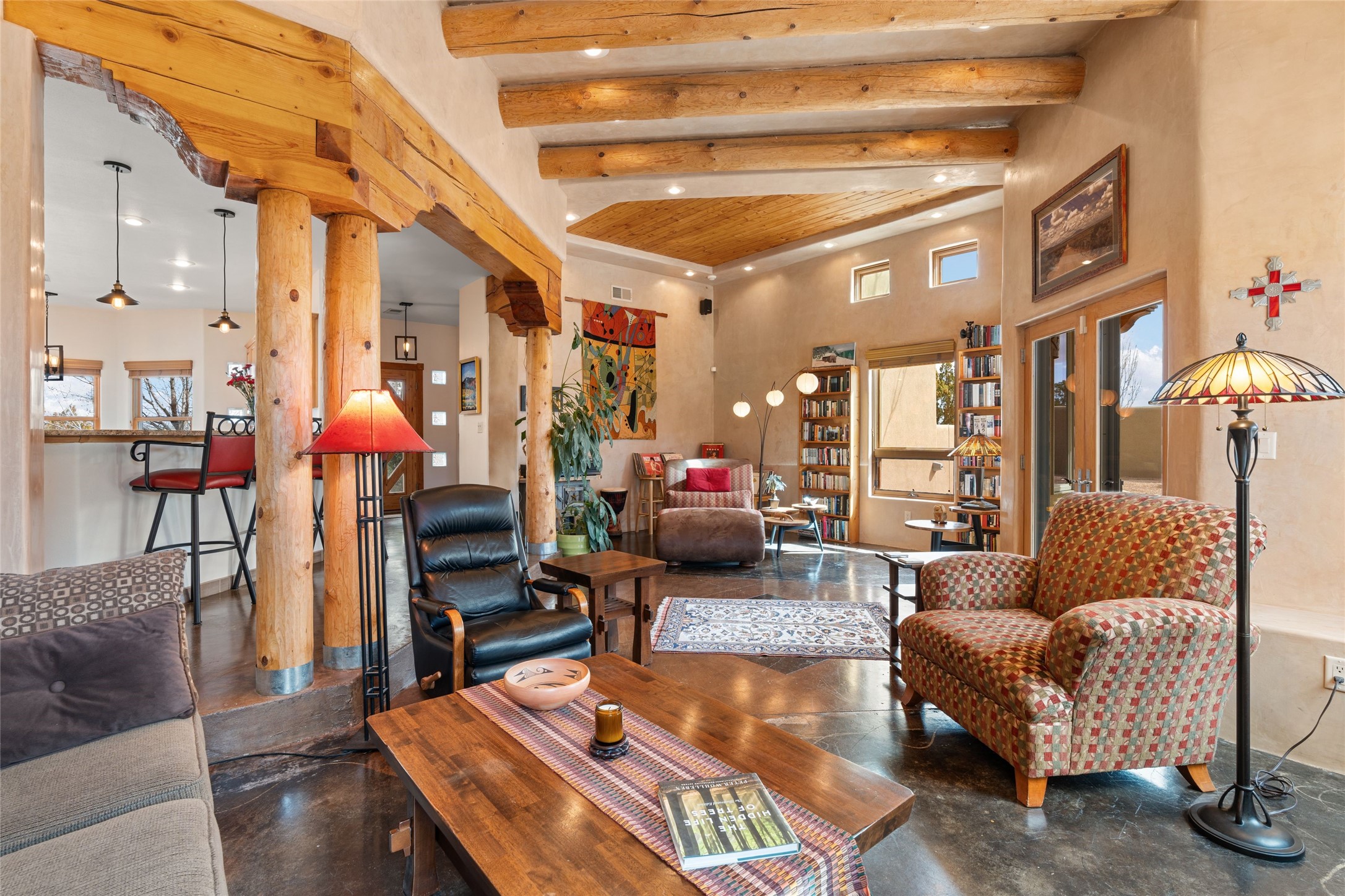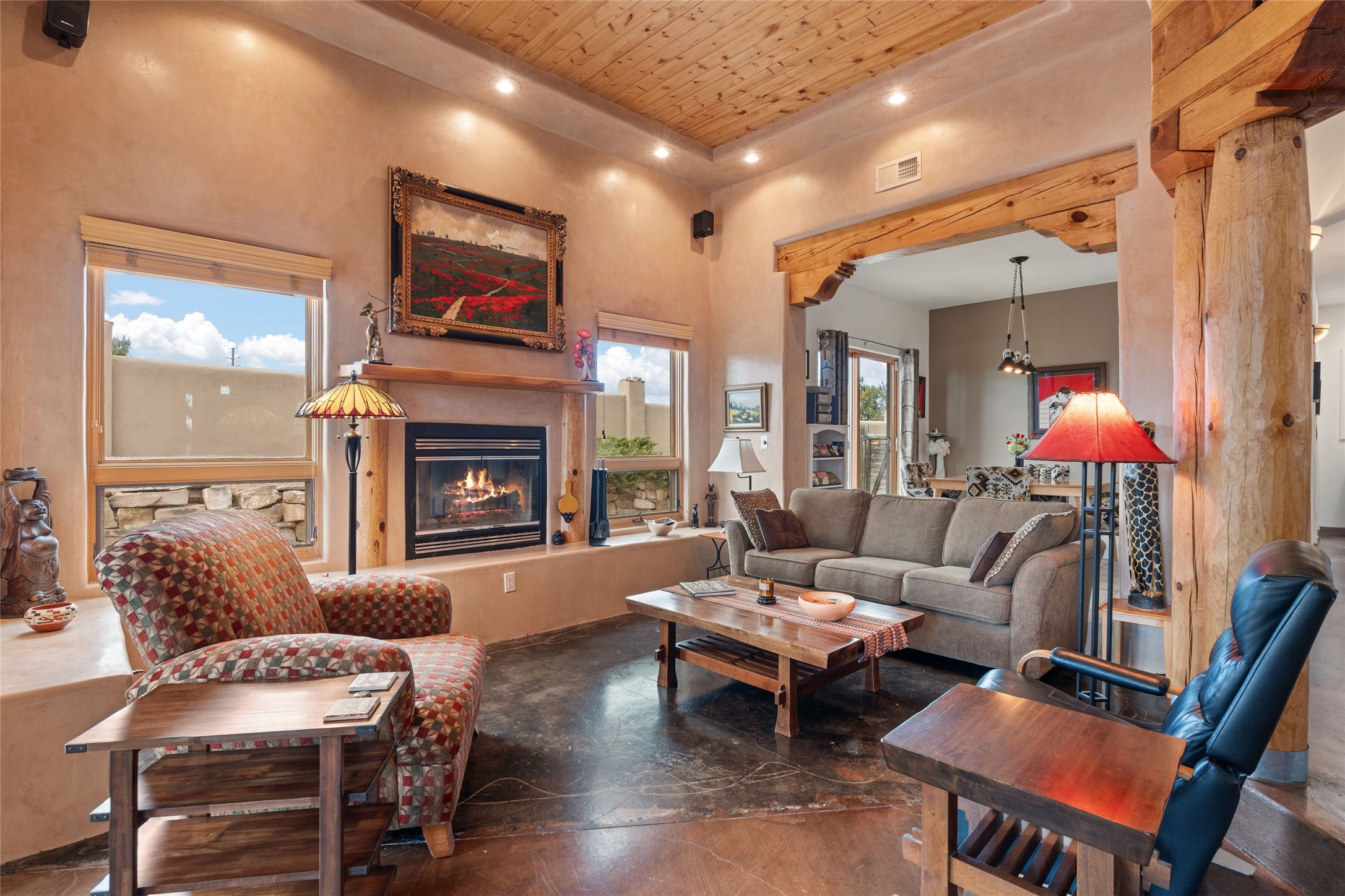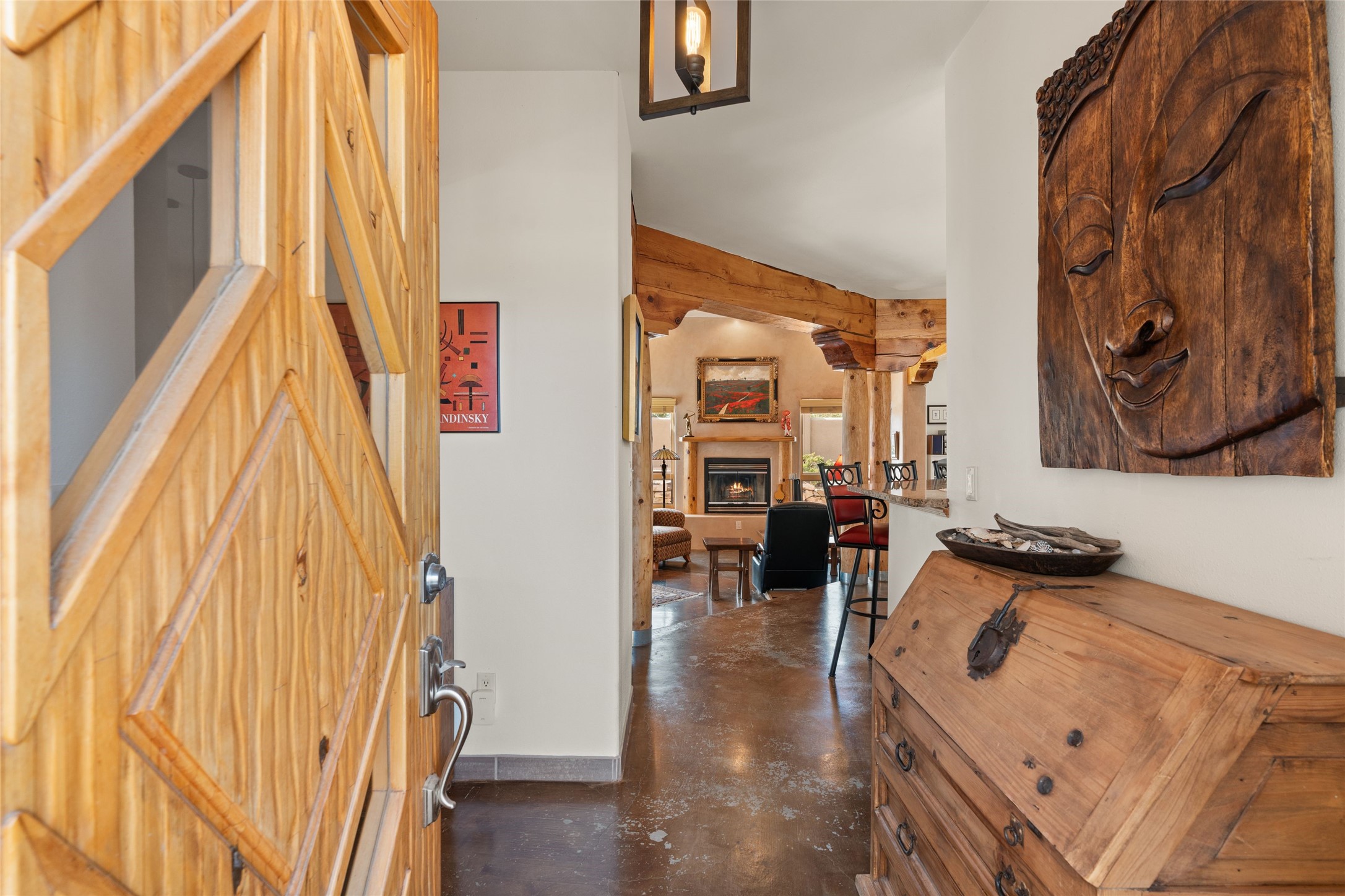 Beautifully maintained and well loved, this 2,460+/- sq ft 3 bedroom home sits on 2.5 acres with great light, gorgeous Sangre de Cristo views and is handy to walking and biking trails which run behind the back patio and go all the way to BLM land. Entering through an enclosed front patio to the entry hall, the house opens to a lovely open main living area with high wood/viga ceilings, wood burning fireplace and access to the private, walled back patio facing South and West for sunny enjoyment even on a cool day. The dining room also opens to a covered back patio for grilling and al fresco dining; and both living areas are open to a most wonderful kitchen. The kitchen has plenty of storage, granite counters, gas stove and a delightful eating nook to enjoy the morning sun and Sangre views. The kitchen also has a fabulous bar/counter area so that the cook can hang with friends and family while preparing a meal – no crowded kitchen here! Perfect bedroom separation with the primary enjoying a fireplace, walk in California closet, access to the walled patio with cool inflatable hot tub and an ensuite bath with jacuzzi tub, nice sized shower and double sinks. The two guest rooms are on the other side of the home, and share a good-sized bath, also with two sinks. Through the laundry room is a bonus room with a new mini split for heating and cooling and a separate entry – this would make a great studio, home office, game room or easy casita conversion as it is stubbed in for kitchenette and or bath. For easy direct access with groceries is a two-car garage, with an attached storage room suitable for storing multiple bikes and outdoor equipment. New stucco in 2023, new roof in 2019 with transferable warranty, and a radon mitigation system in place. There is an entirely new domestic water supply plumbing installed in June of 2025 with five year warranty; along with new 4 ton package for a forced air heating and AC system. A Moen Flo smart water monitoring, leak detection and water shut off system installed also in June of 2025.