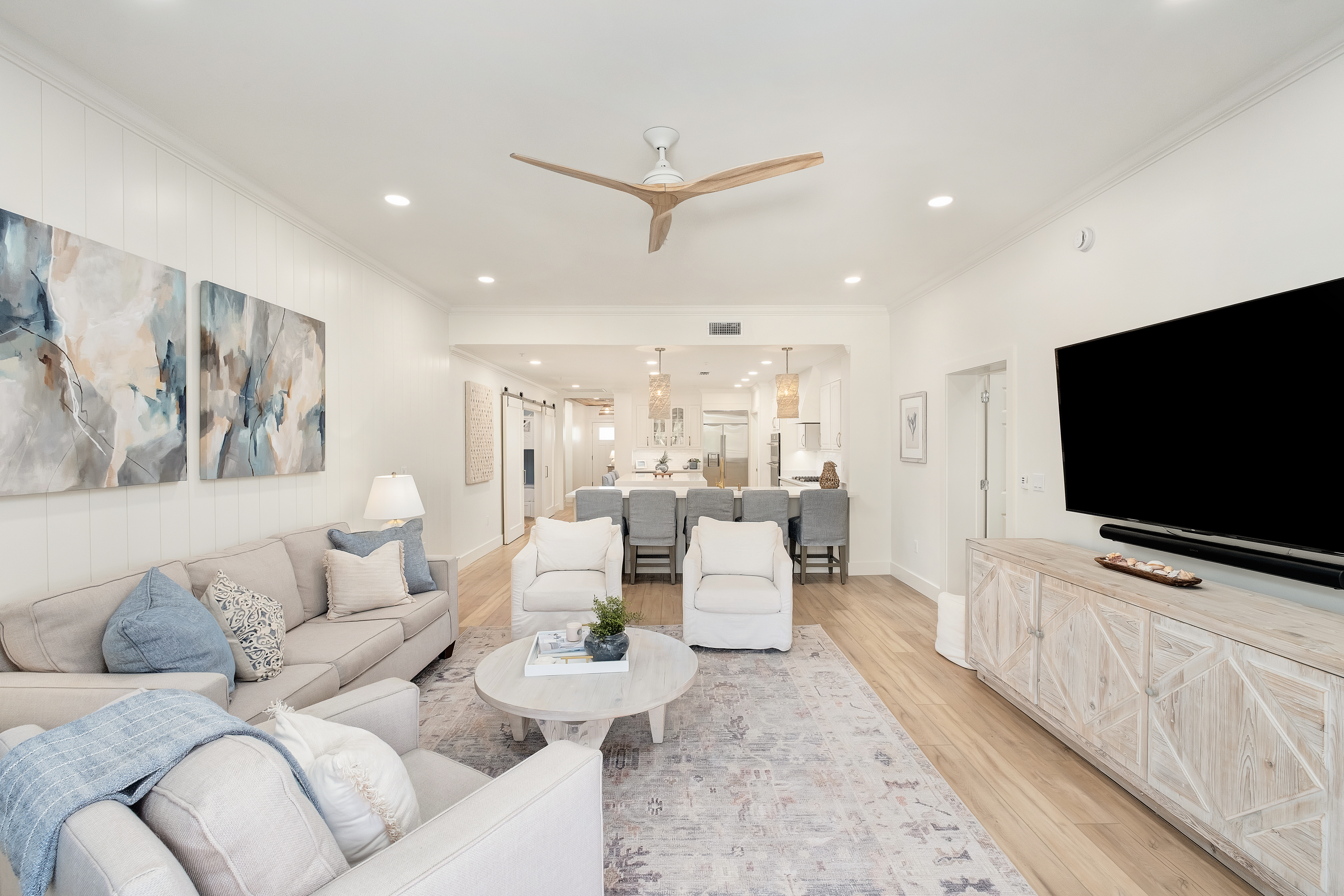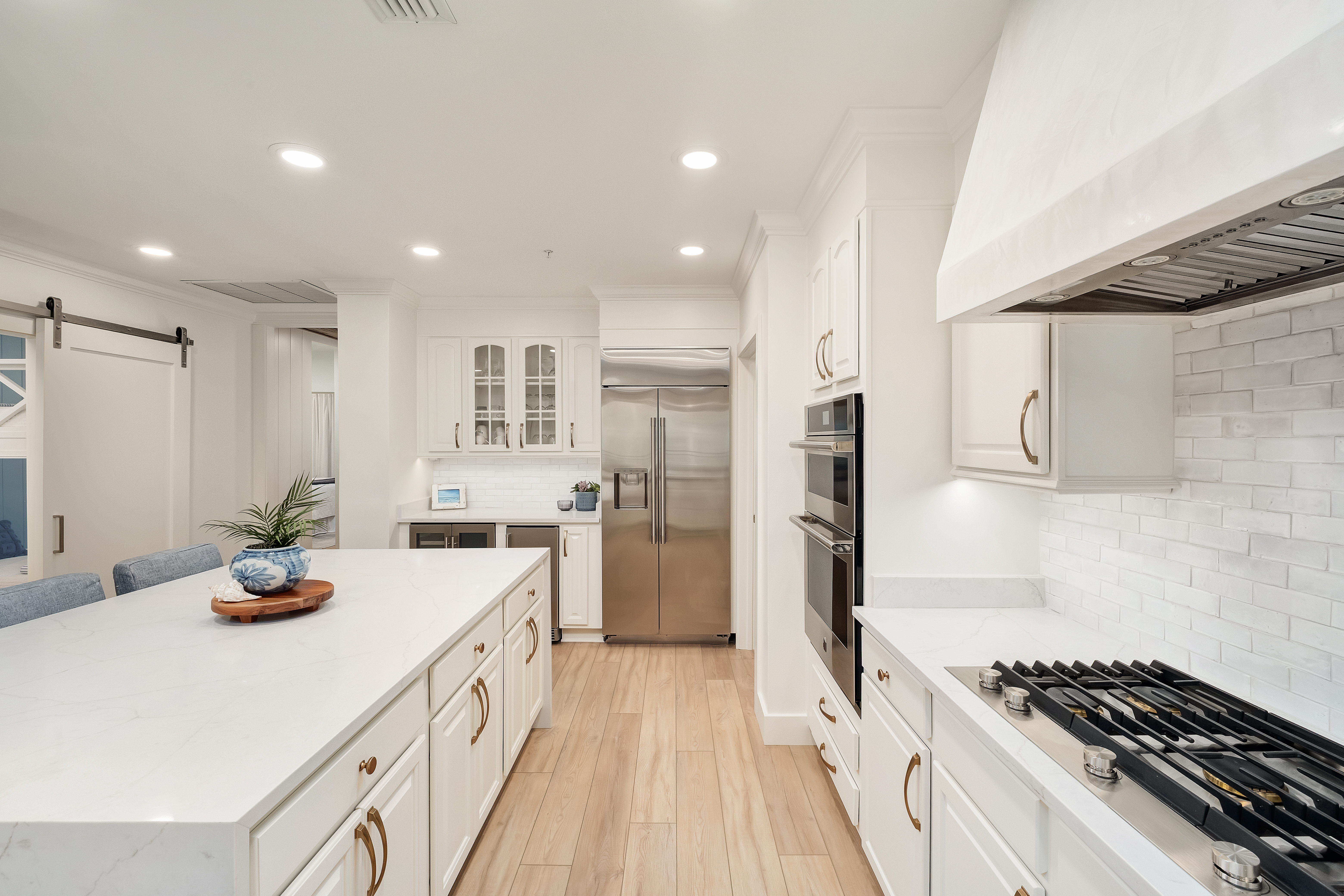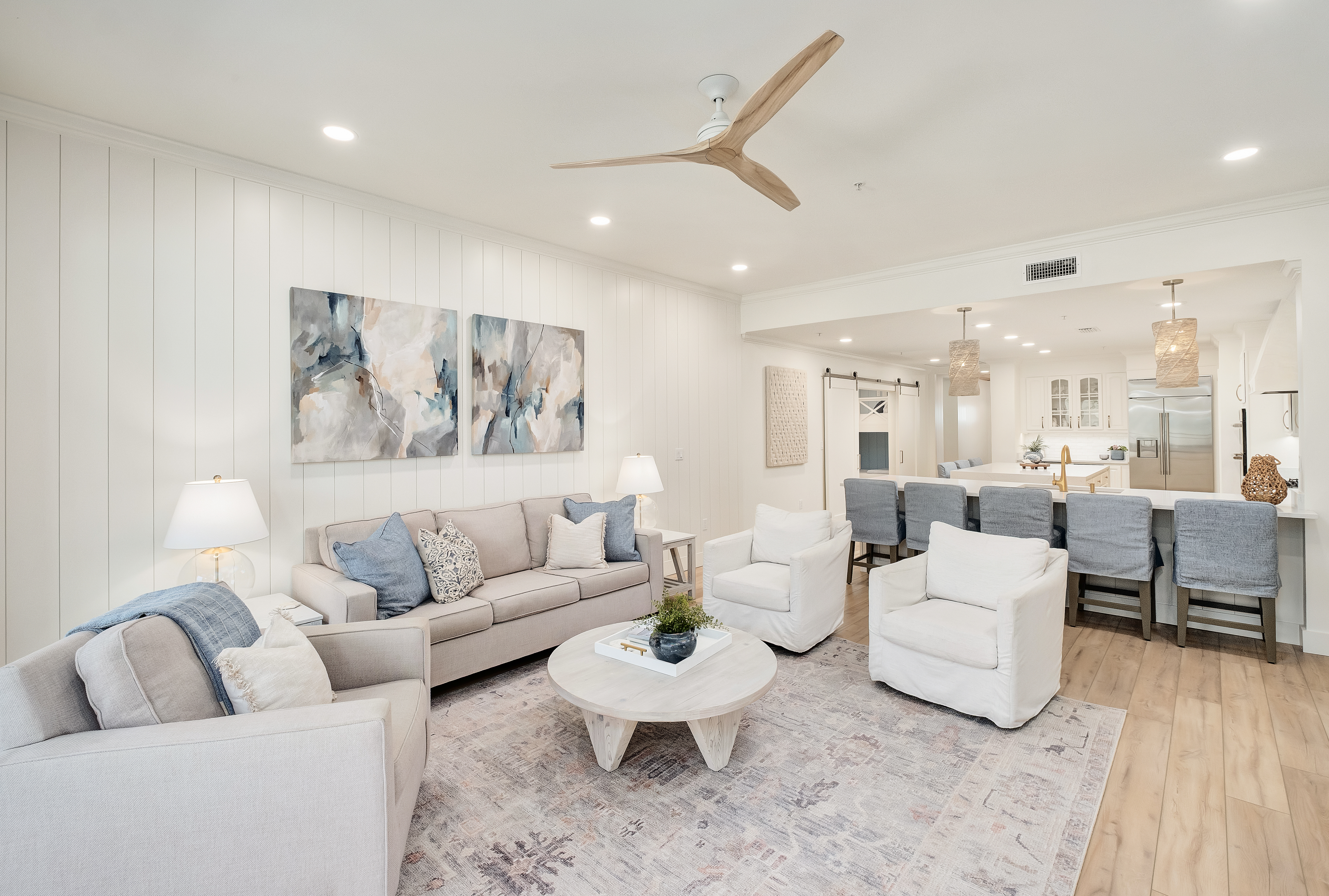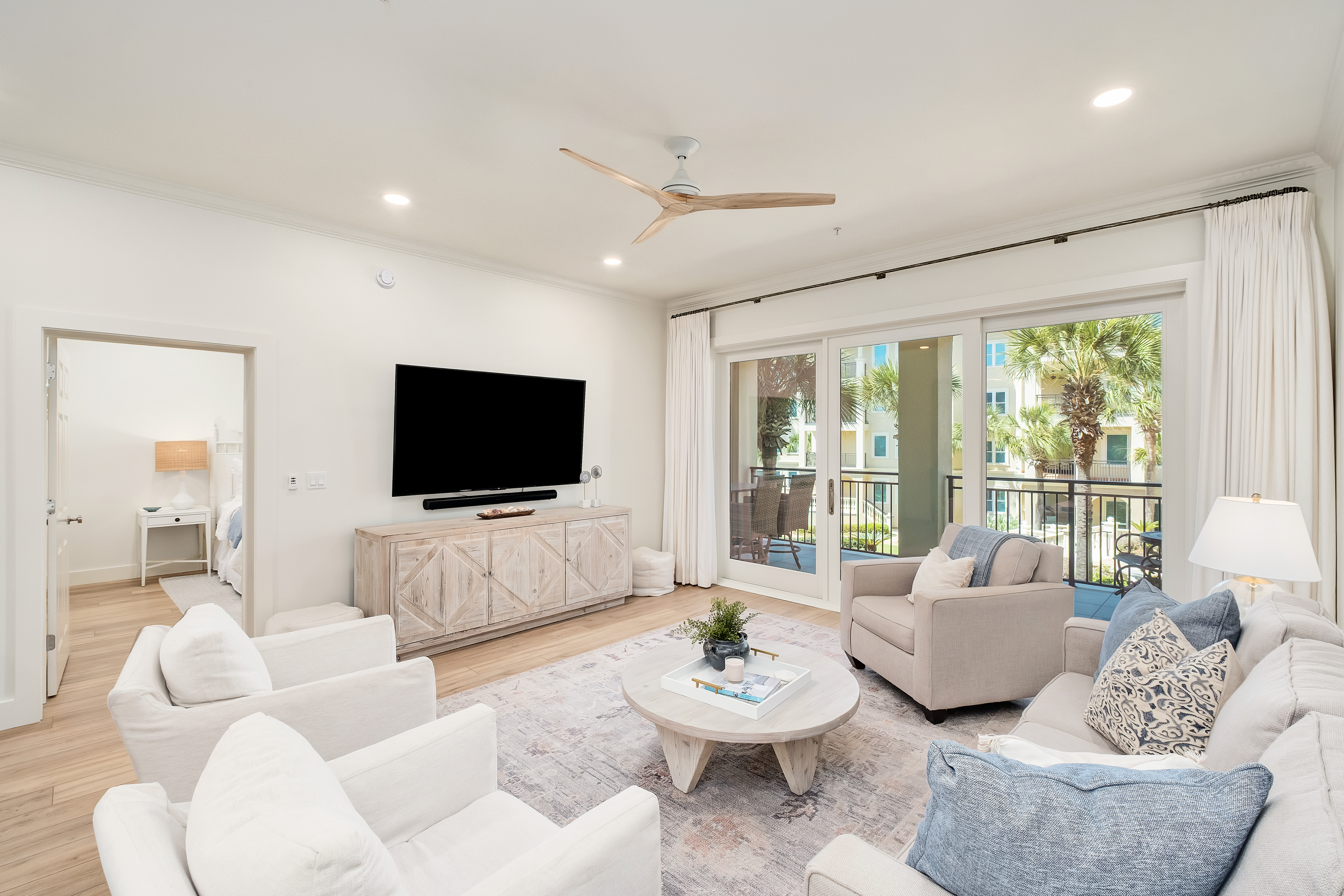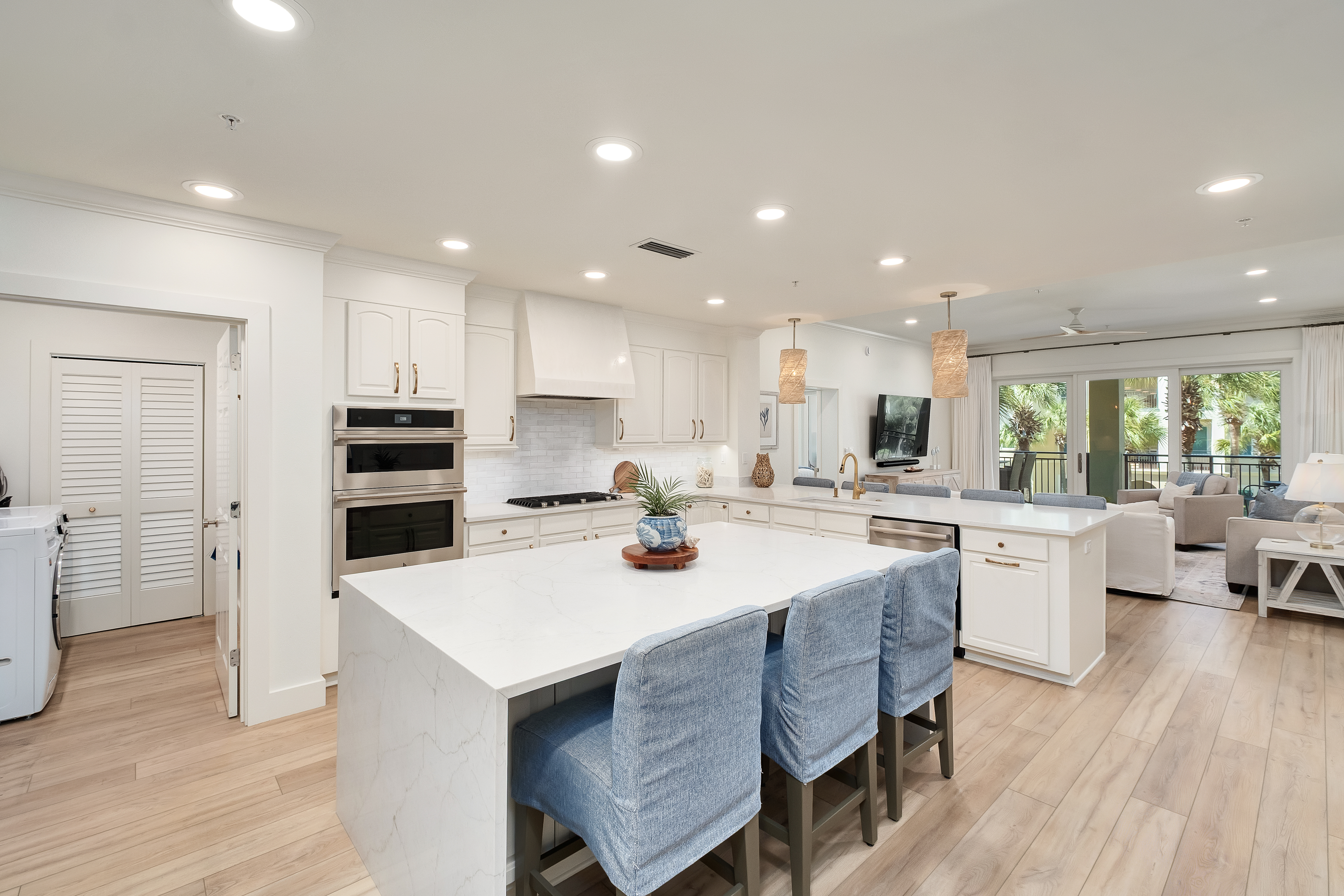 Behind the gates of Bella Vita, where Mediterranean architecture meets lush courtyards and tranquil fountains, this fully renovated three-bedroom, three-bath residence with a custom bunk room offers a quieter, more private take on coastal living. Positioned within a rental restricted building, the setting feels intentionally composed — less transient, more personal — with views that stretch across manicured grounds, resort-style pools, and the gulf beyond. Completed in May 2024, the expansive renovation reimagines the interiors with a clean, cohesive palette and thoughtful detailing throughout. New COREtec flooring runs seamlessly underfoot, complemented by fresh paint, updated lighting, and new plumbing fixtures. Architectural accents, such as cypress-wood ceilings in the foyer and vertical shiplap, introduce texture and warmth, while custom closets and tailored drapery elevate everyday function. The kitchen has been entirely refreshed with newly finished cabinetry, updated hardware, new countertops and backsplash, and a custom Venetian plaster range hood that anchors the space with subtle artistry. An added island enhances both storage and seating, while all appliances have been replaced, creating a kitchen that feels as polished as it is practical. The primary suite offers a calm retreat with direct balcony access and a redesigned bath featuring a fully tiled wet area that combines the soaking tub and shower, along with updated cabinetry and finishes. Guest accommodations follow suit with new cabinetry, countertops, and tiled showers, ensuring a consistent level of finish throughout. A custom bunk room — thoughtfully added during the renovation — introduces flexibility without compromising style, featuring built-in beds and sliding barn doors. Additional enhancements include a mudroom-style beach entry with bench seating and storage, updated laundry room with cabinetry and decorative tile, and new outdoor ceiling fans that extend comfort onto the balcony. The entire complex has also benefited from new windows and doors, reinforcing both aesthetics and efficiency. Offered fully furnished, the residence is move-in ready, allowing for an immediate transition into a more relaxed rhythm of living. Bella Vita’s amenities — including private beach access, two pools, a fitness center, covered owner parking, and additional storage for bikes and paddleboards — complete the experience, all within a gated setting designed for ease and enjoyment. This is a residence that feels considered at every turn — refined in finish, effortless in function, and quietly set apart.