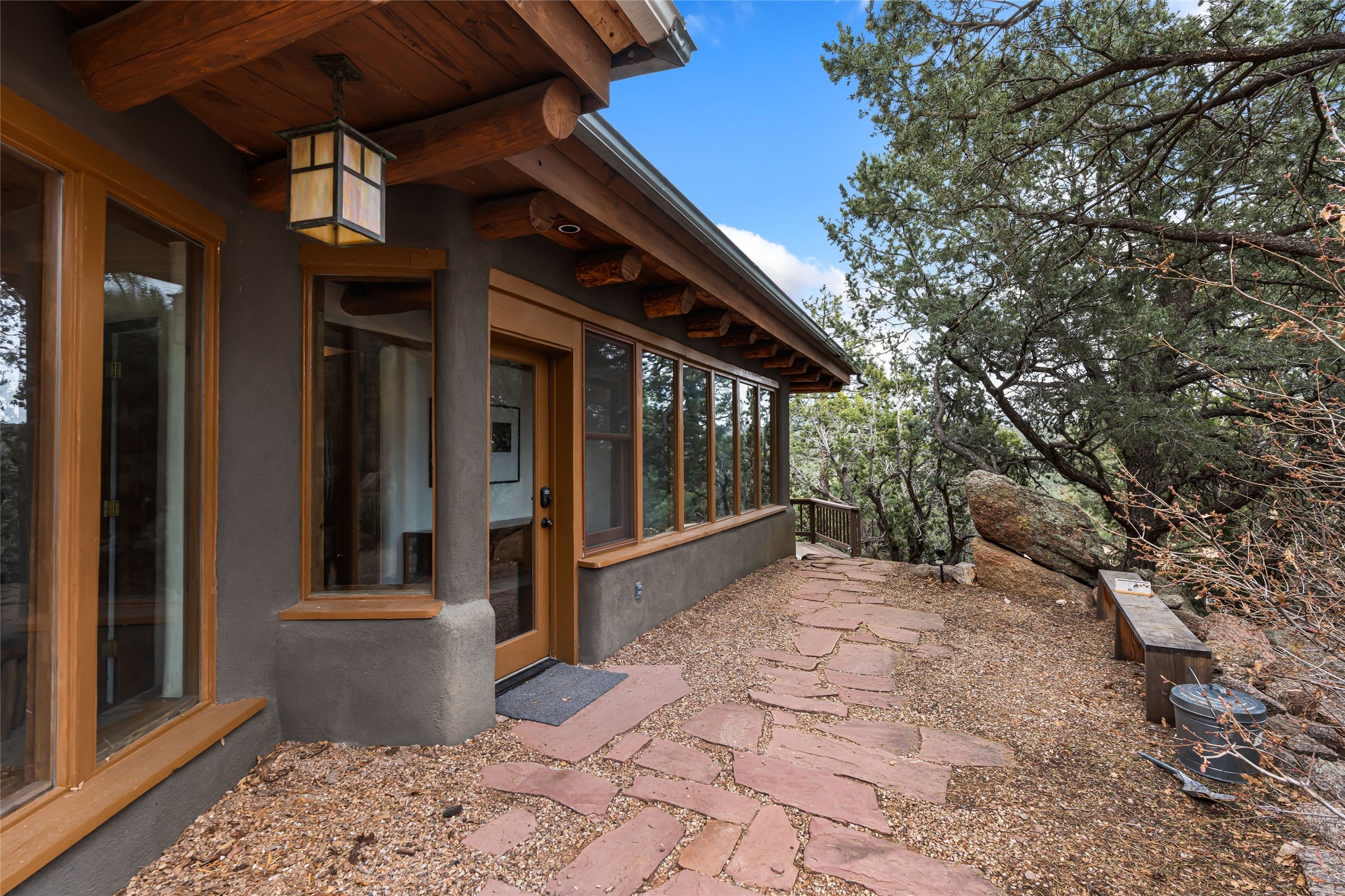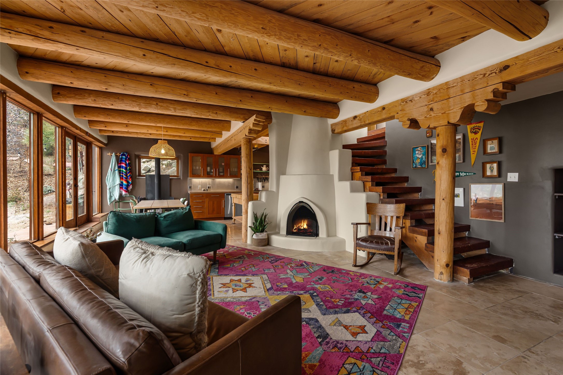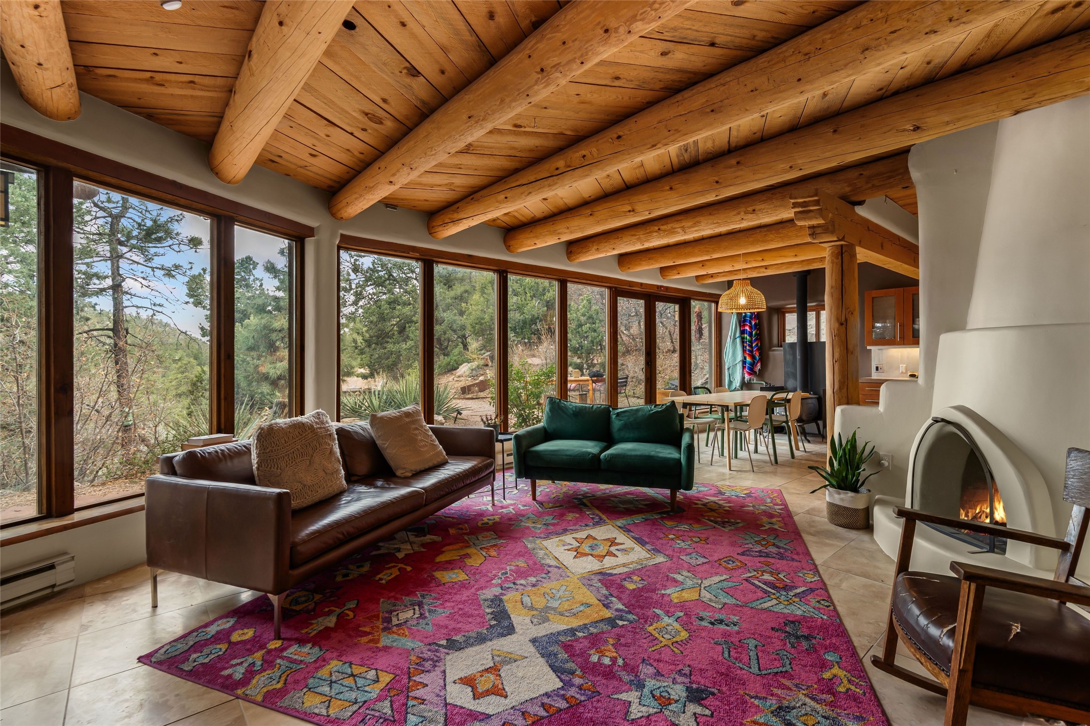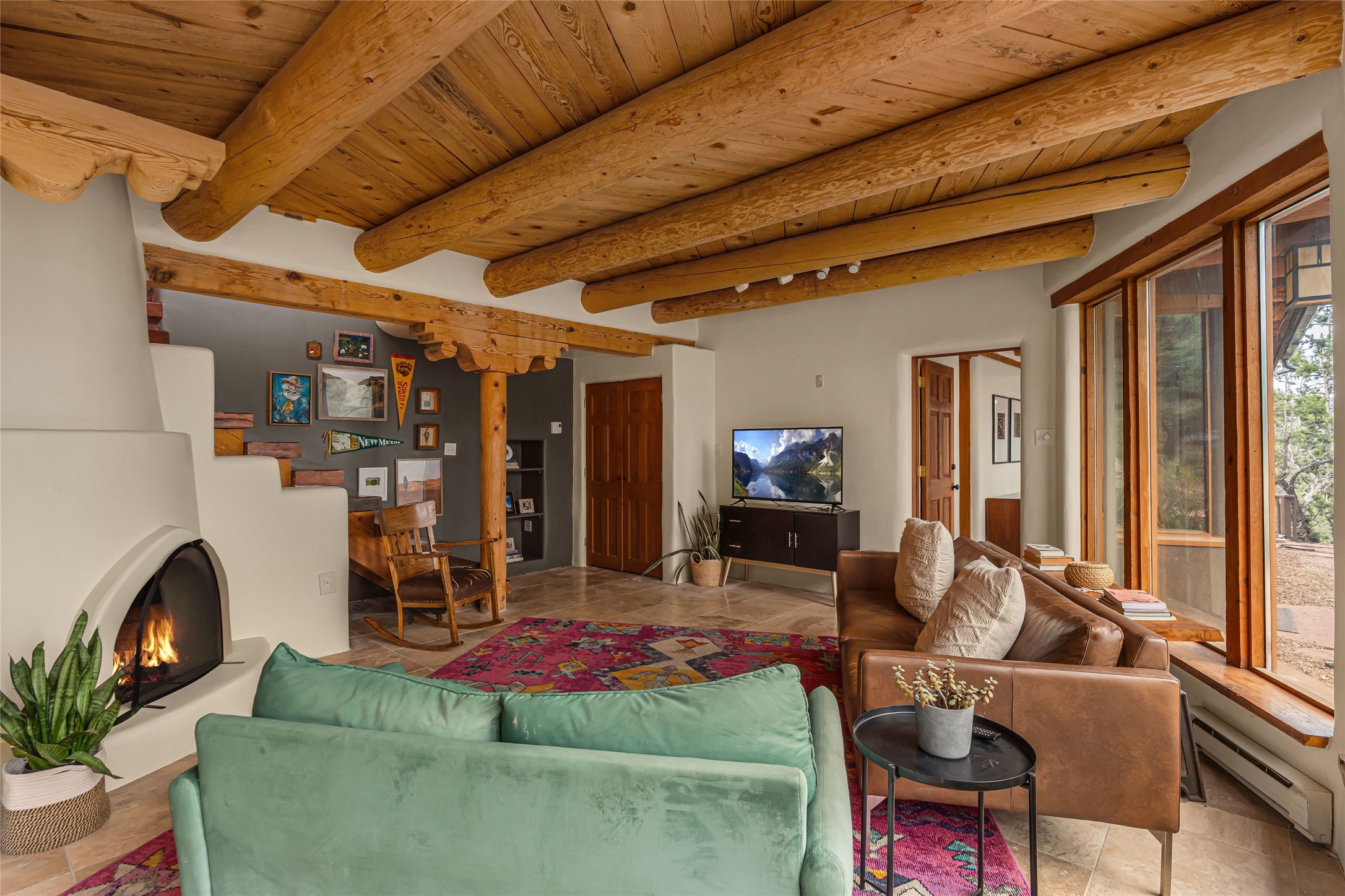 Tucked into the quiet beauty of the Santa Fe woods, this inviting property blends privacy, nature, and classic Southwest character—all within an easy 15 minute drive to the Plaza. The passive solar design fills the home with natural light, highlighting timeless regional touches including vigas, tile and wood floors, and a traditional kiva fireplace. The main house features an updated kitchen and 3 bedrooms plus a den—a flexible space that could easily serve as a fourth bedroom. One wall is a striking natural living stone feature, adding texture and a sense of place you won’t find anywhere else. Large windows frame views of the surrounding hills and forest, creating a peaceful backdrop throughout the home. Step outside to a fabulous elevated deck, where a hot tub sits beneath the stars—an unforgettable spot for quiet evenings or relaxed gatherings. The gated community offers direct access to hiking trails, making it easy to enjoy the landscape right from your doorstep. The detached guest house is a gem of its own, with two levels, a separate bedroom, and a private patio—perfect for visitors, extended stays, or creative studio space. This is a rare opportunity to enjoy the tranquility of the woods with the convenience of Santa Fe living, wrapped in authentic Southwestern charm.